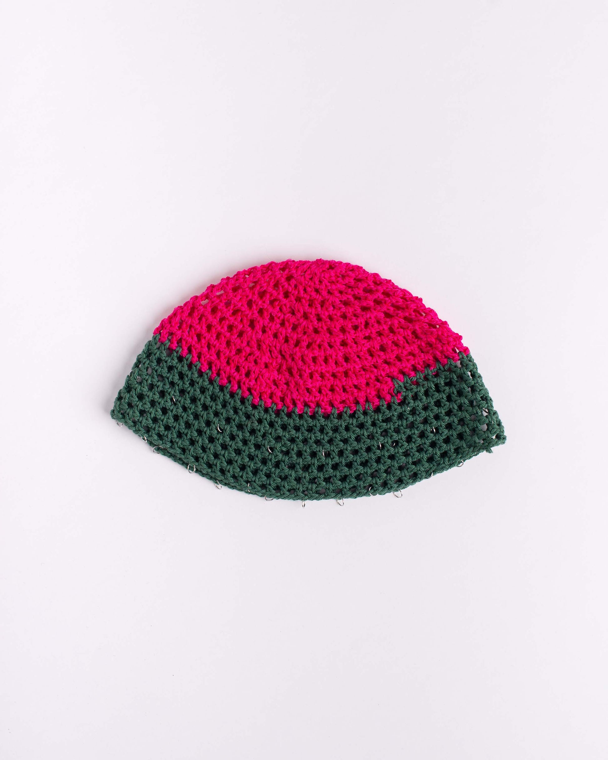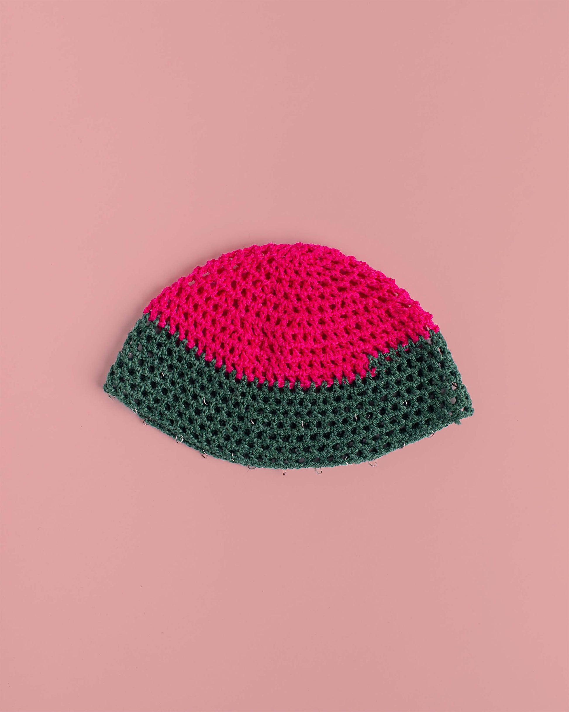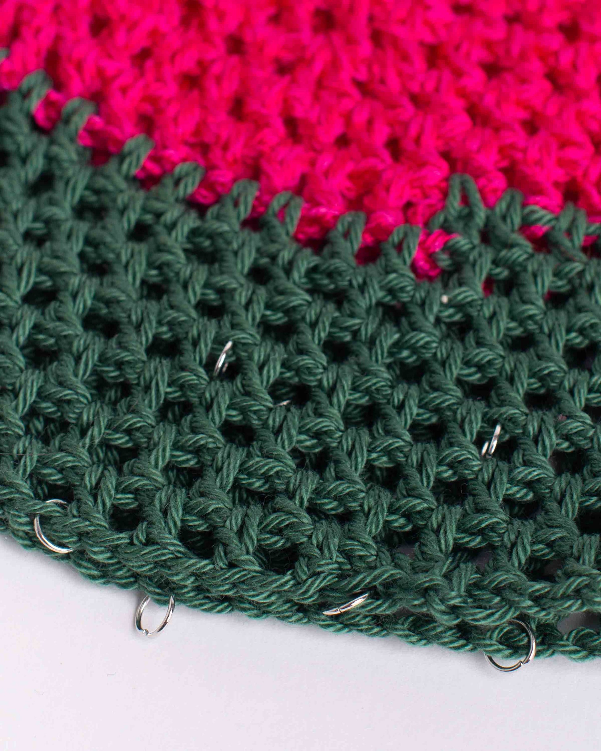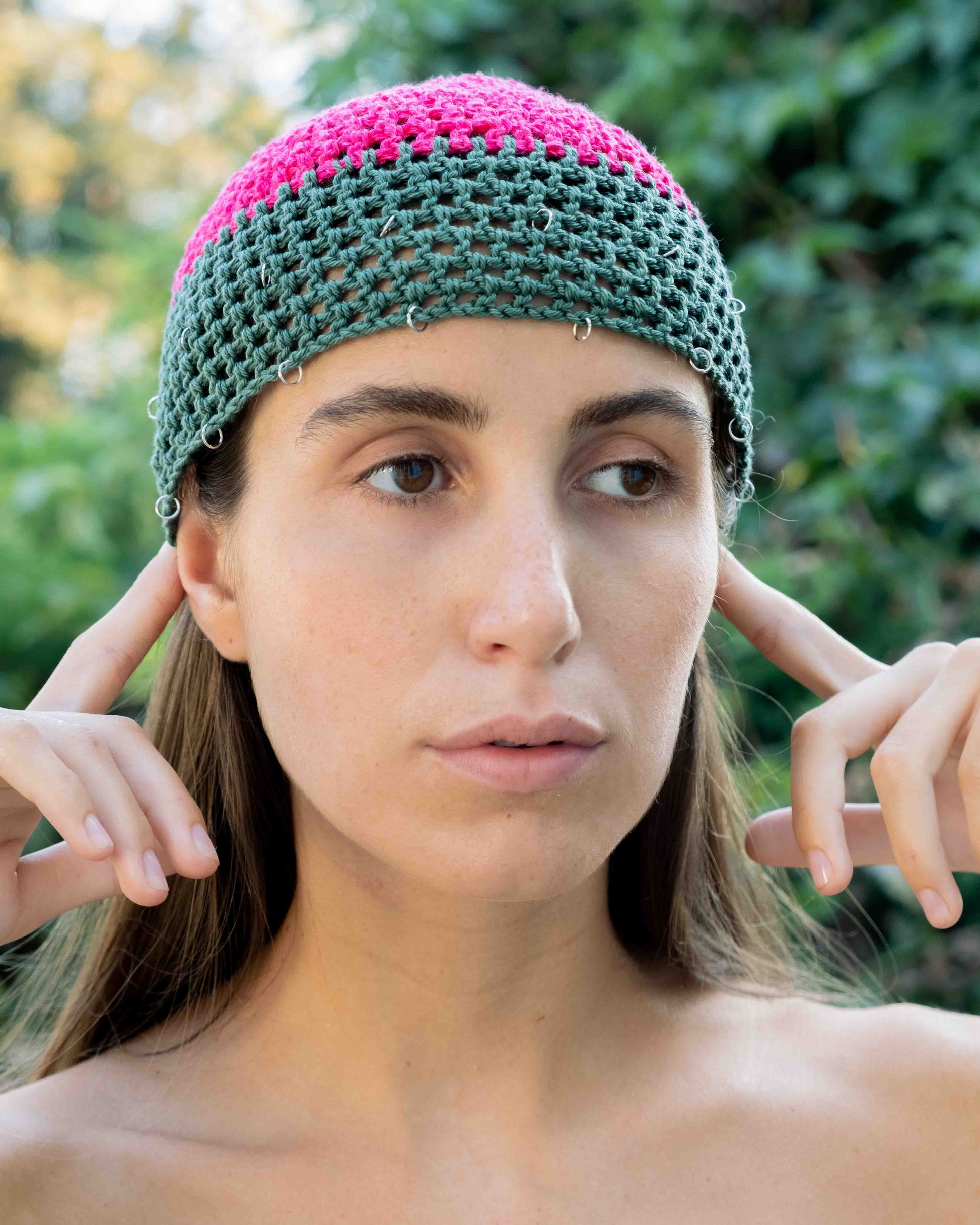 Bicolor mini cap. Perforated crochet work. Details of mini steel rings.
