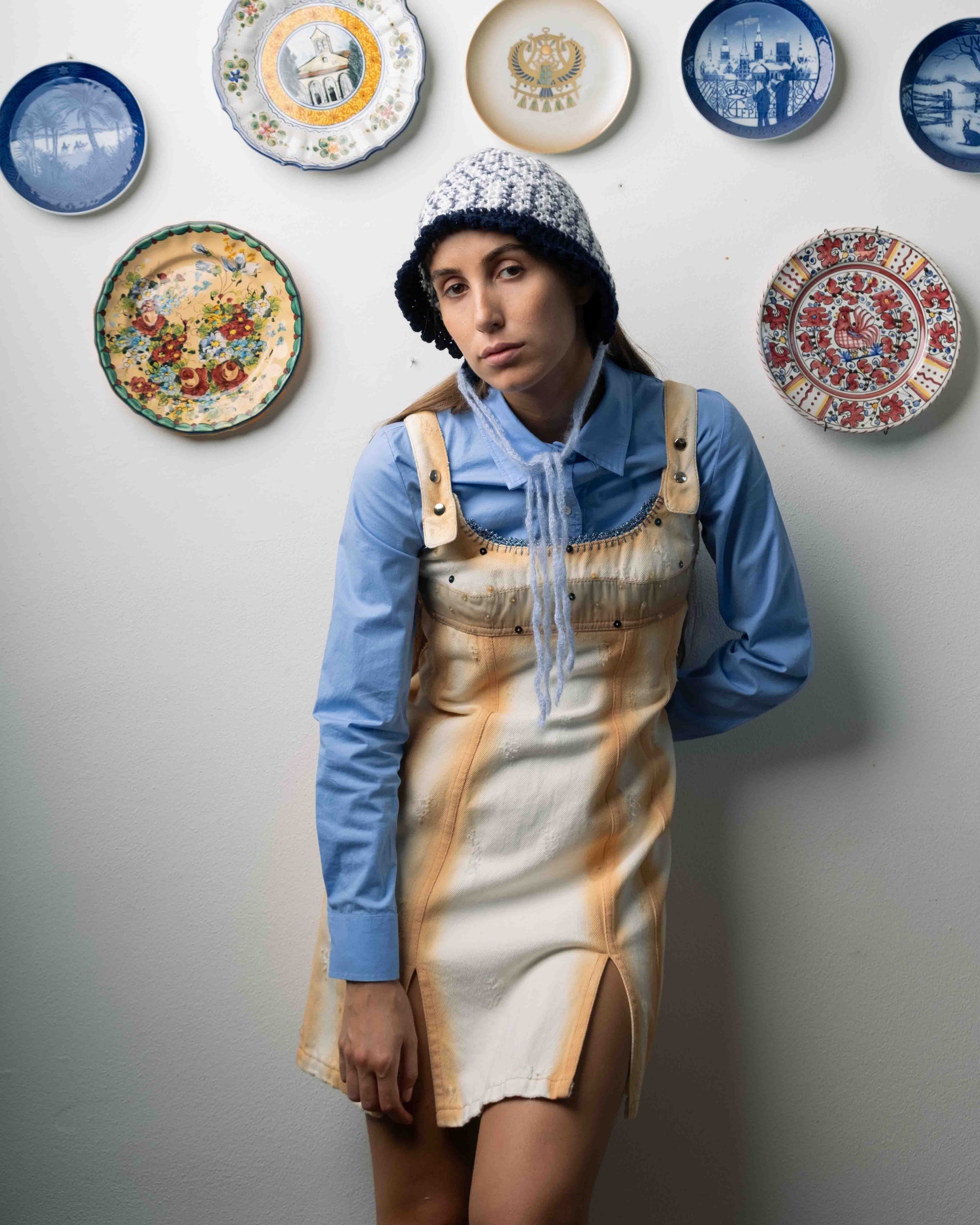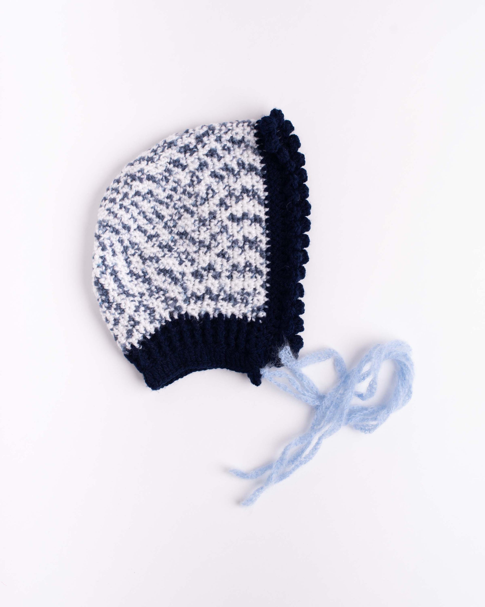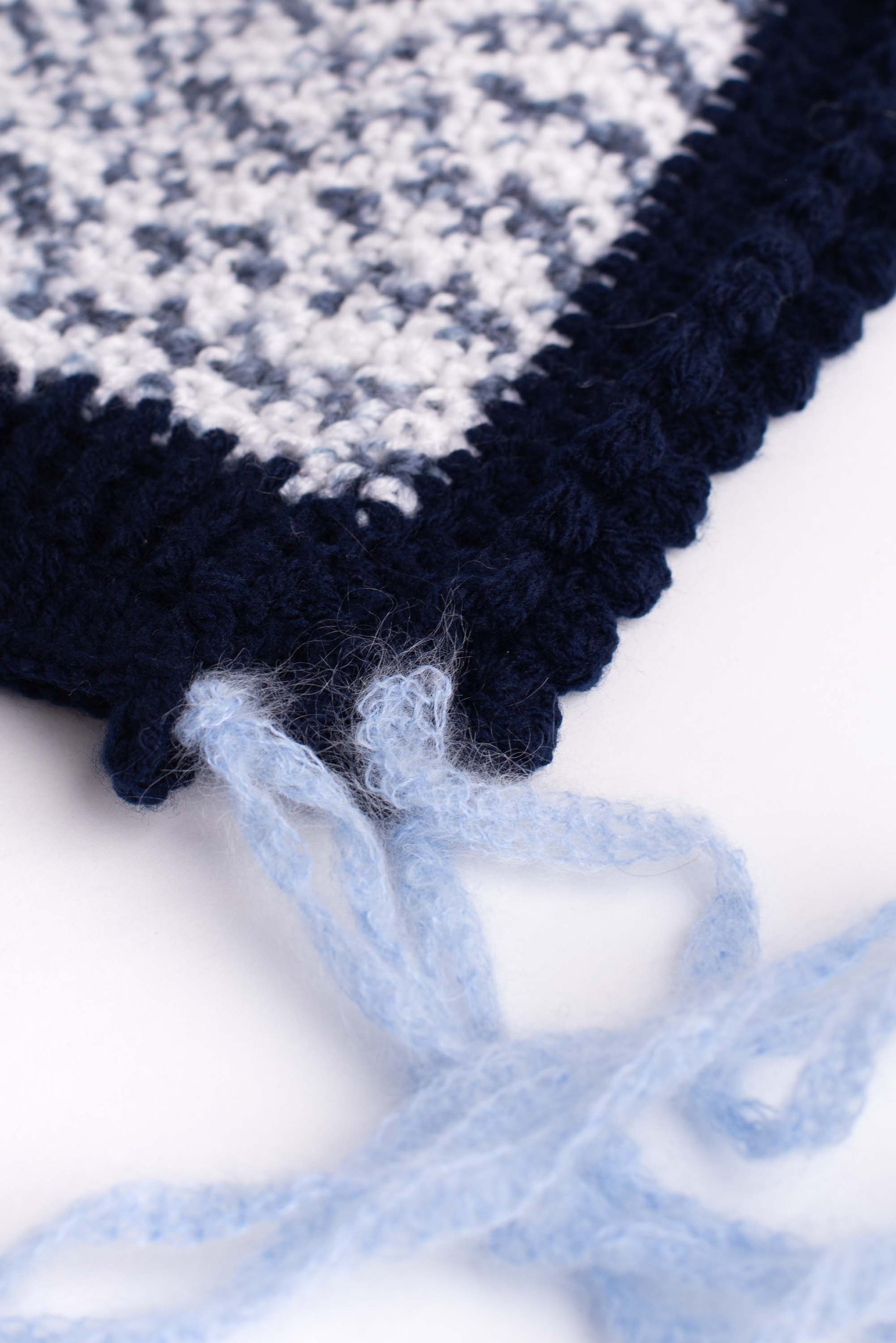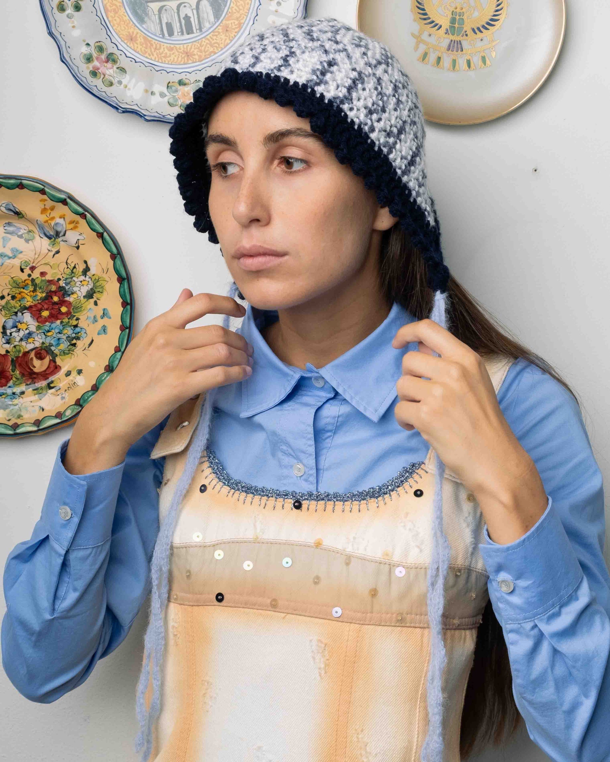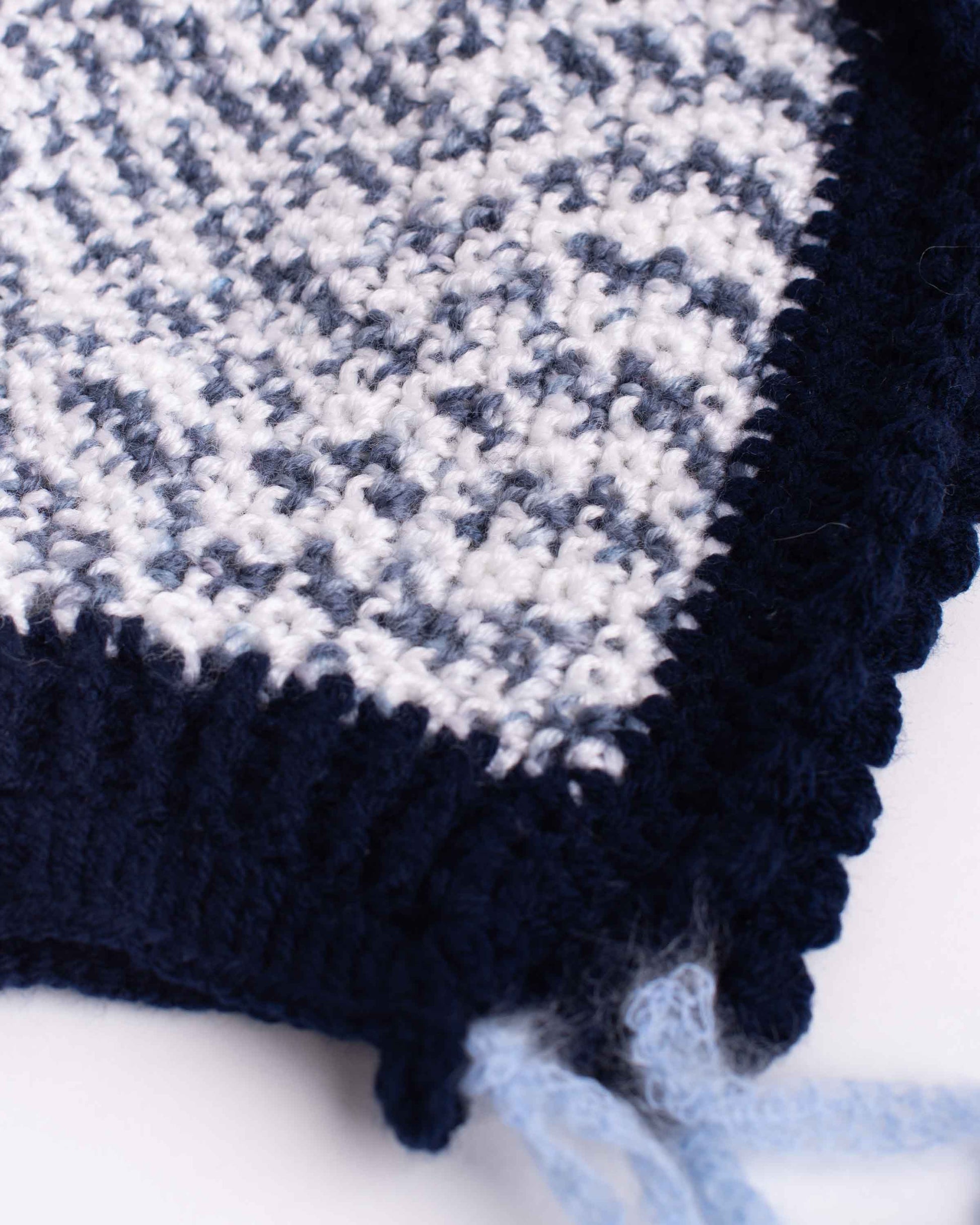 Bicolor mini cap. Perforated crochet work. Details of mini steel rings.