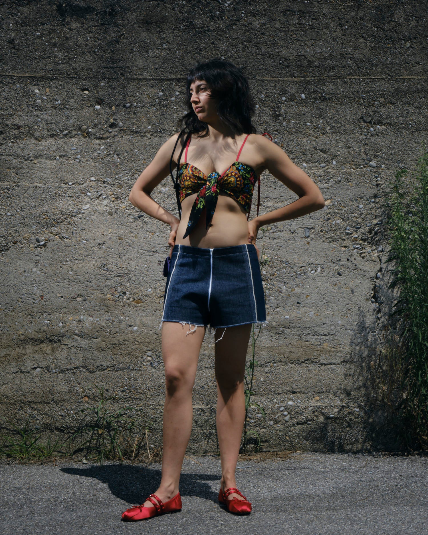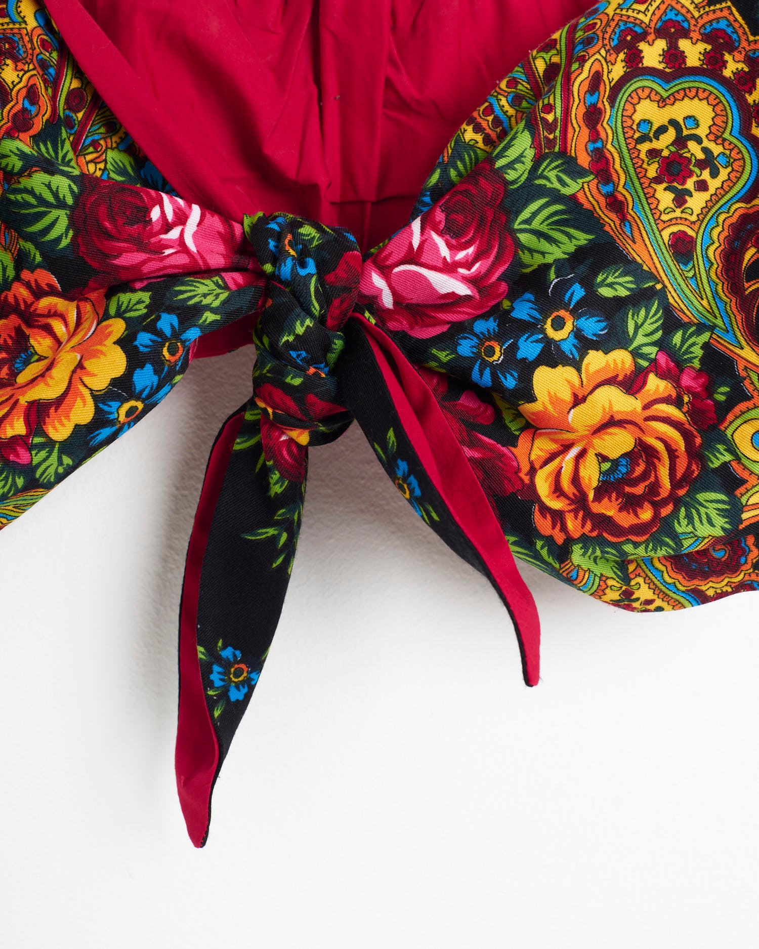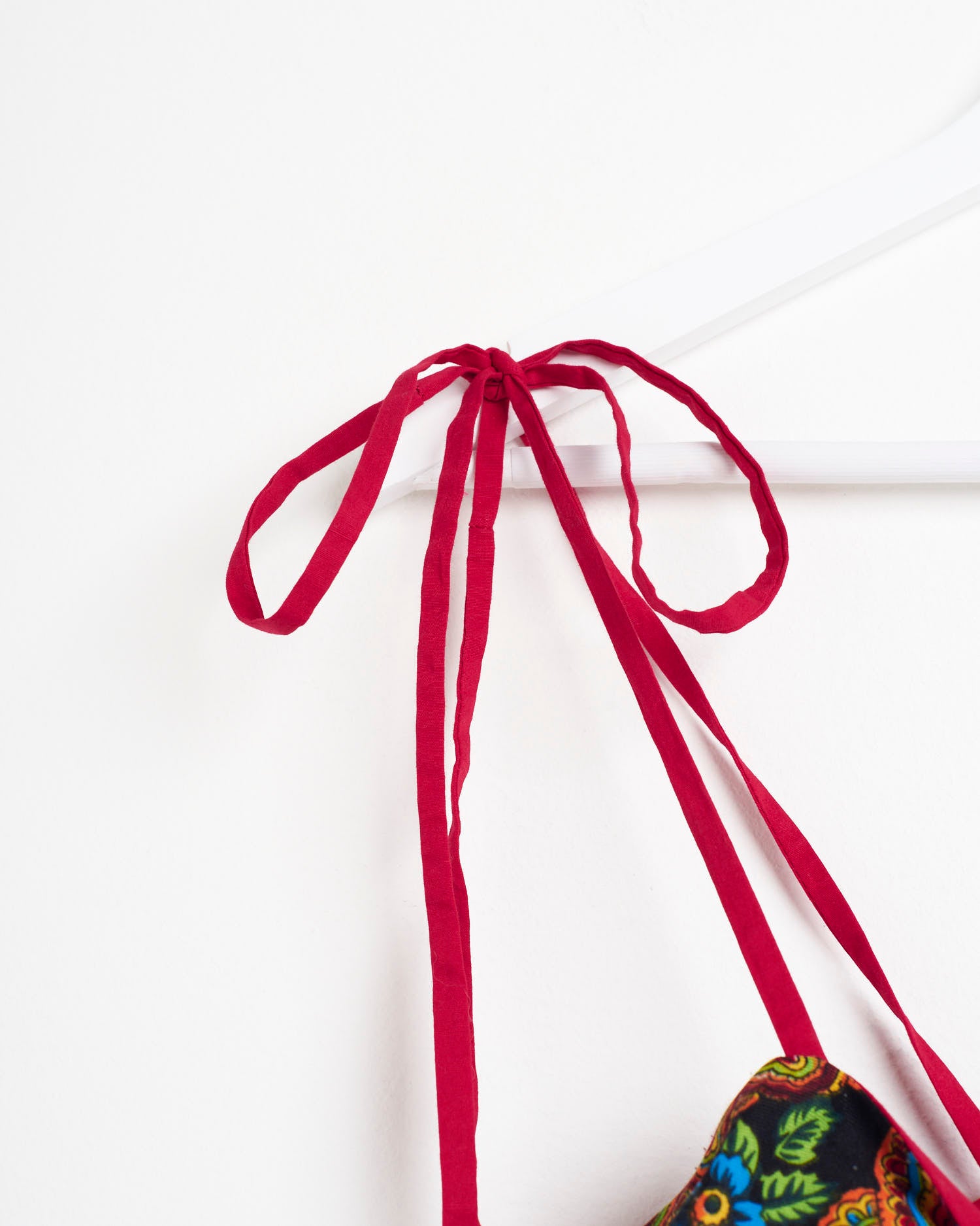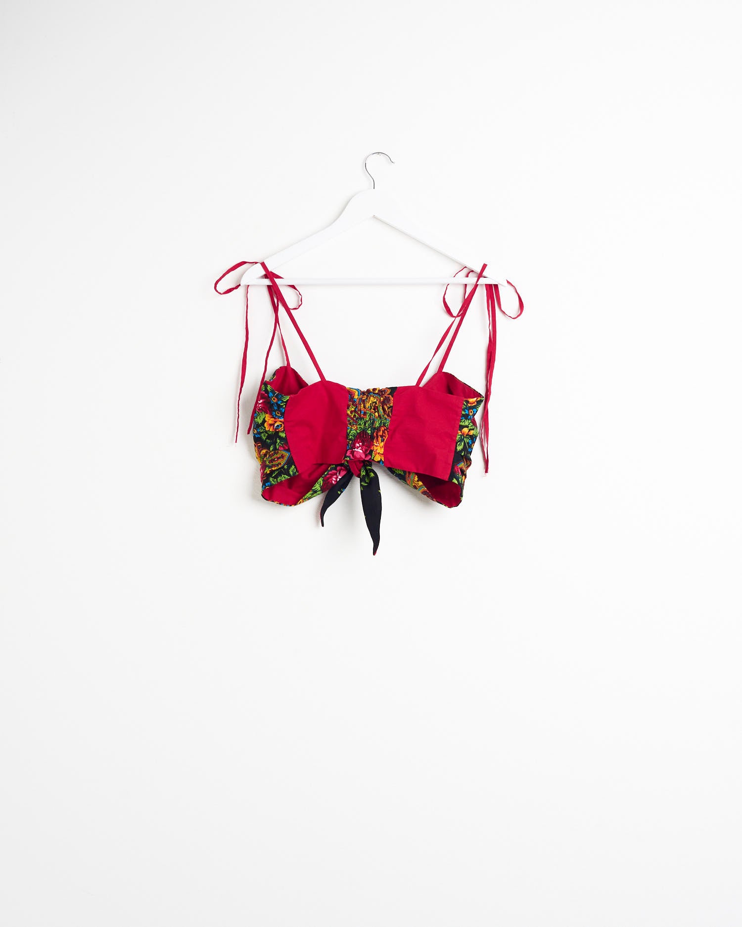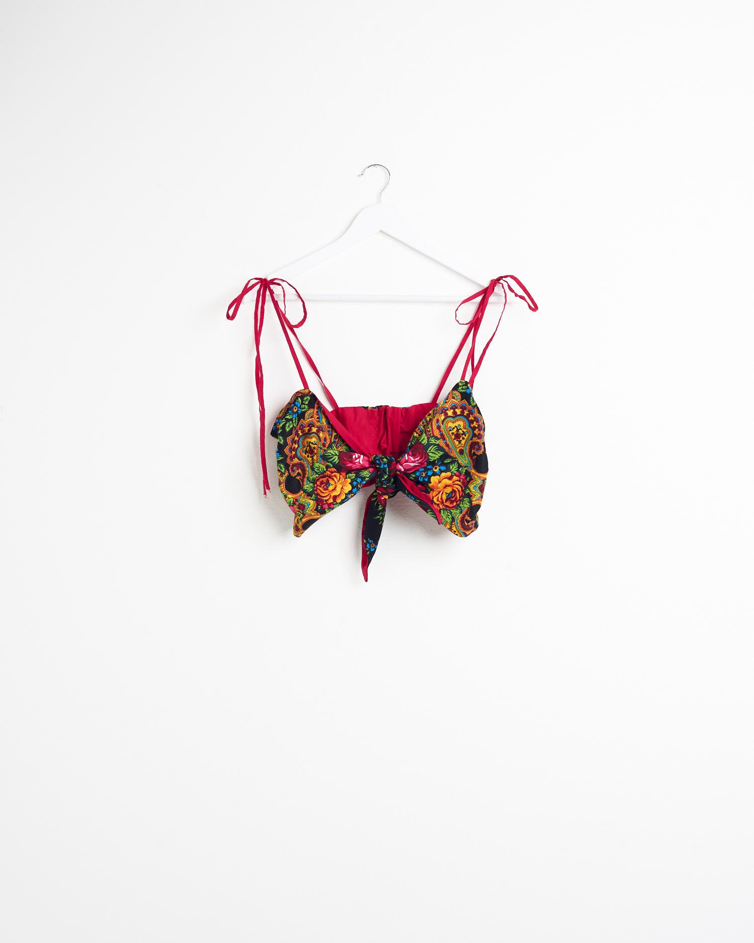 Double-Face top regolabile, con nodo al centro caratterizzato da una trama floreale. Taglia regolabile da XS a M.
