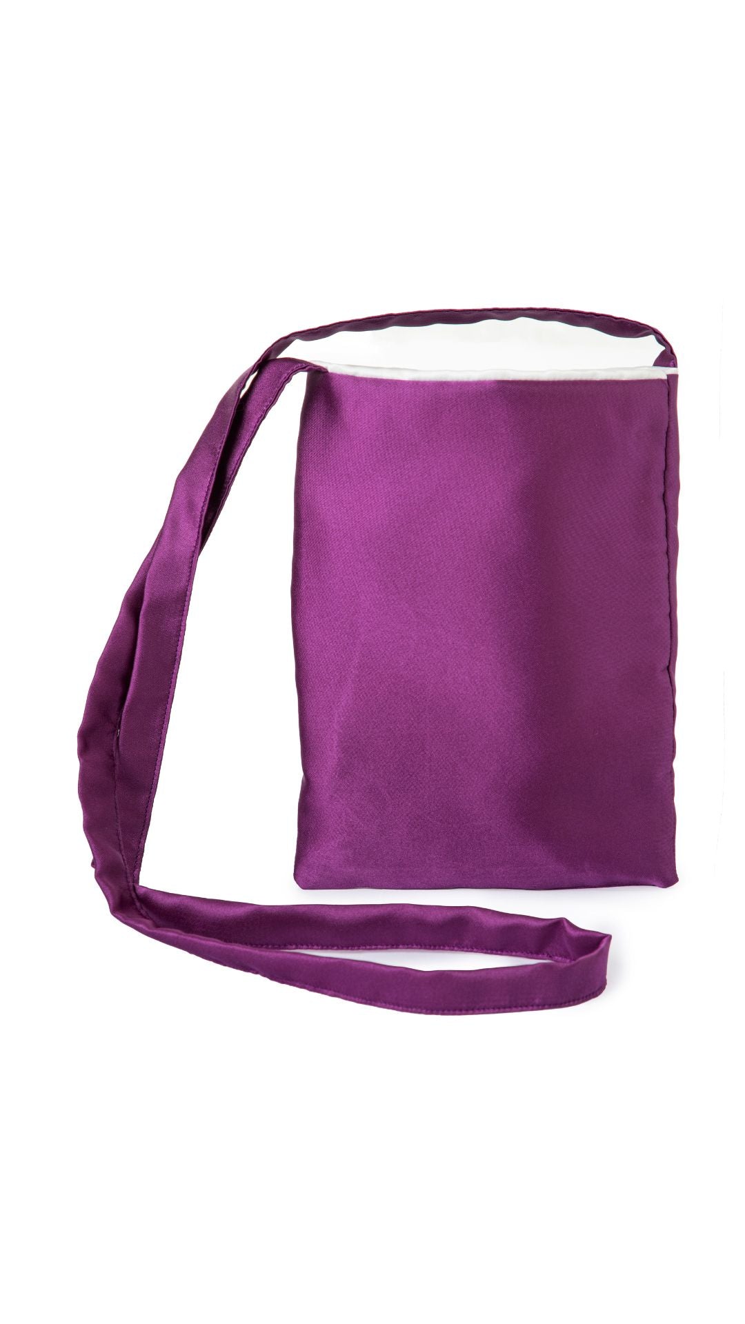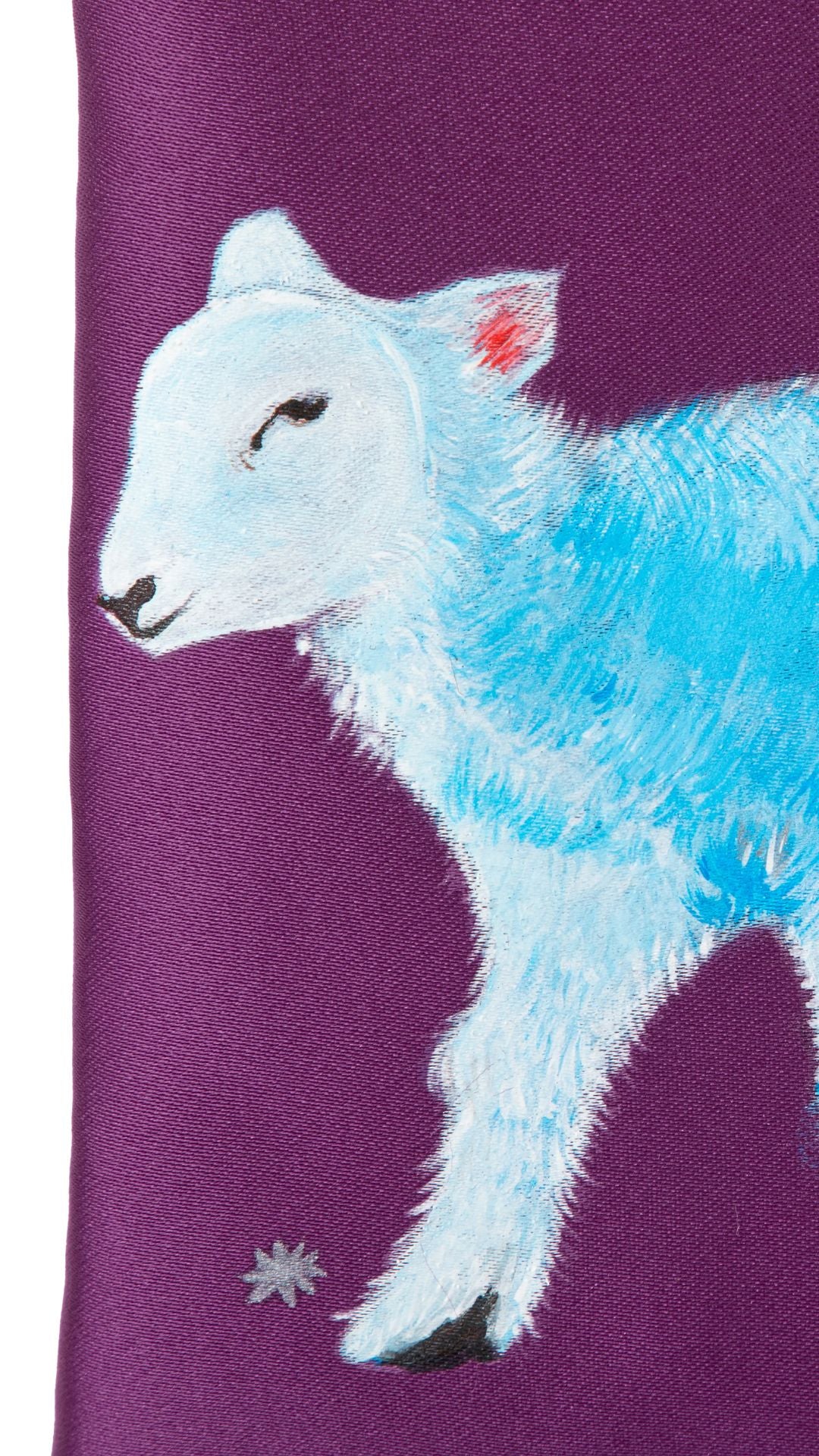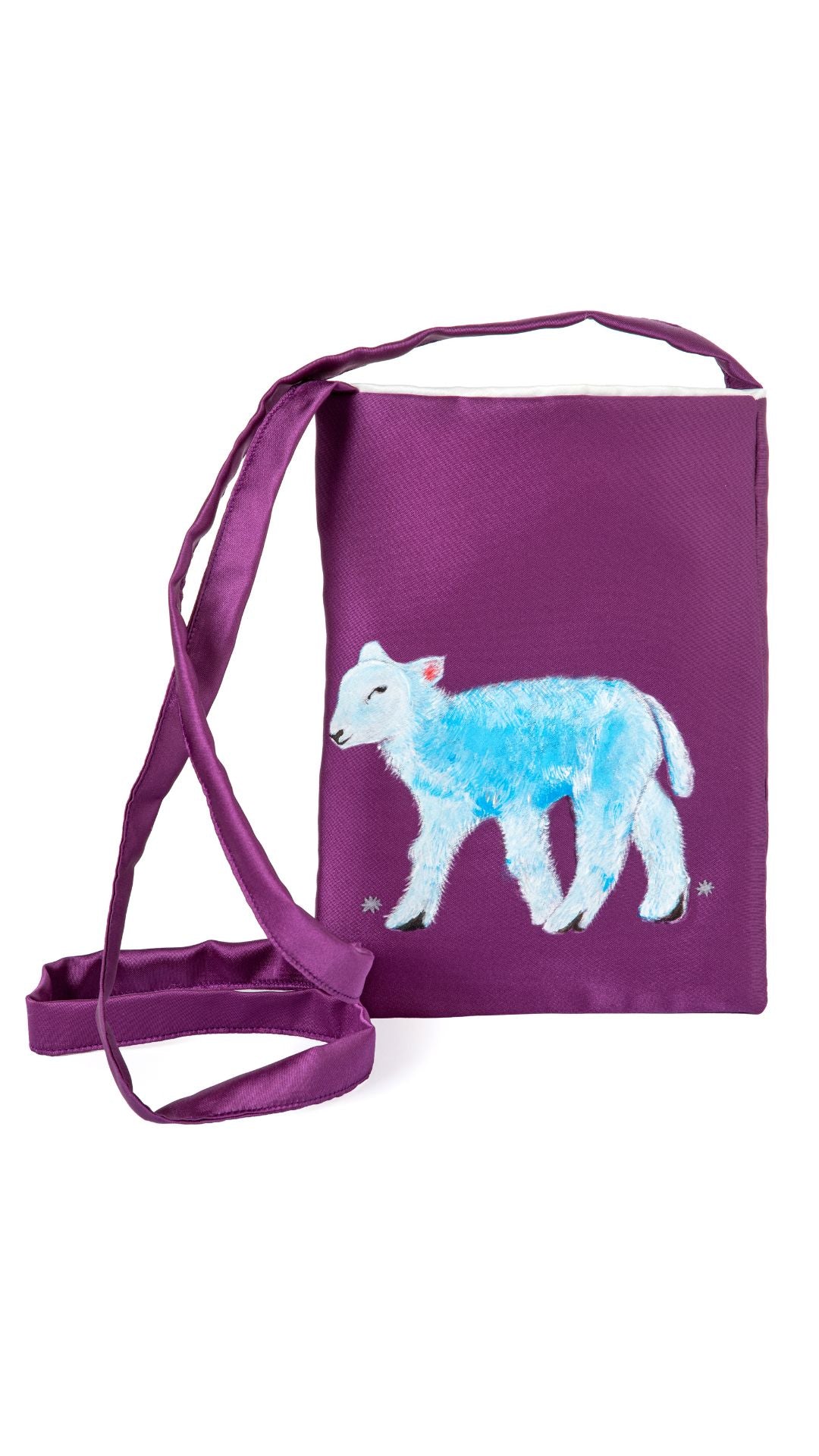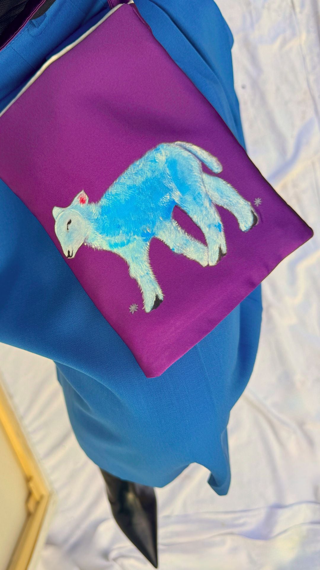 Mini borsa in raso viola a tracolla con agnello azzurro dipinto a mano sul davanti. Stesso materiale utilizzato per la fodera interna con colore bianco a contrasto, etichetta viola dipinta a mano. Tutti i pezzi sono unici, personalizzabili e fatti a mano in Italia.
