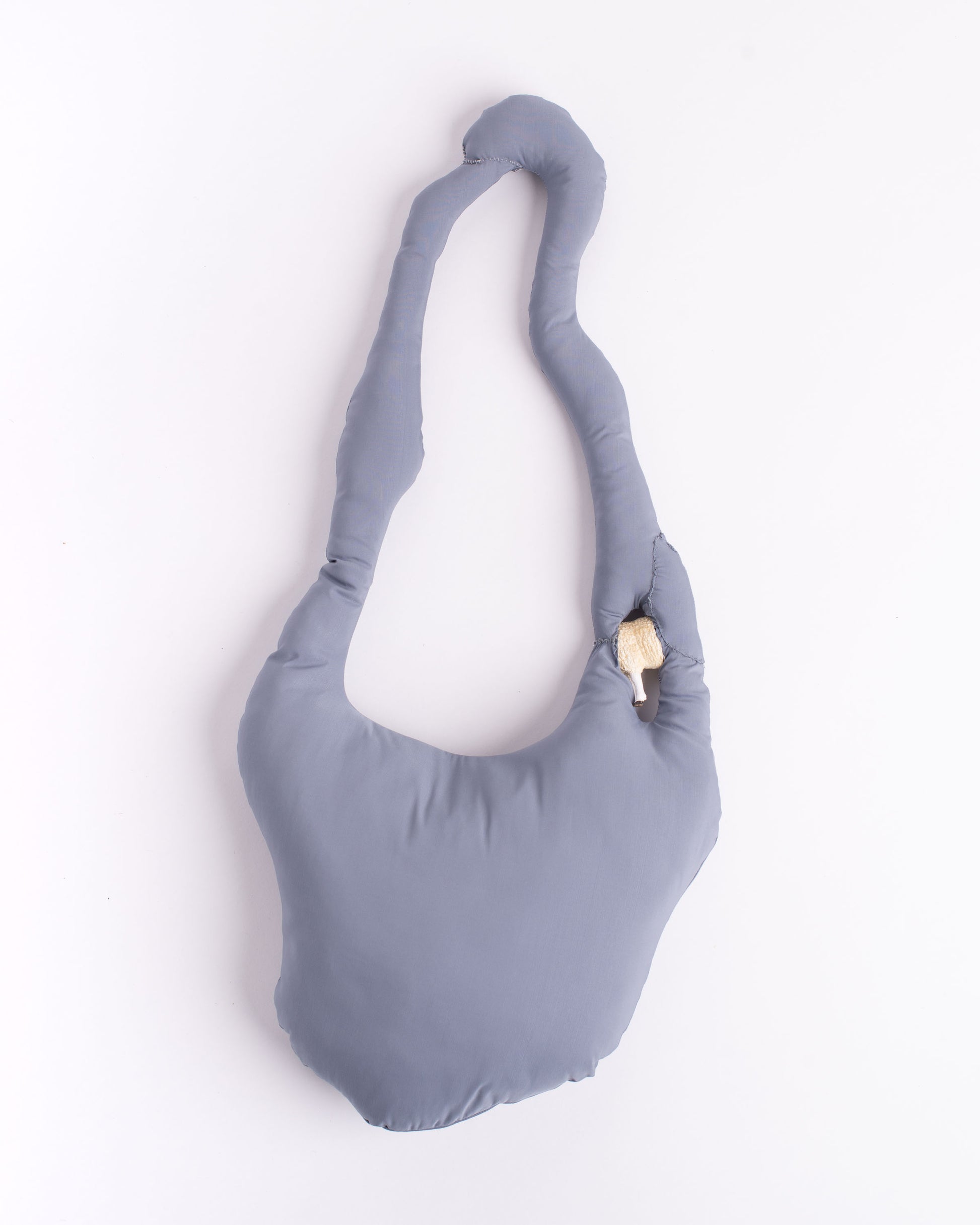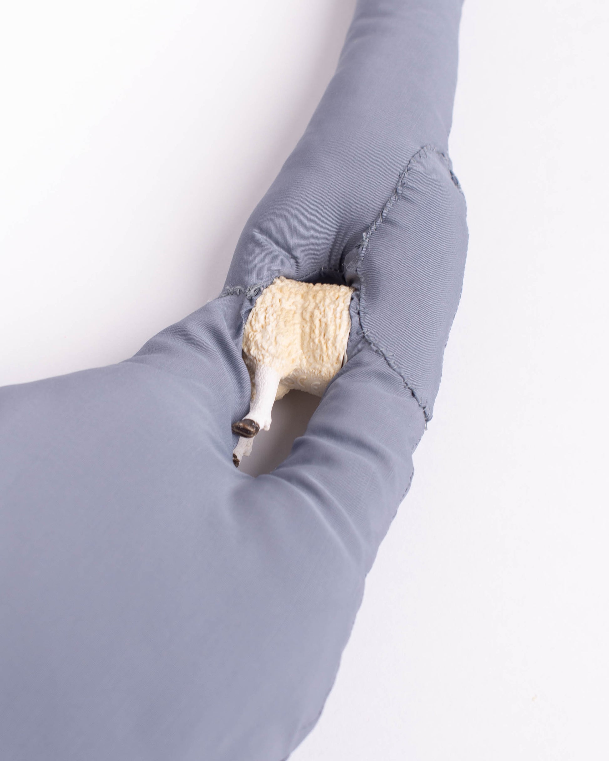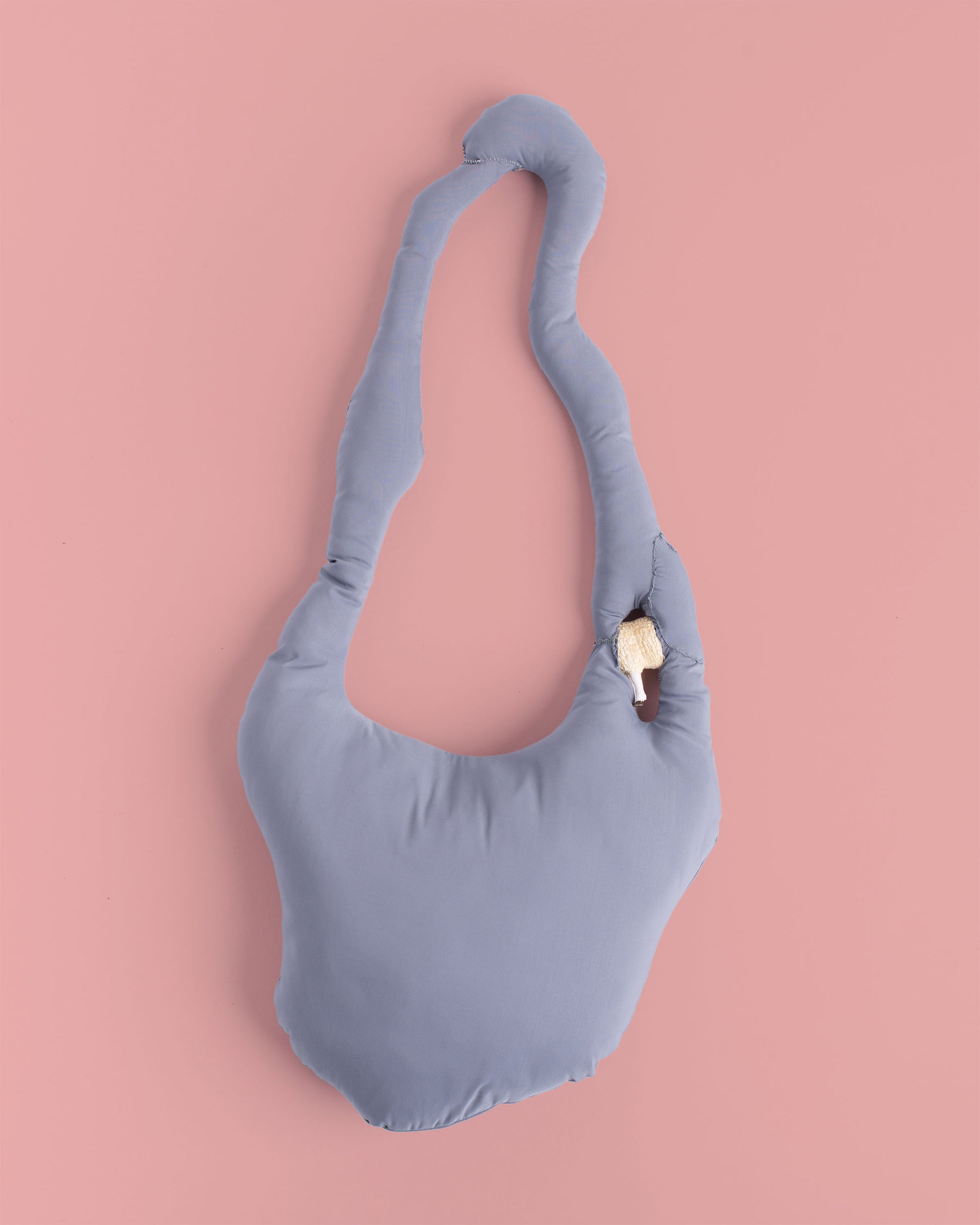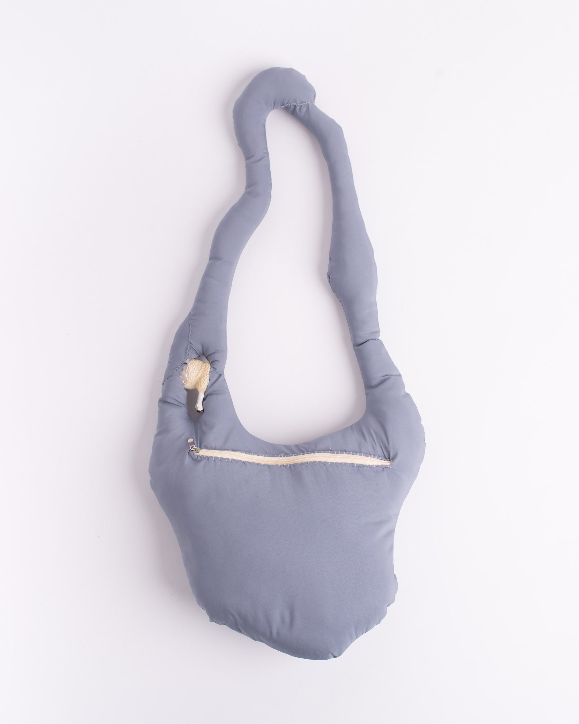 Shoulder bag made with polyester cotton blend parachute fabric. Exterior in satin with a smooth and fresh touch, inside crease-resistant cotton padding. Zip opening/closing on one side of the display. Detail of sheep's body set on the handle. Hand washable in cold water. 70x25 cm.