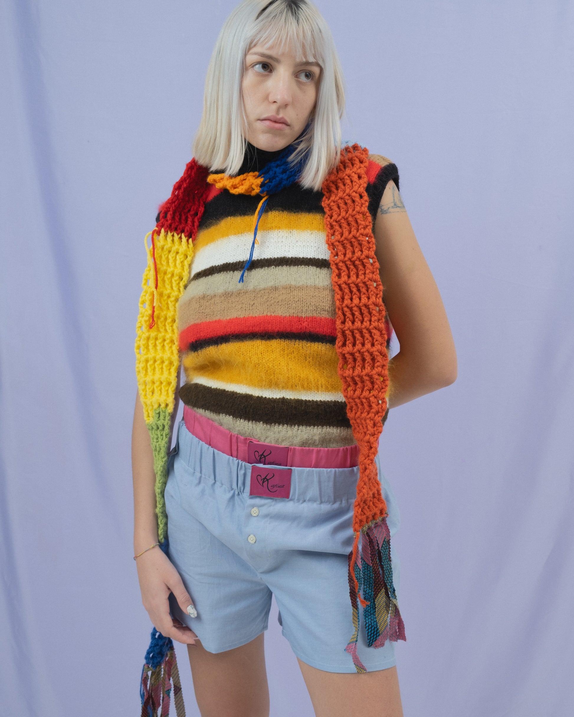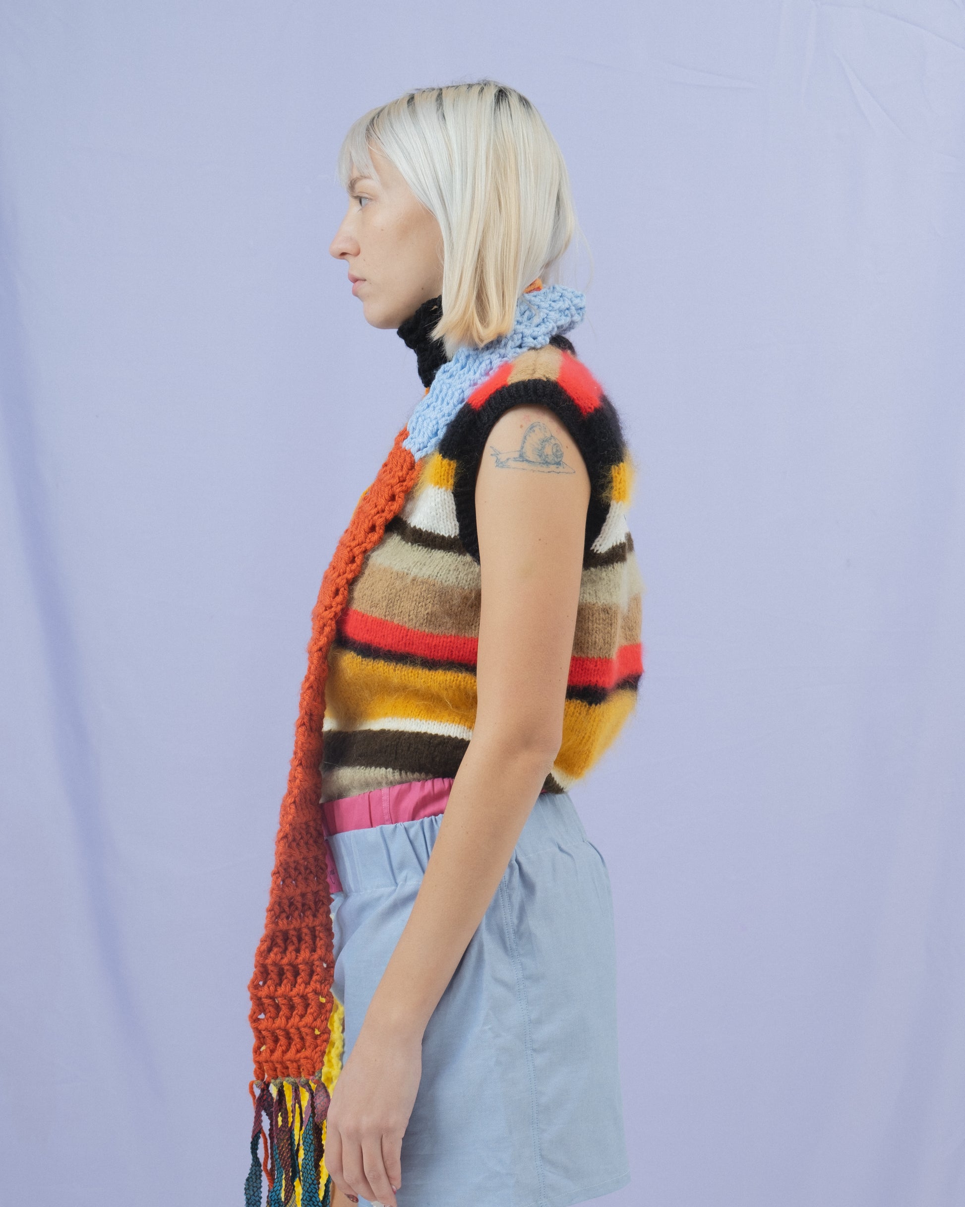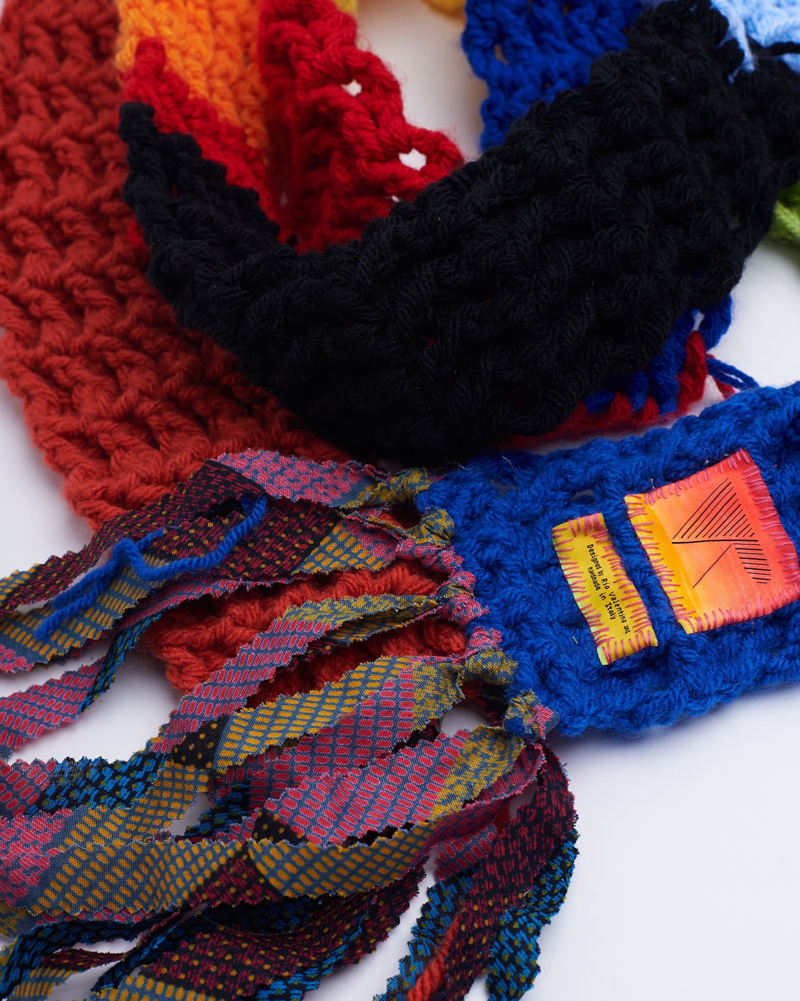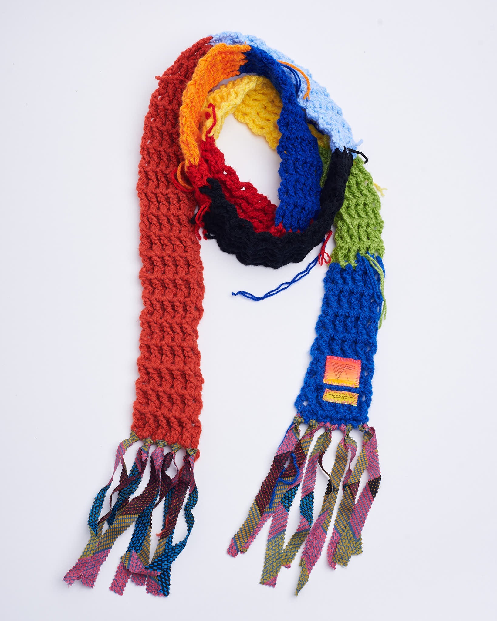 Scarf crocheted in warm, ultra-soft acrylic yarn, specially selected to be worn by people intolerant to wool and vegans. Fabric details on the bottom. Hand washing.