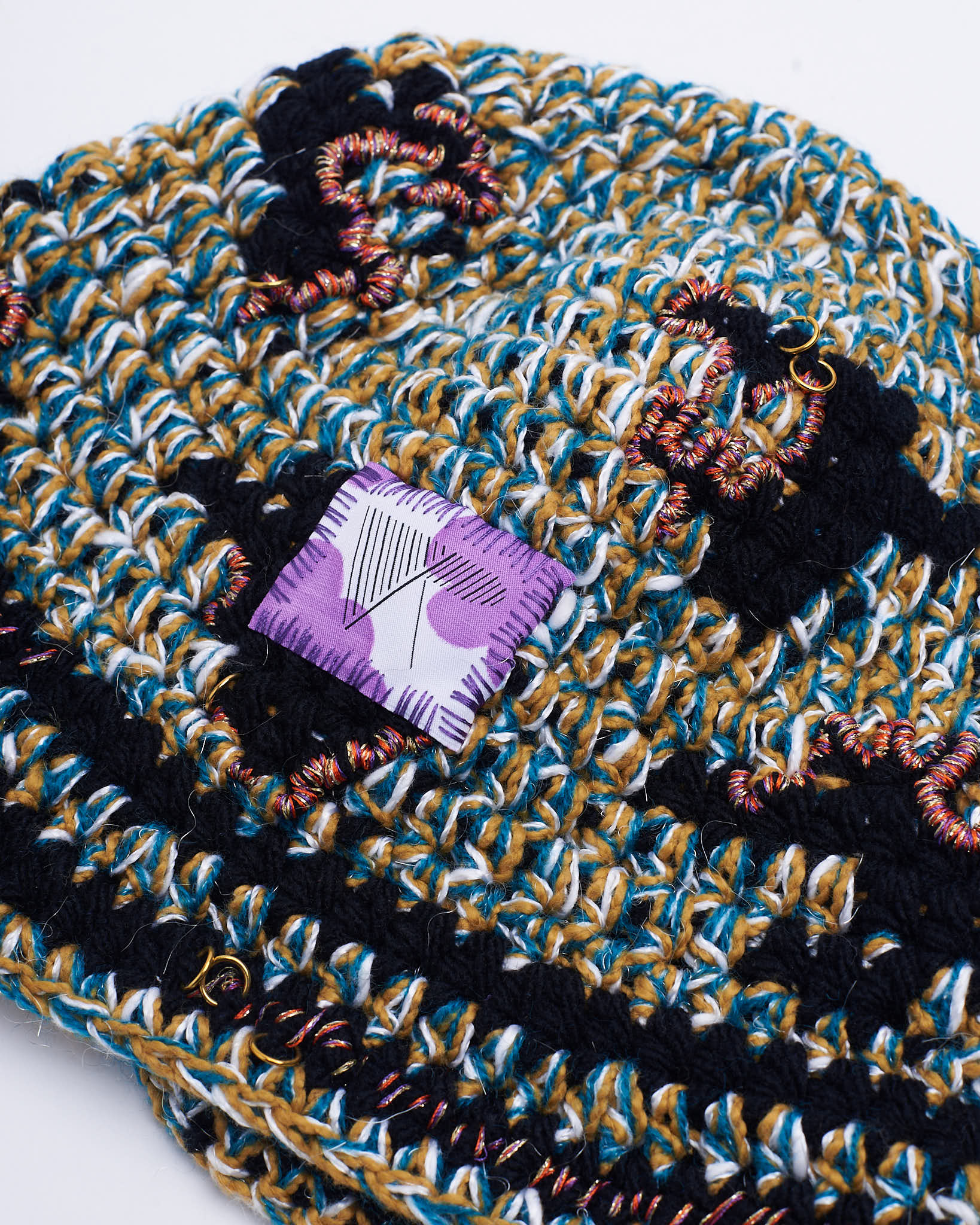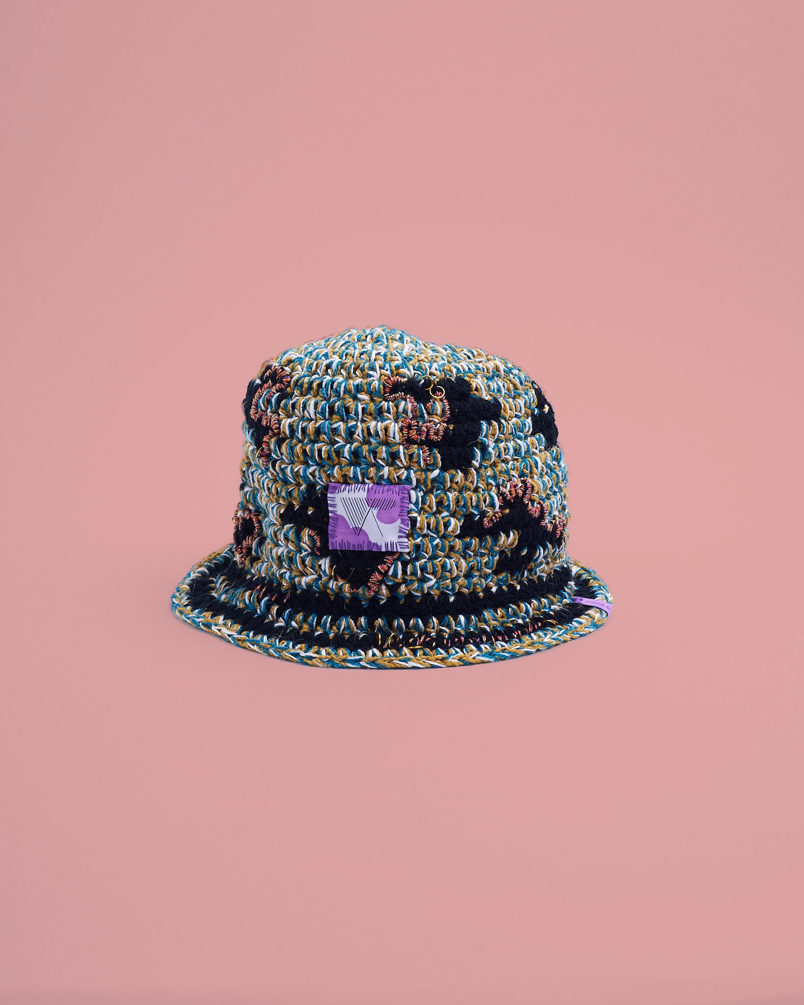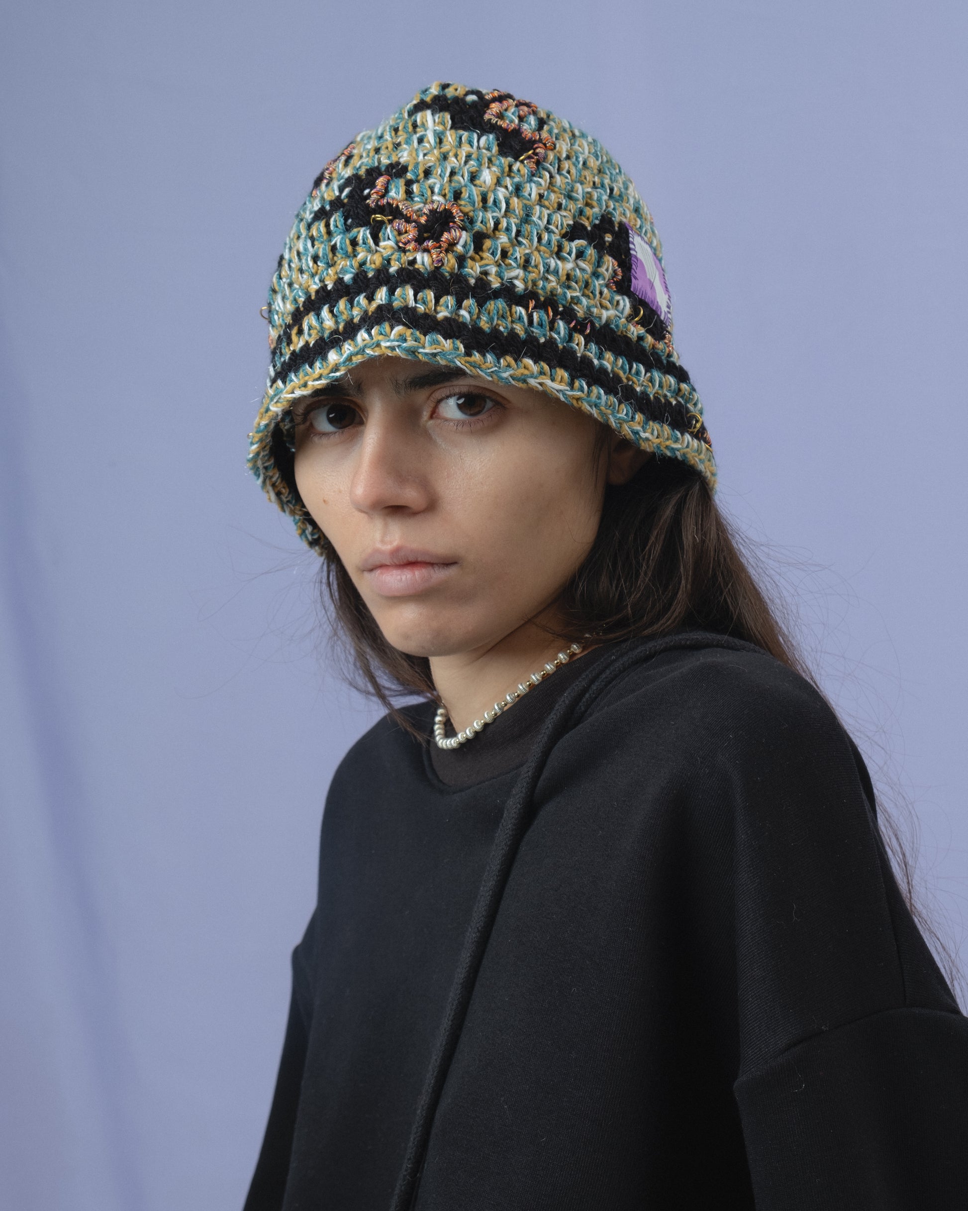 Crochet hat in warm and soft yarns with hand-sewn details. Hand wash.