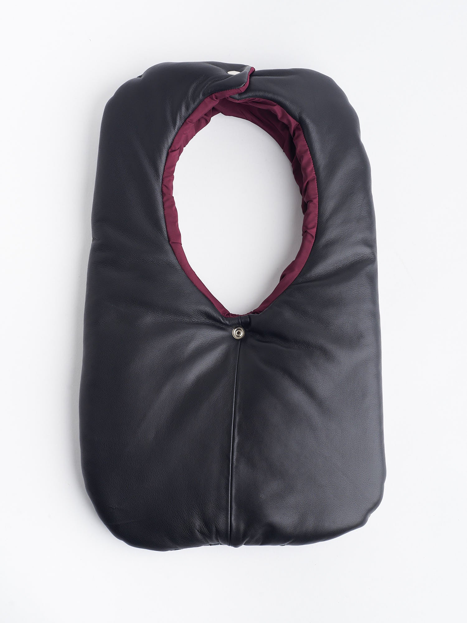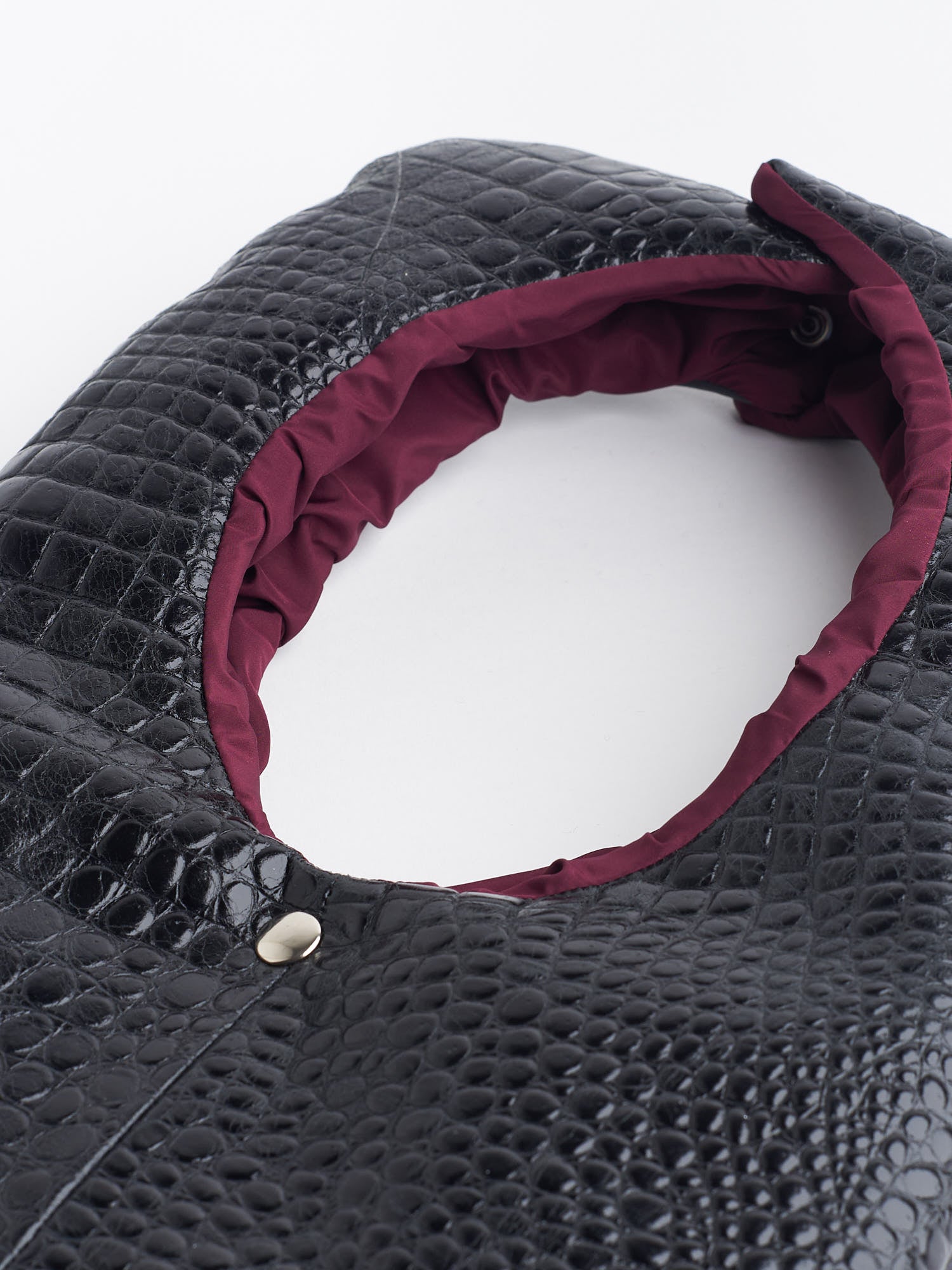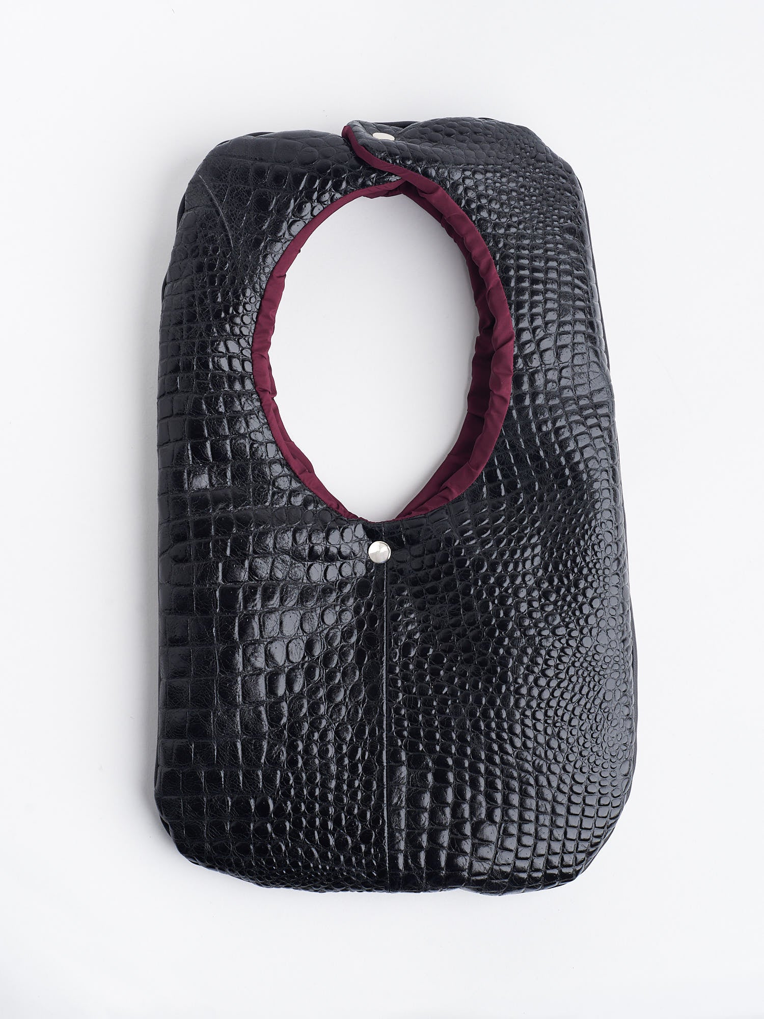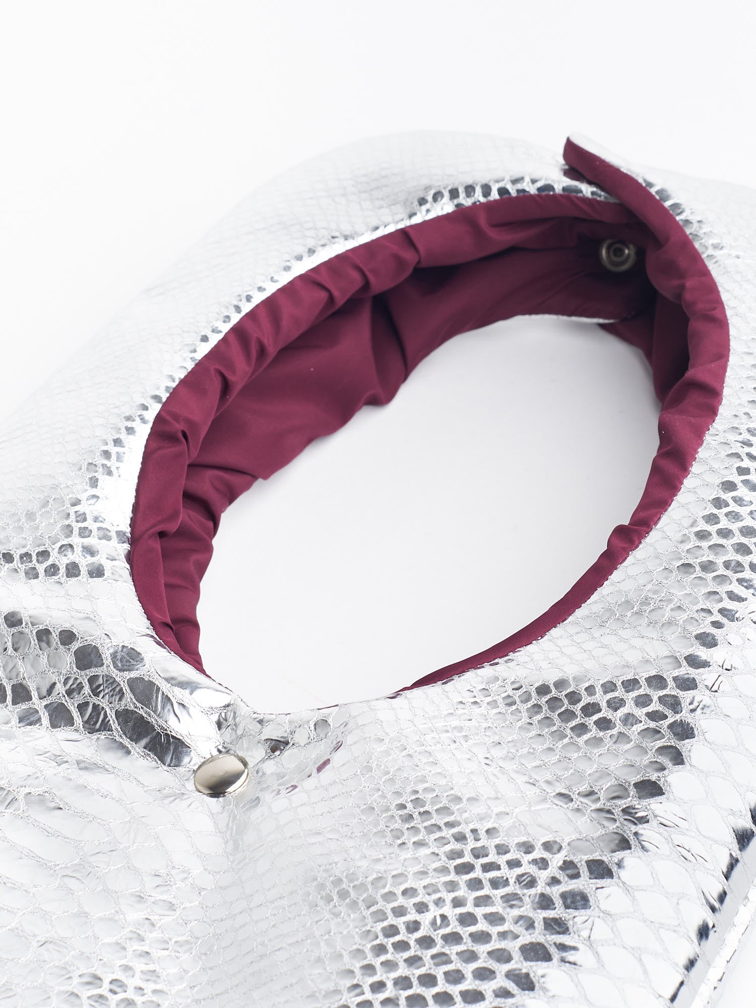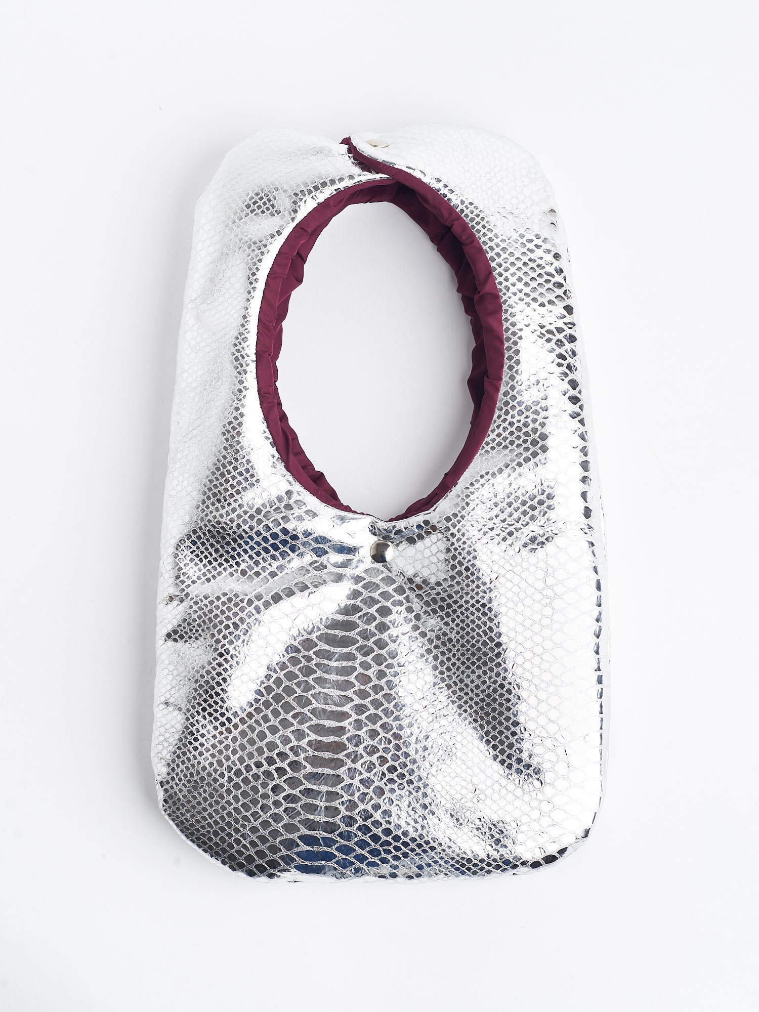 Oval-shaped handbag with metal buttons. Internal lining in nylon, external in 100% fine leather coming from waste from Italian companies. Each piece is unique and handmade in Italy.