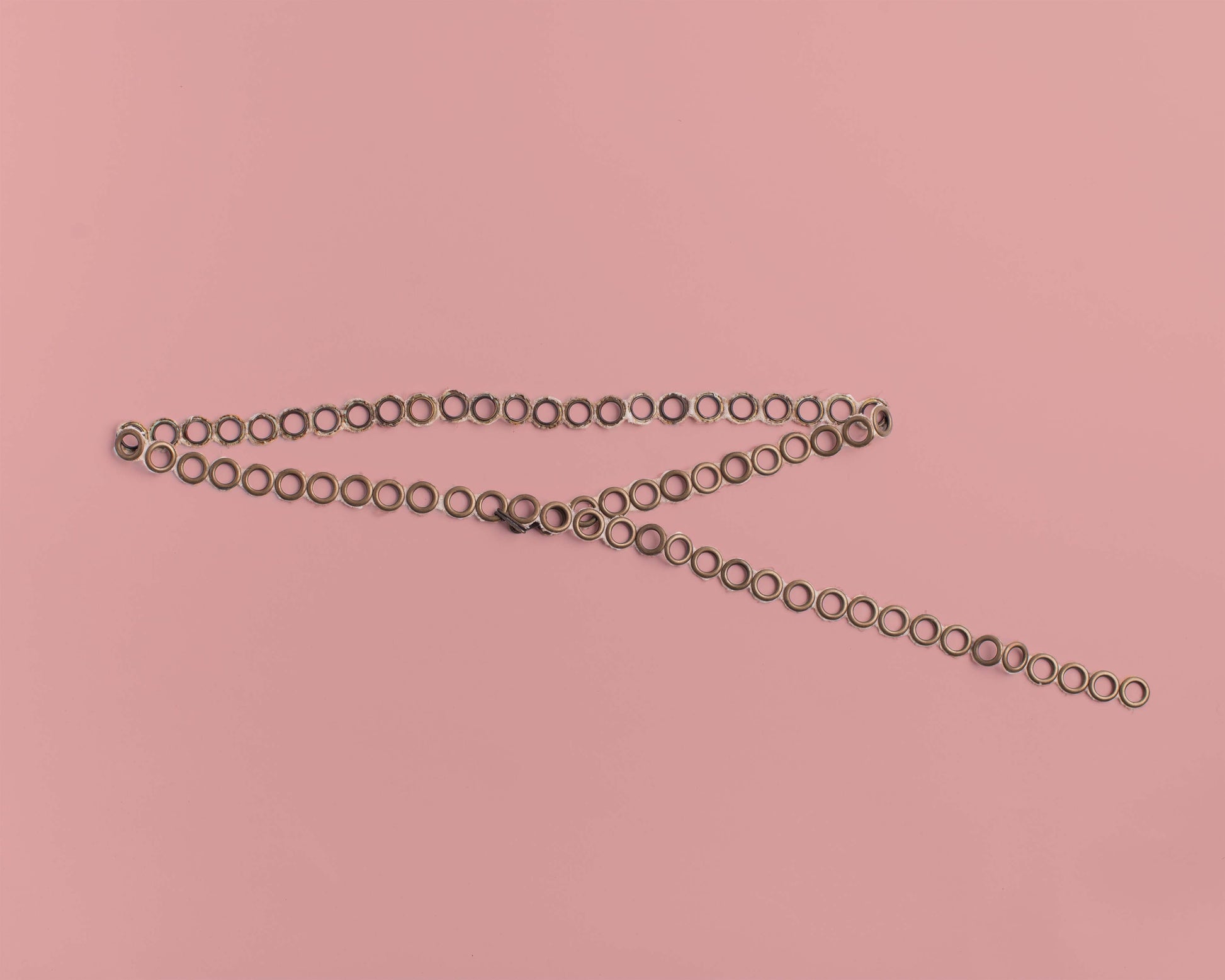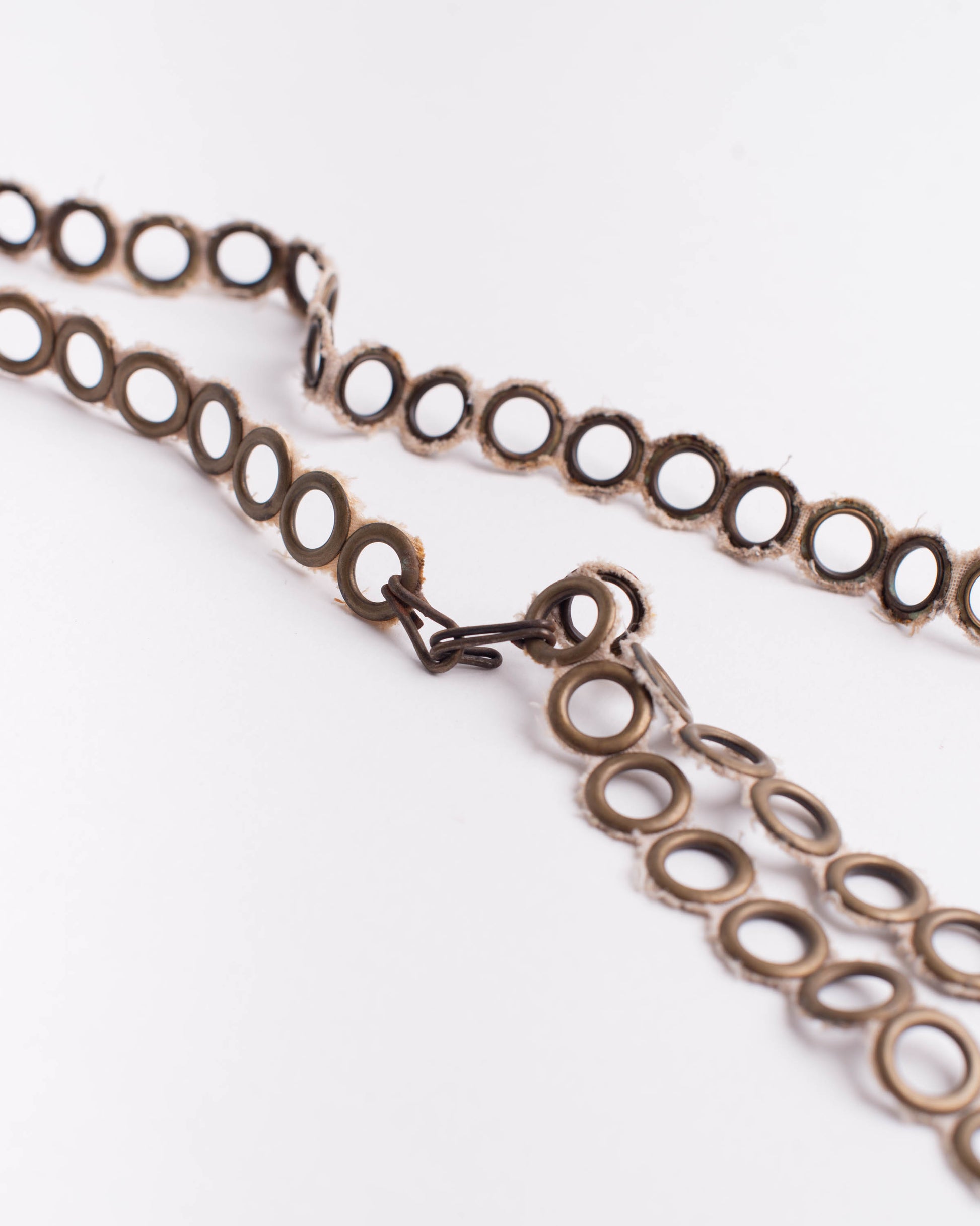 The eyelet belt is part of the What Is Forgotten jewelry line. It is made by applying the eyelets to the cotton. Cotton is warehouse waste. Suppliers produce eyelets from waste powder obtained during the product manufacturing process. It was born with a low-waisted fit but being adjustable it is possible to choose the fit.