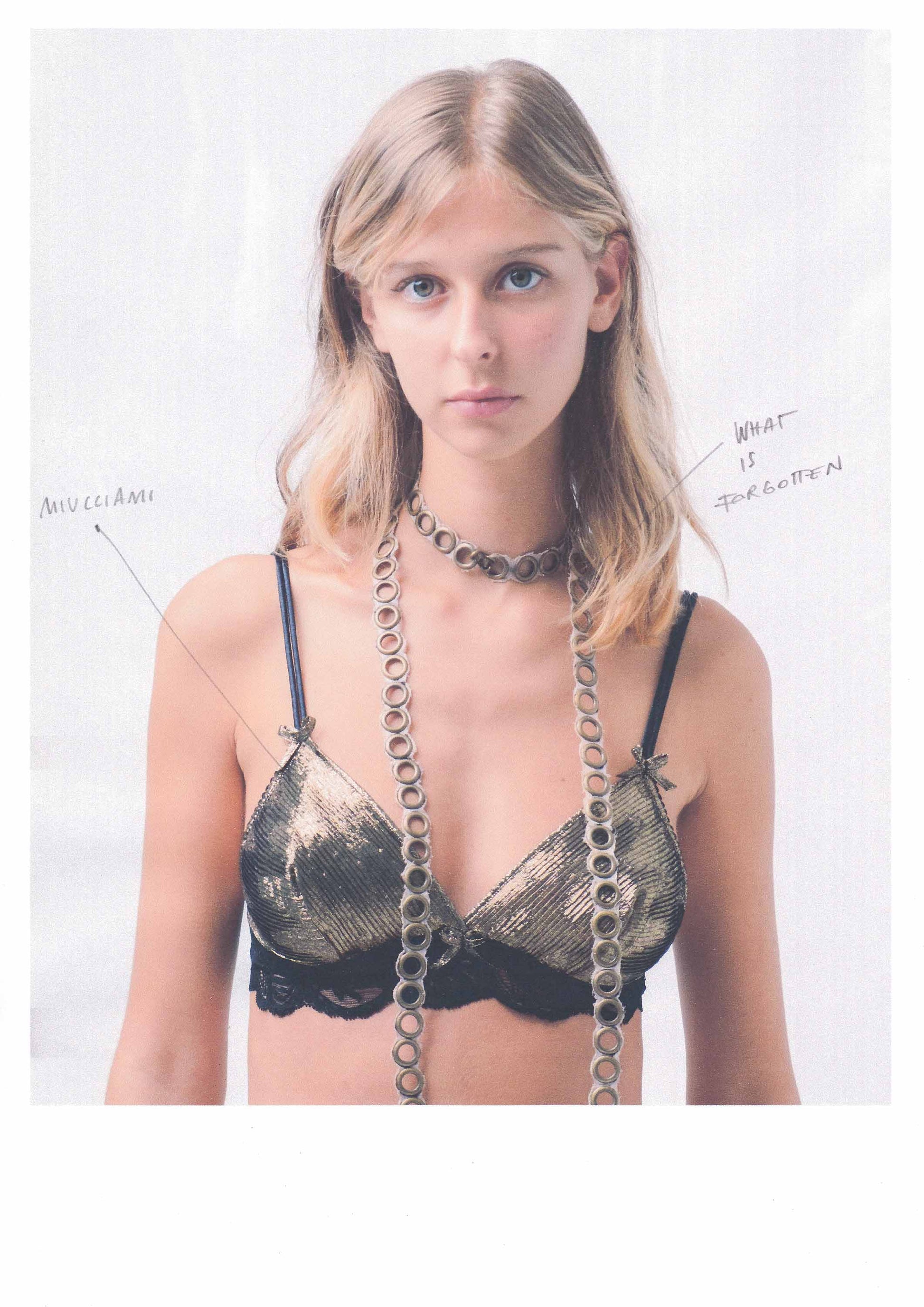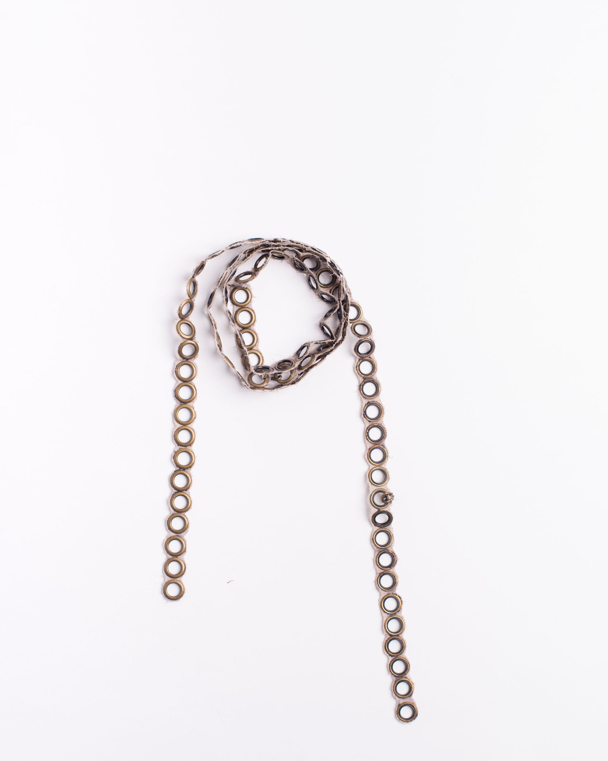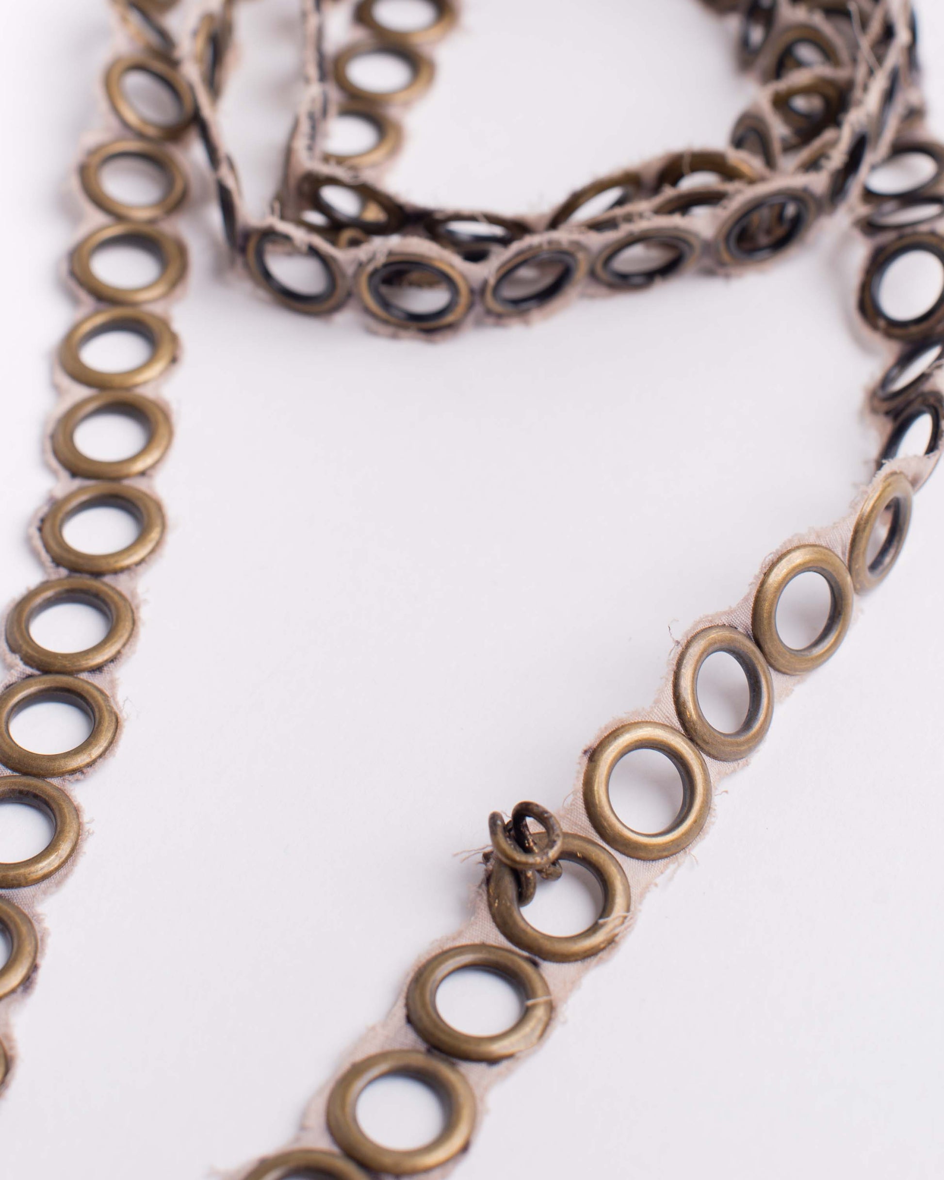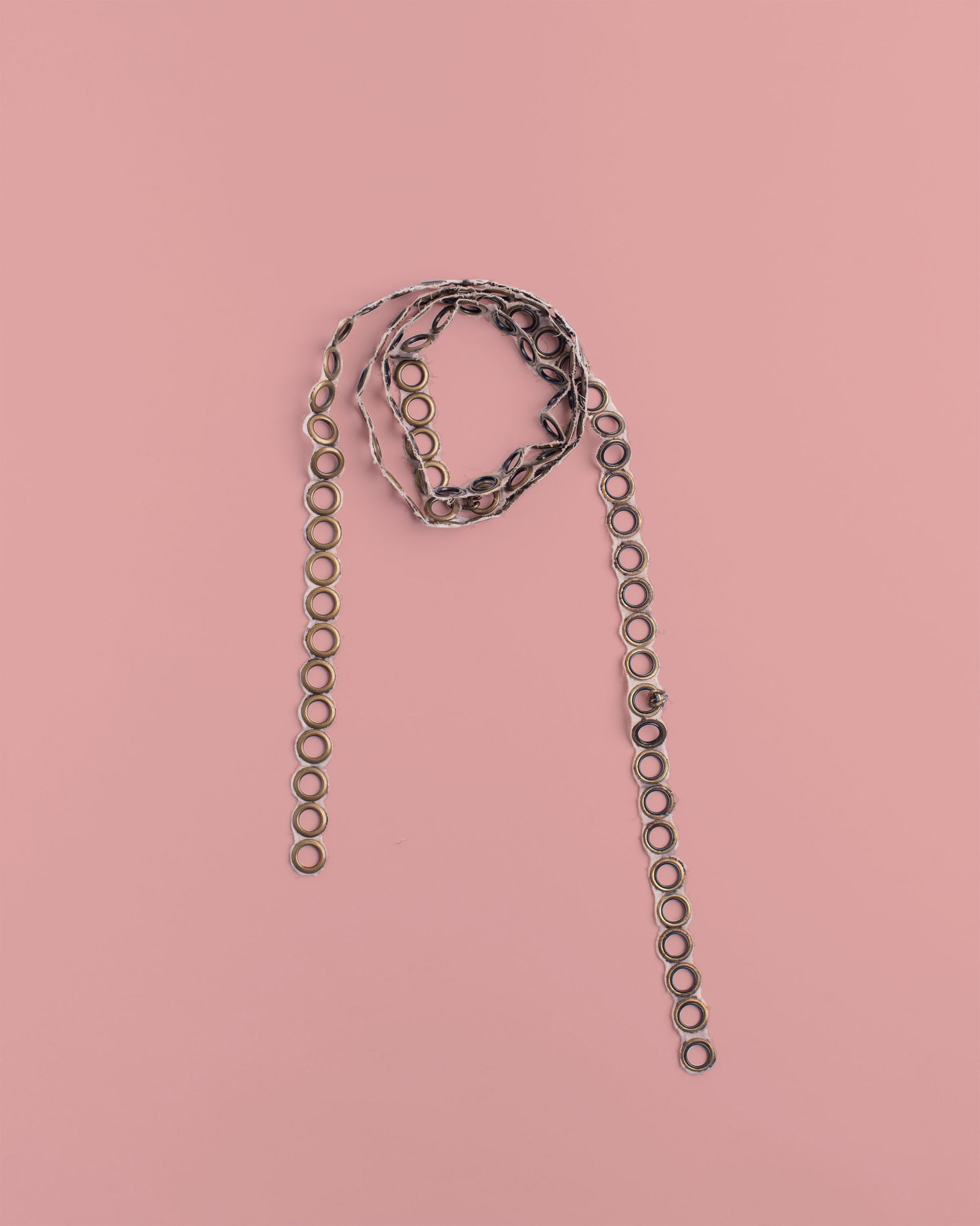 The eyelet necklace is part of the What Is Forgotten jewelry line. It is made by applying the eyelets to the cotton. Cotton is warehouse waste. Suppliers produce eyelets from waste powder obtained during the product manufacturing process. On the back there are hooks to allow crossing and closing.