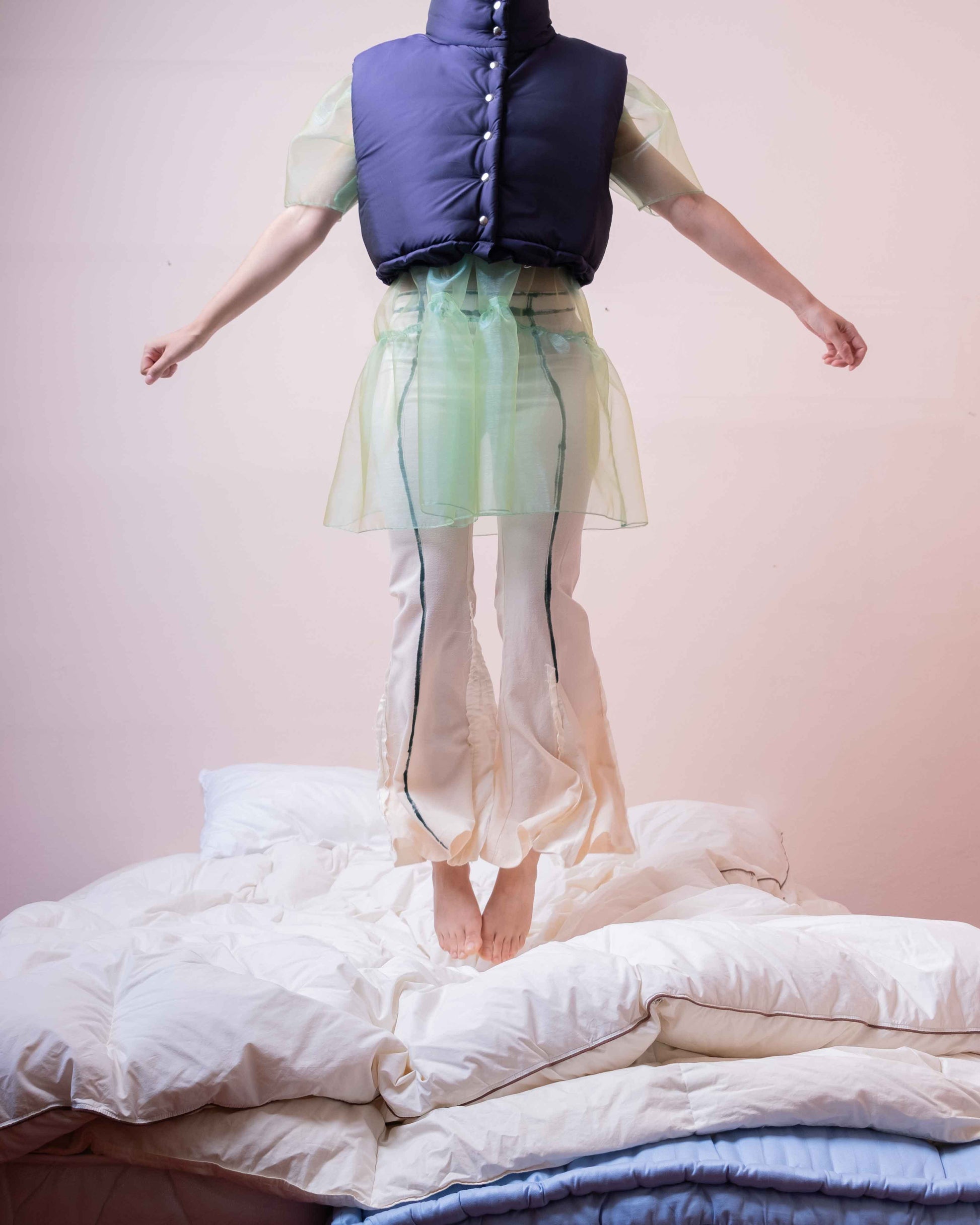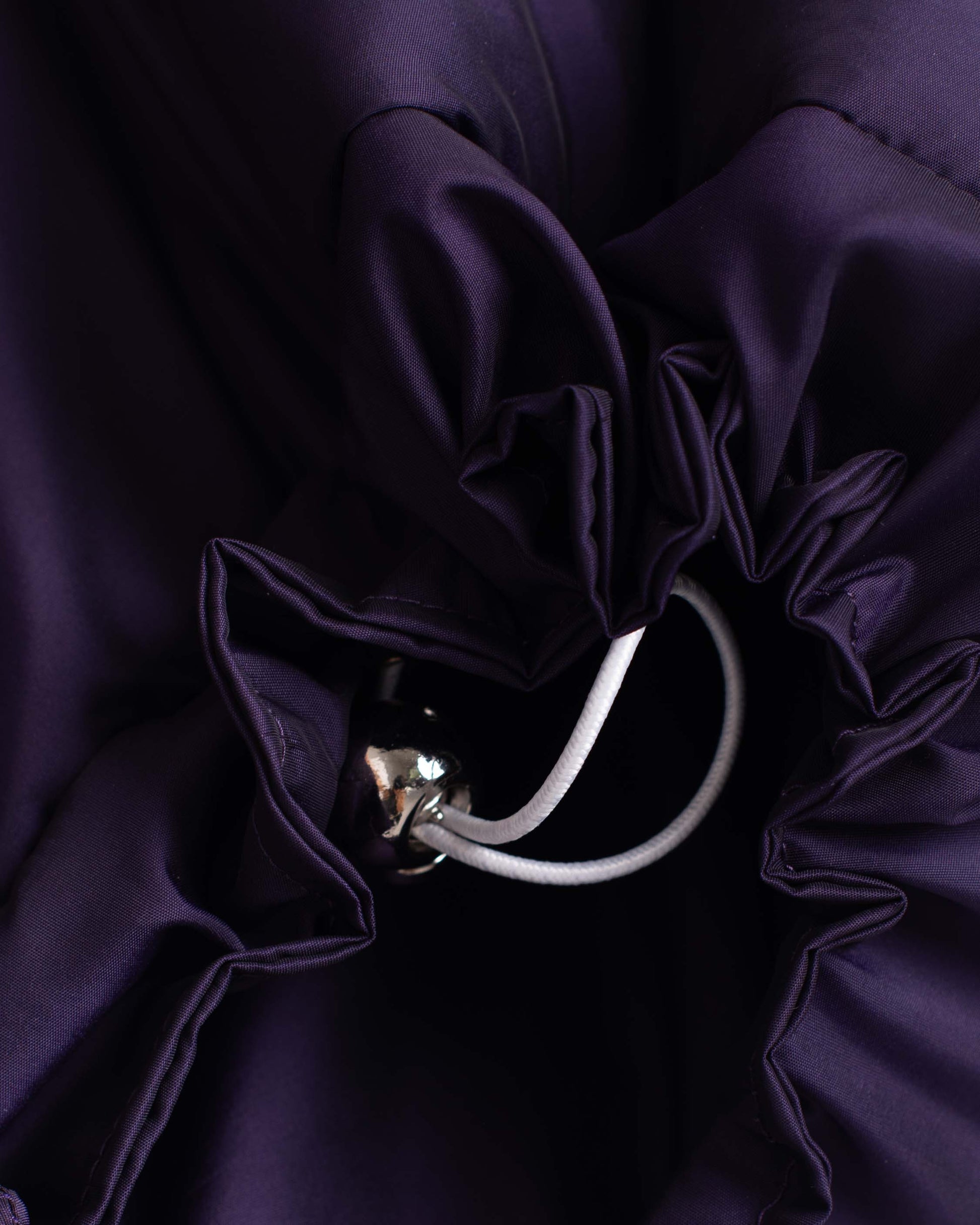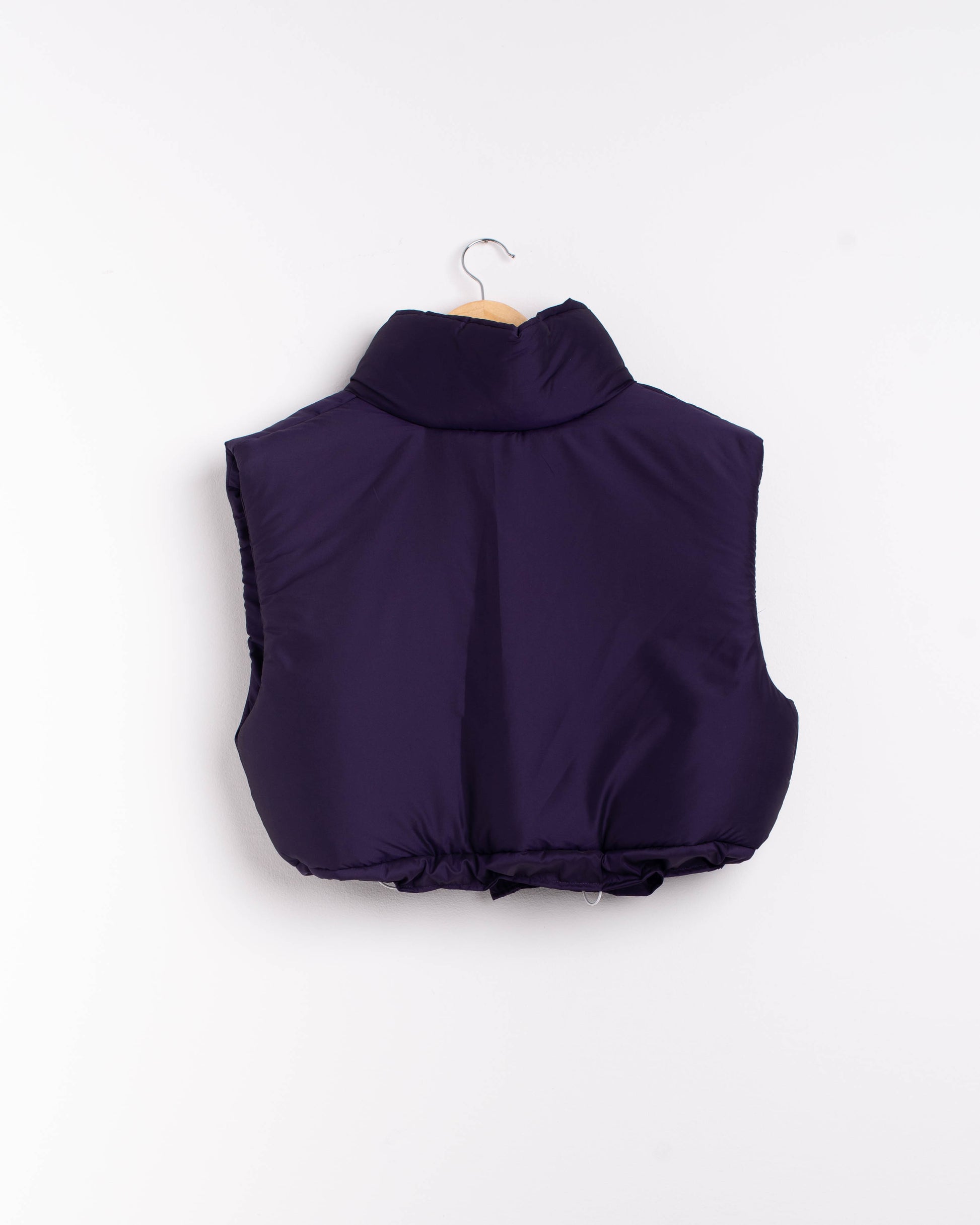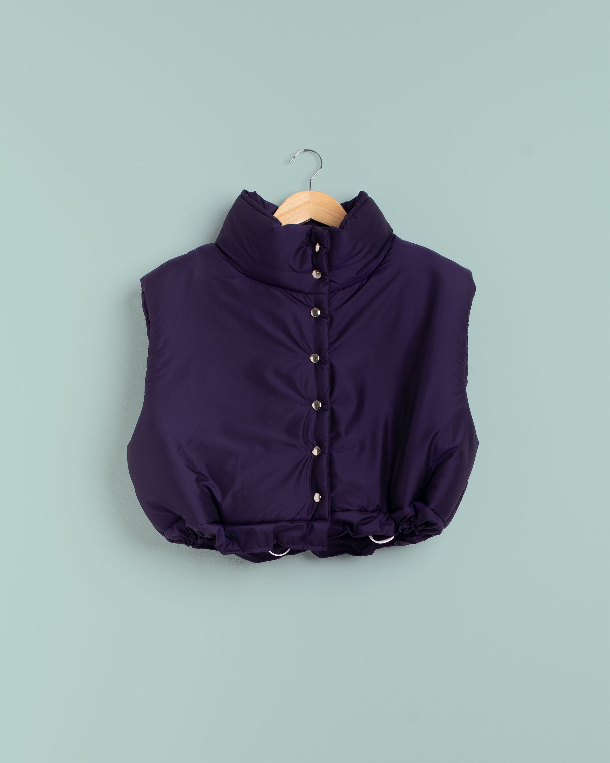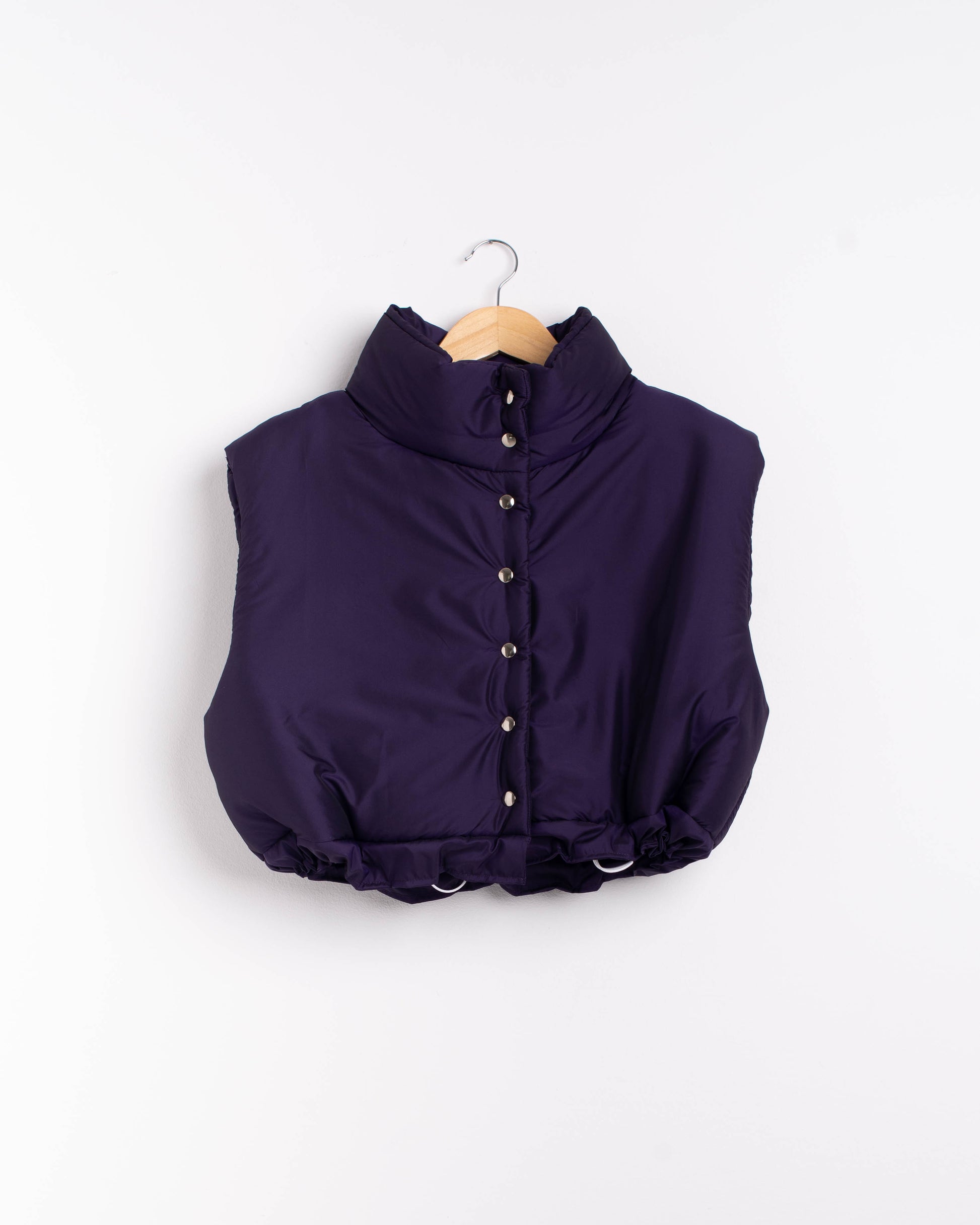 Padded vest with a square silhouette. Closure with metal buttons. Drawstring hem. Internal pocket.