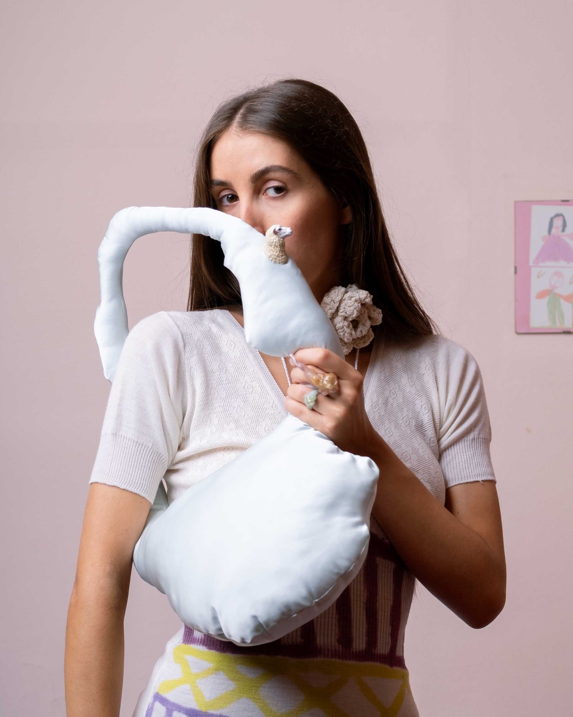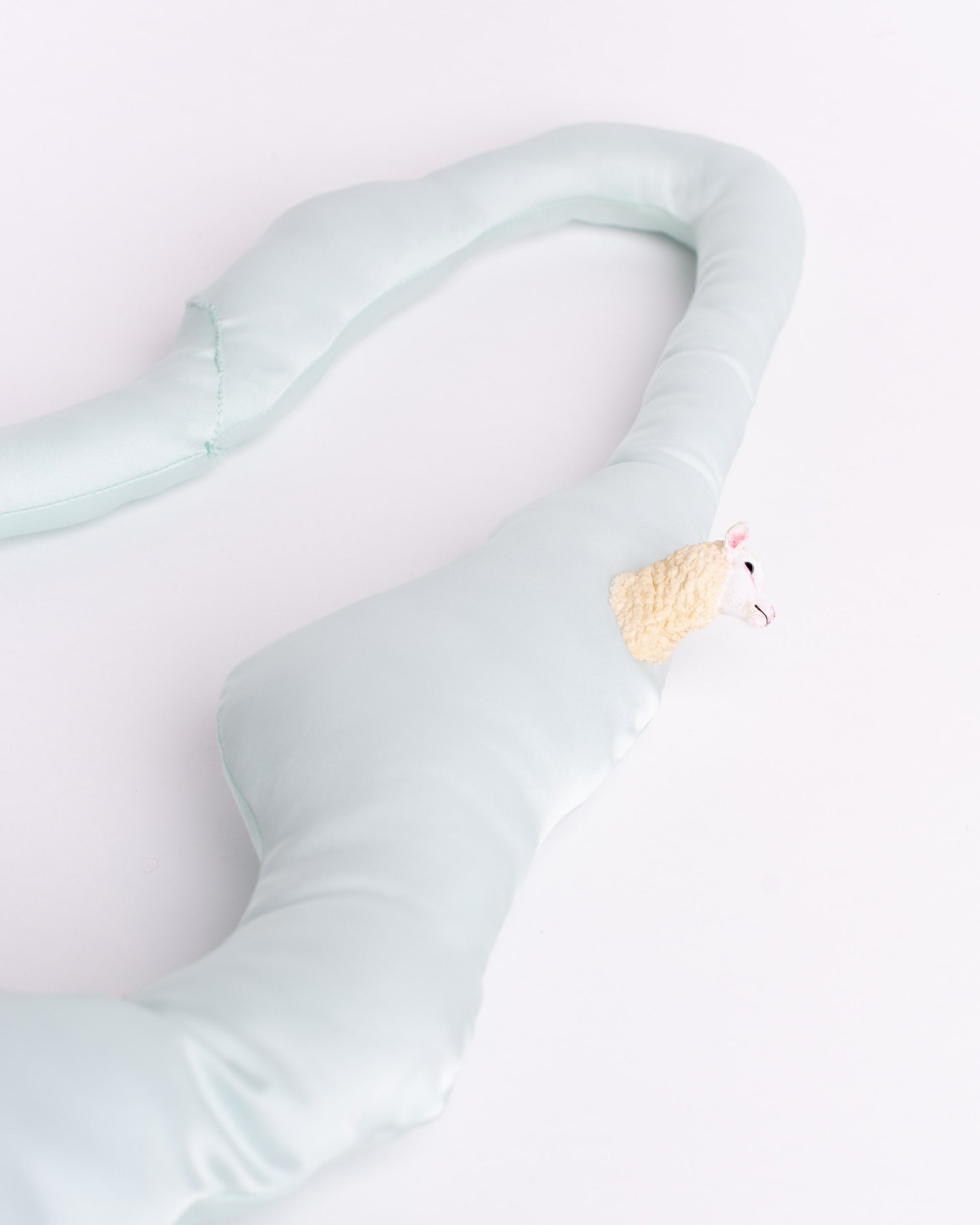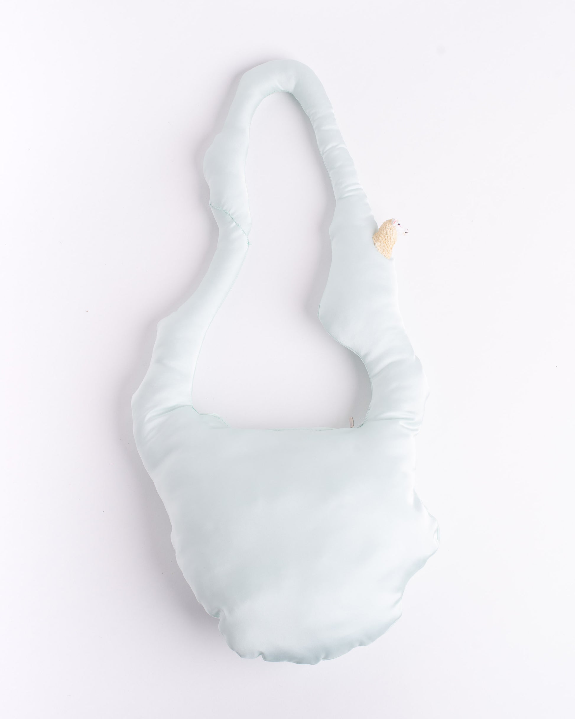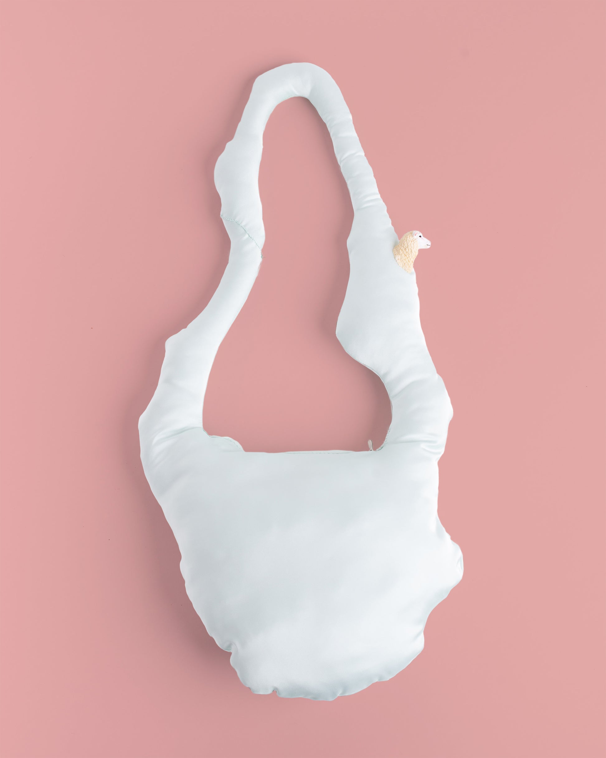Shoulder bag made of silk and polyester blend. Exterior in satin with a smooth and fresh touch, inside crease-resistant cotton padding. Central zip opening/closing. Sheep's head detail on the handle. Hand washable in cold water. 70x27 cm.