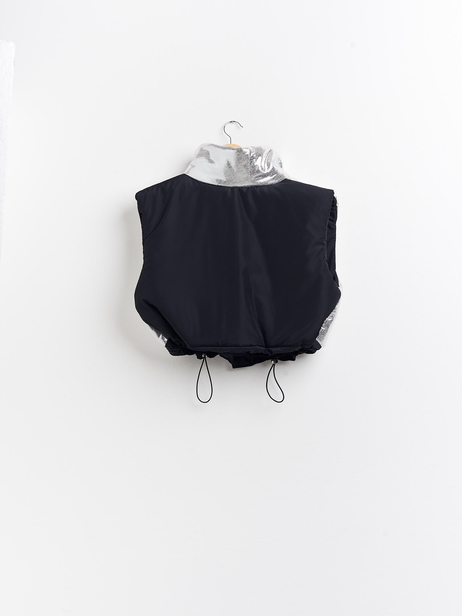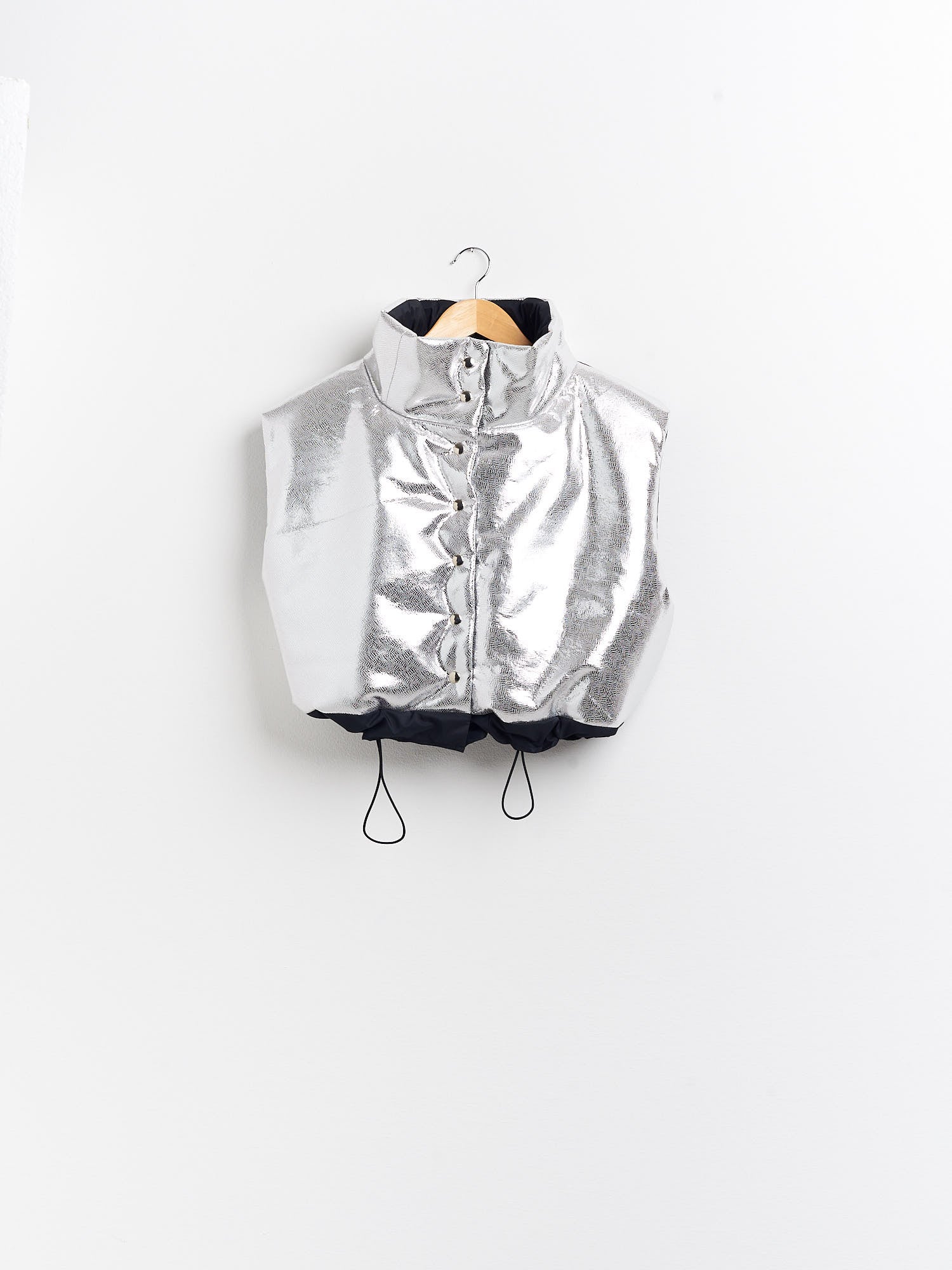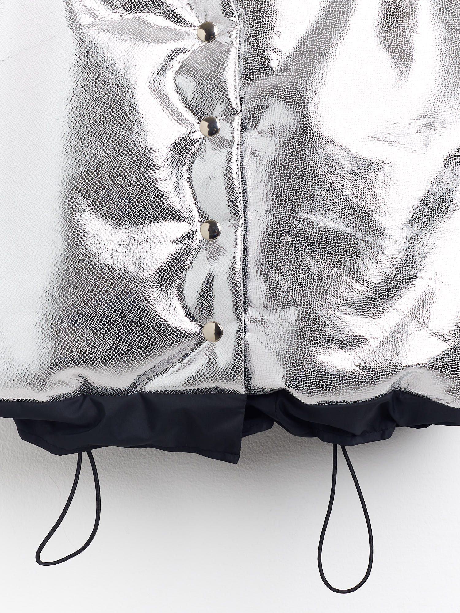 Gilet imbottito dalla silhouette squadrata. Chiusura con bottoni in metallo. Orlo con coulisse. Tasca interna. Pelli pregiate al 100% provenienti da scarti di aziende italiane. Ogni pezzo è unico e realizzato a mano in Italia.