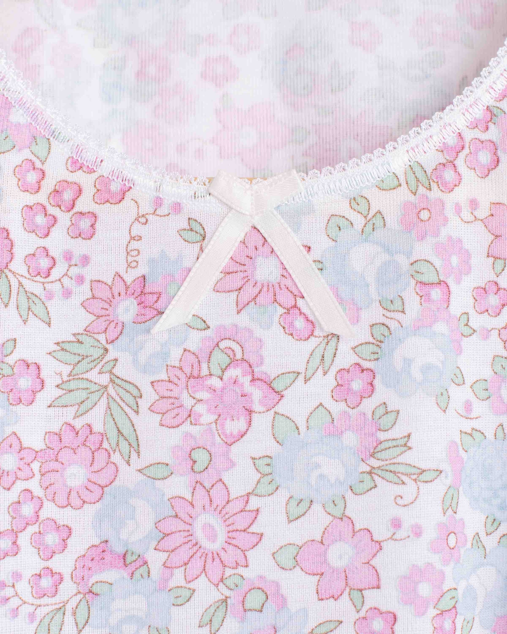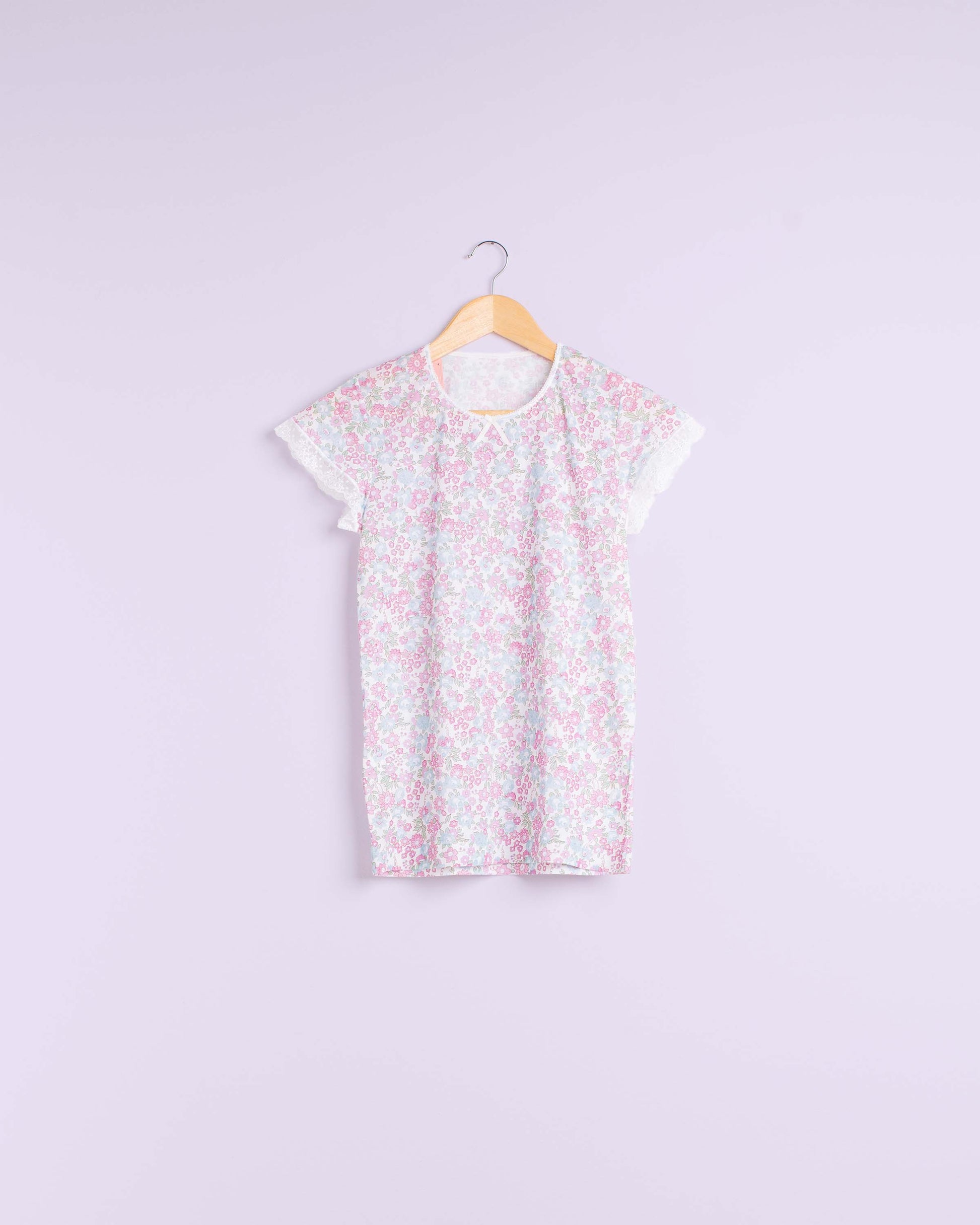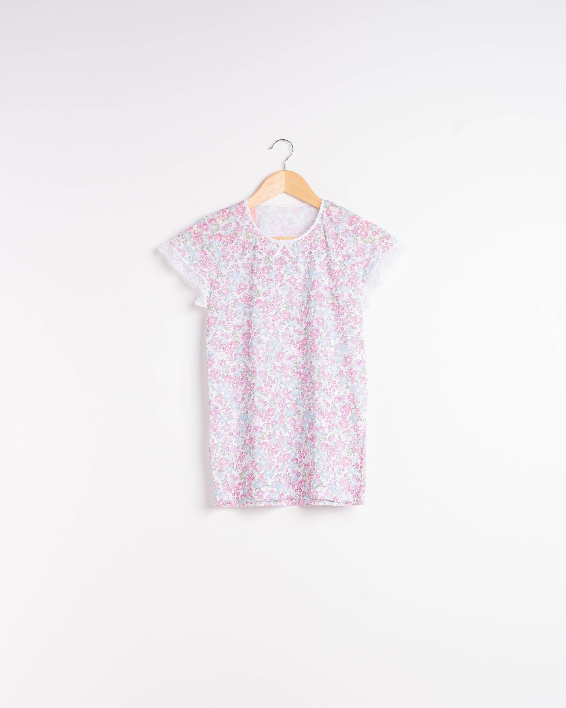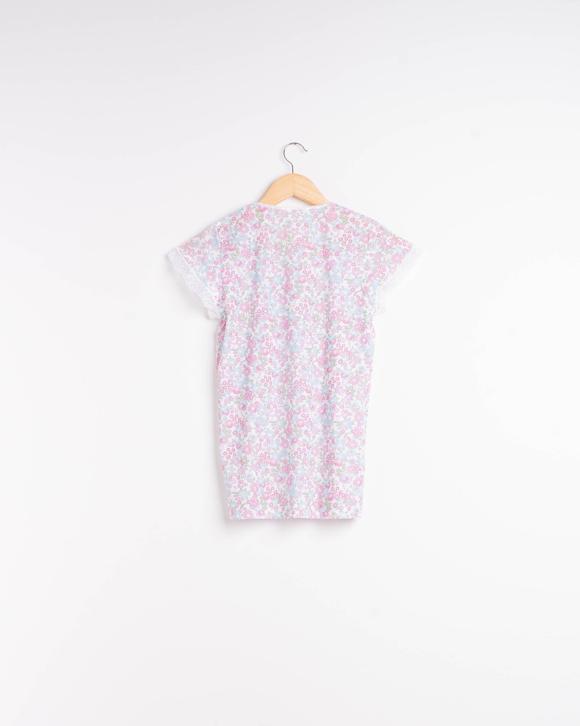 Maglietta in cotone con disegni di fiorellini, dettagli in pizzo e fiocchetto al centro. Vintage, nuova con cartellino