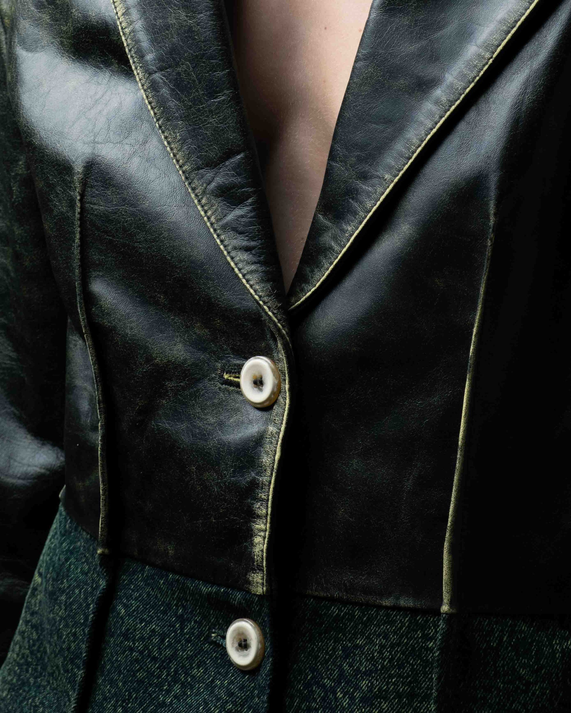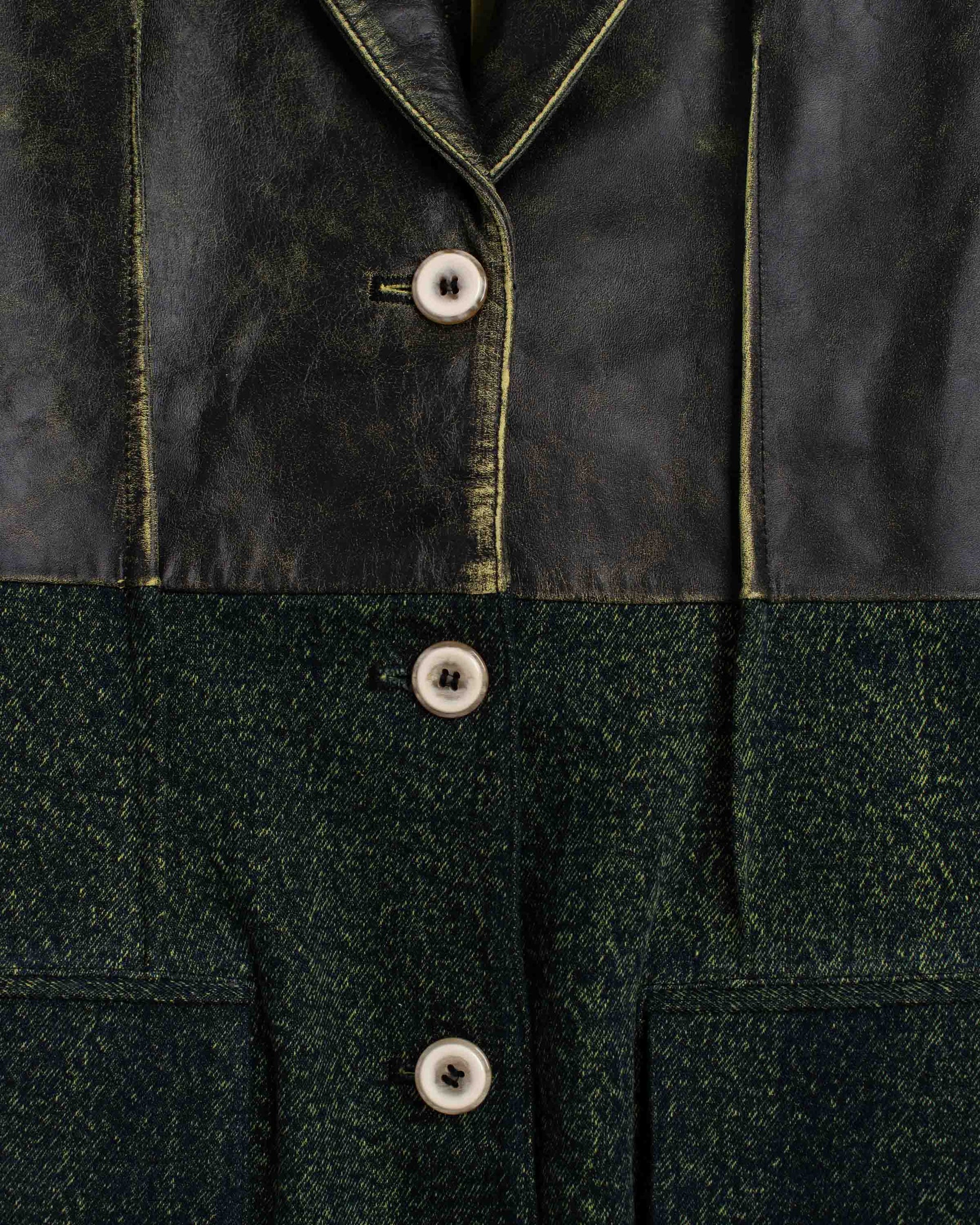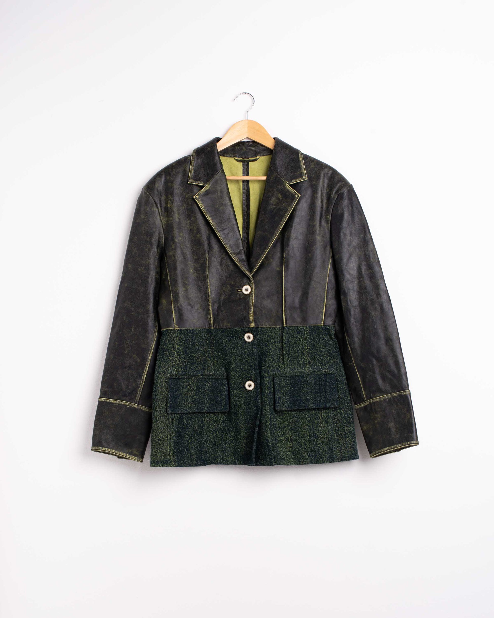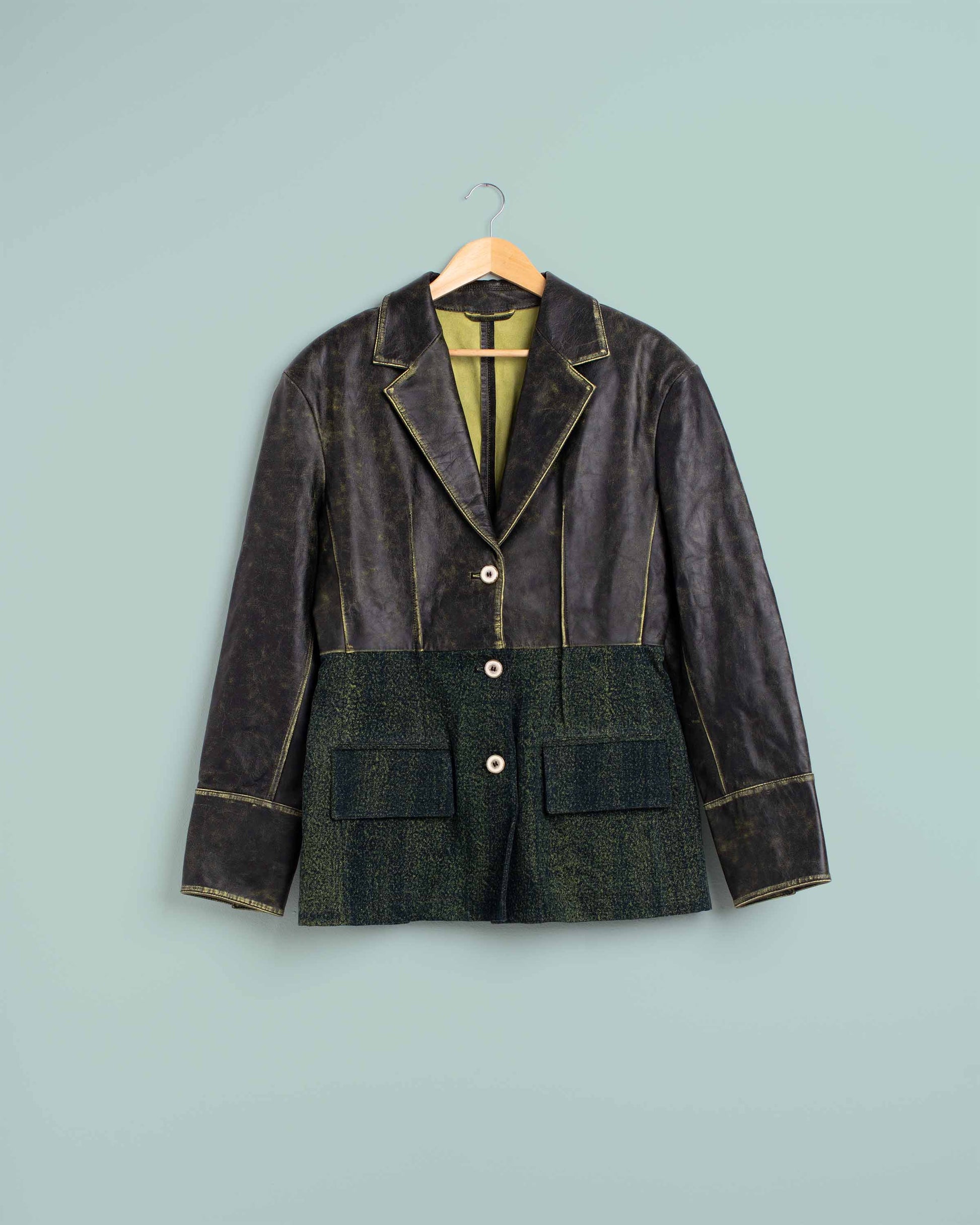 Giacca monopetto in pelle base gialla, tintura nera. Chiusura con bottoni frontali. La parte inferiore in denim sbiancato e tinto di verde presenta una tasca esterna.