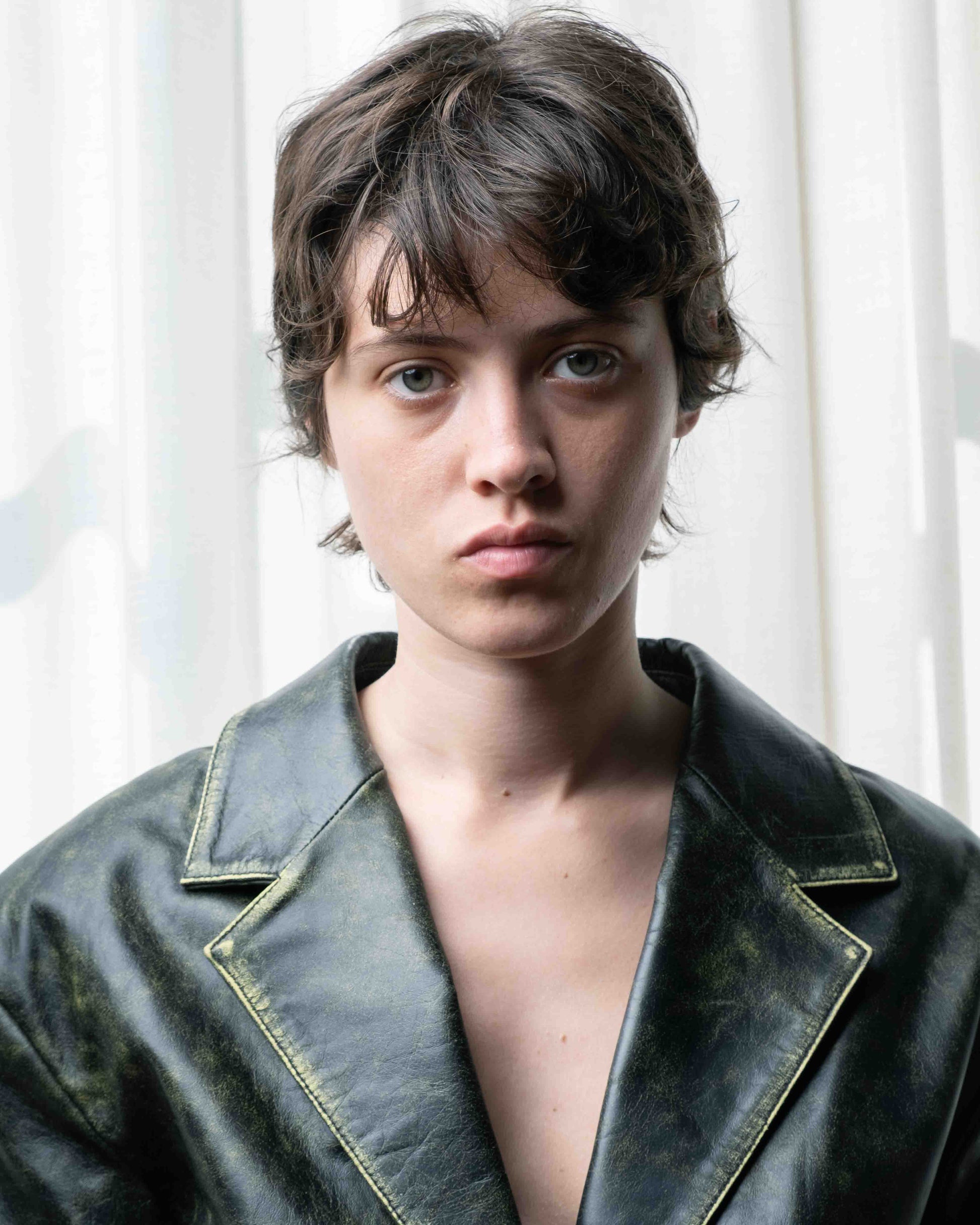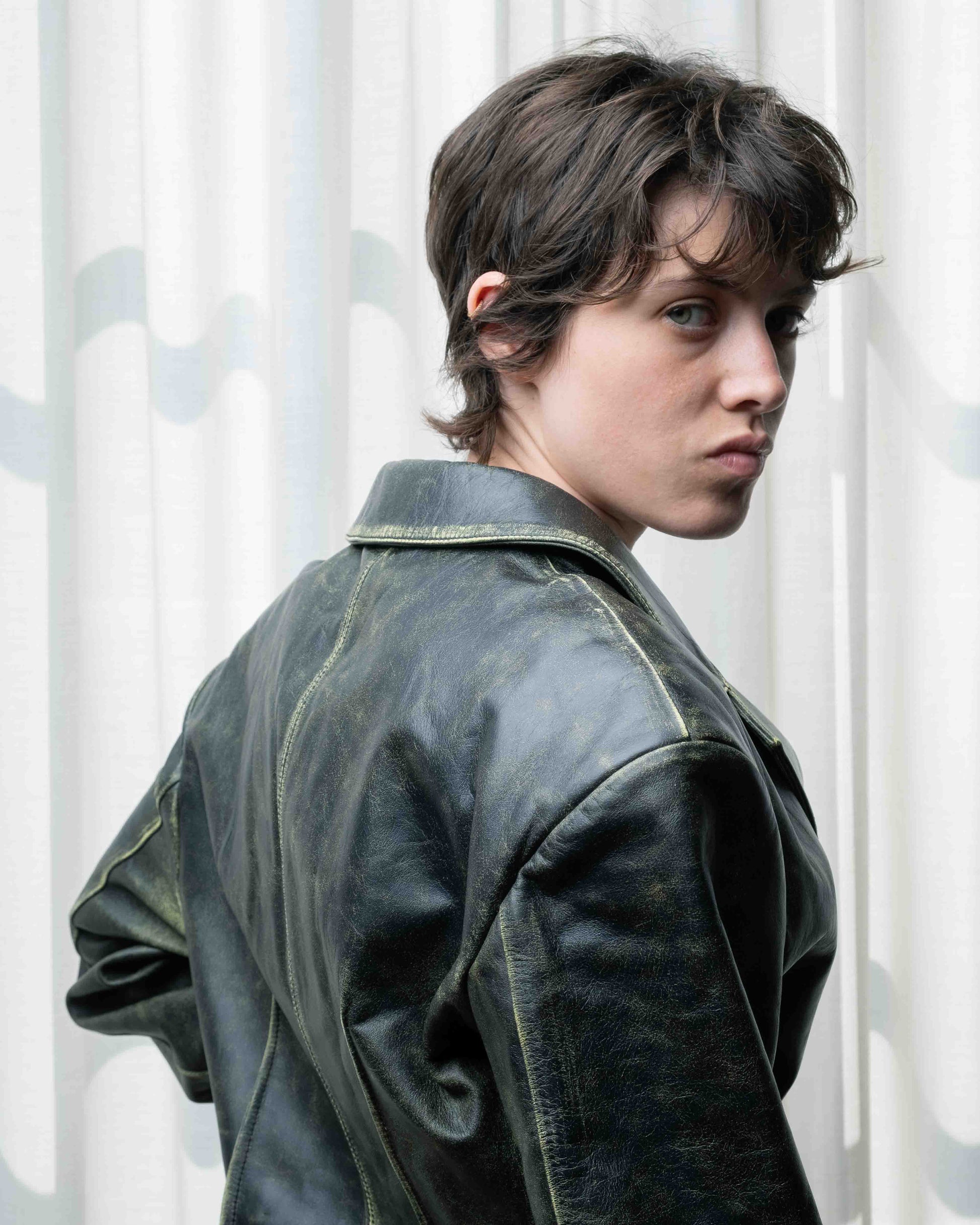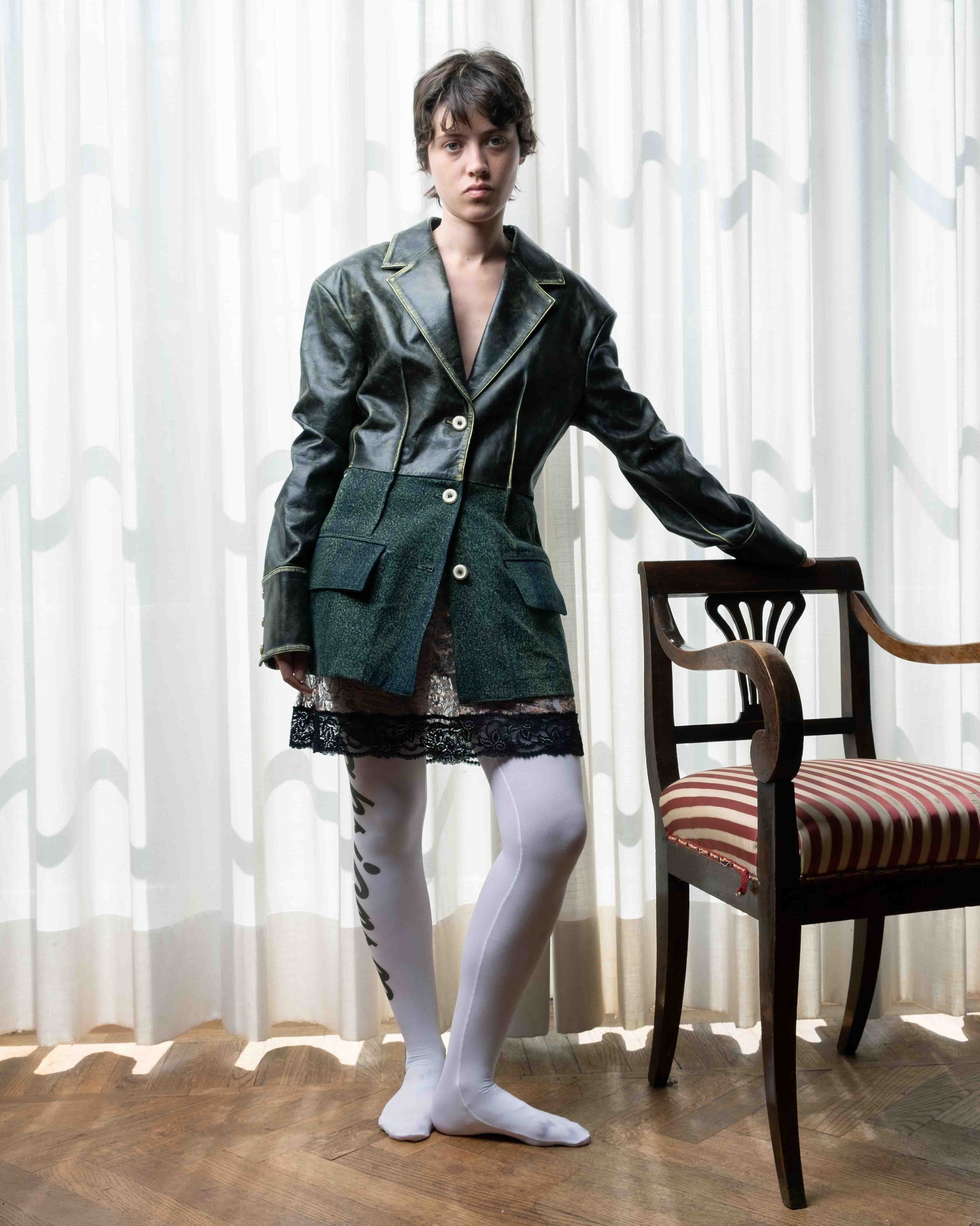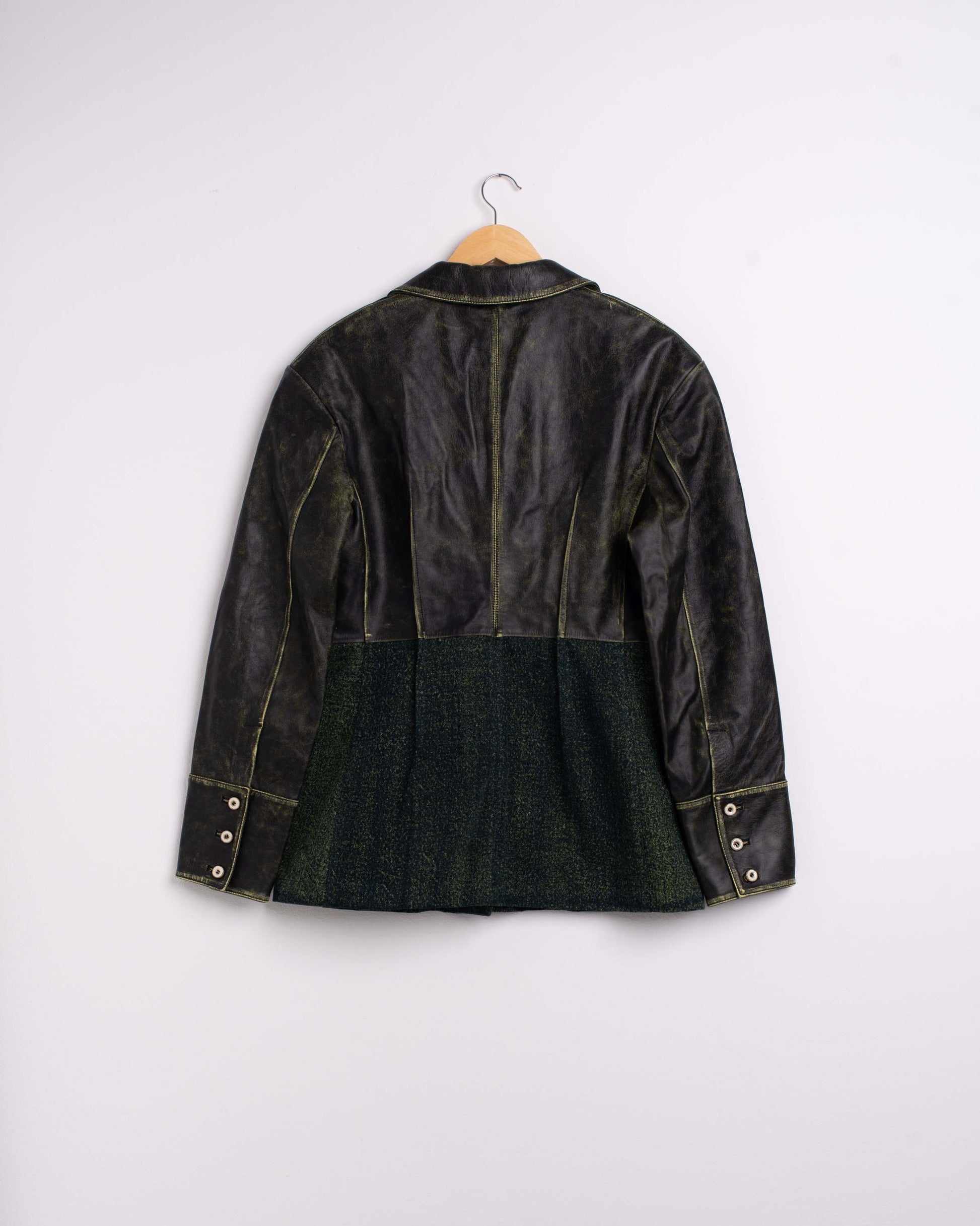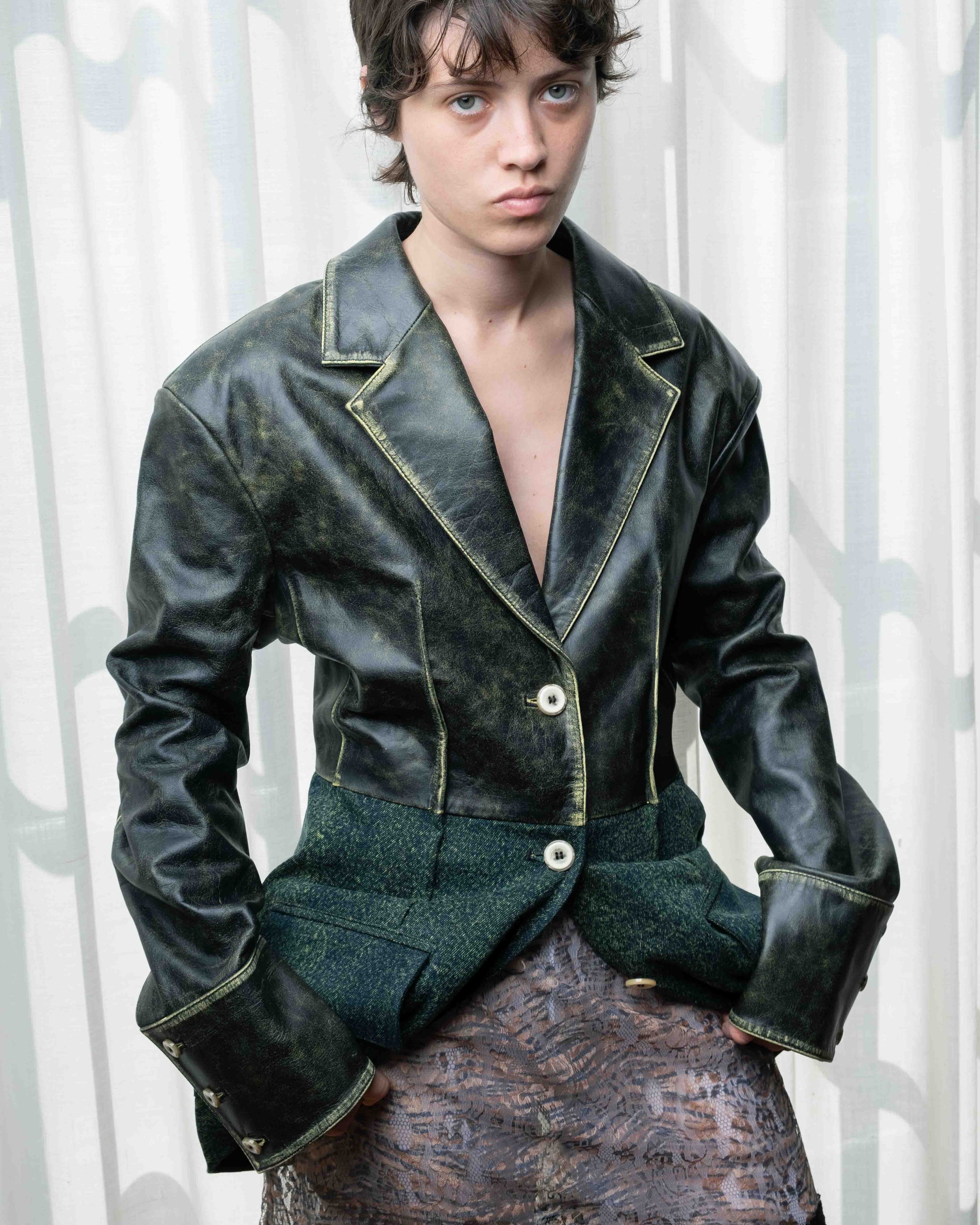 Giacca monopetto in pelle base gialla, tintura nera. Chiusura con bottoni frontali. La parte inferiore in denim sbiancato e tinto di verde presenta una tasca esterna.
