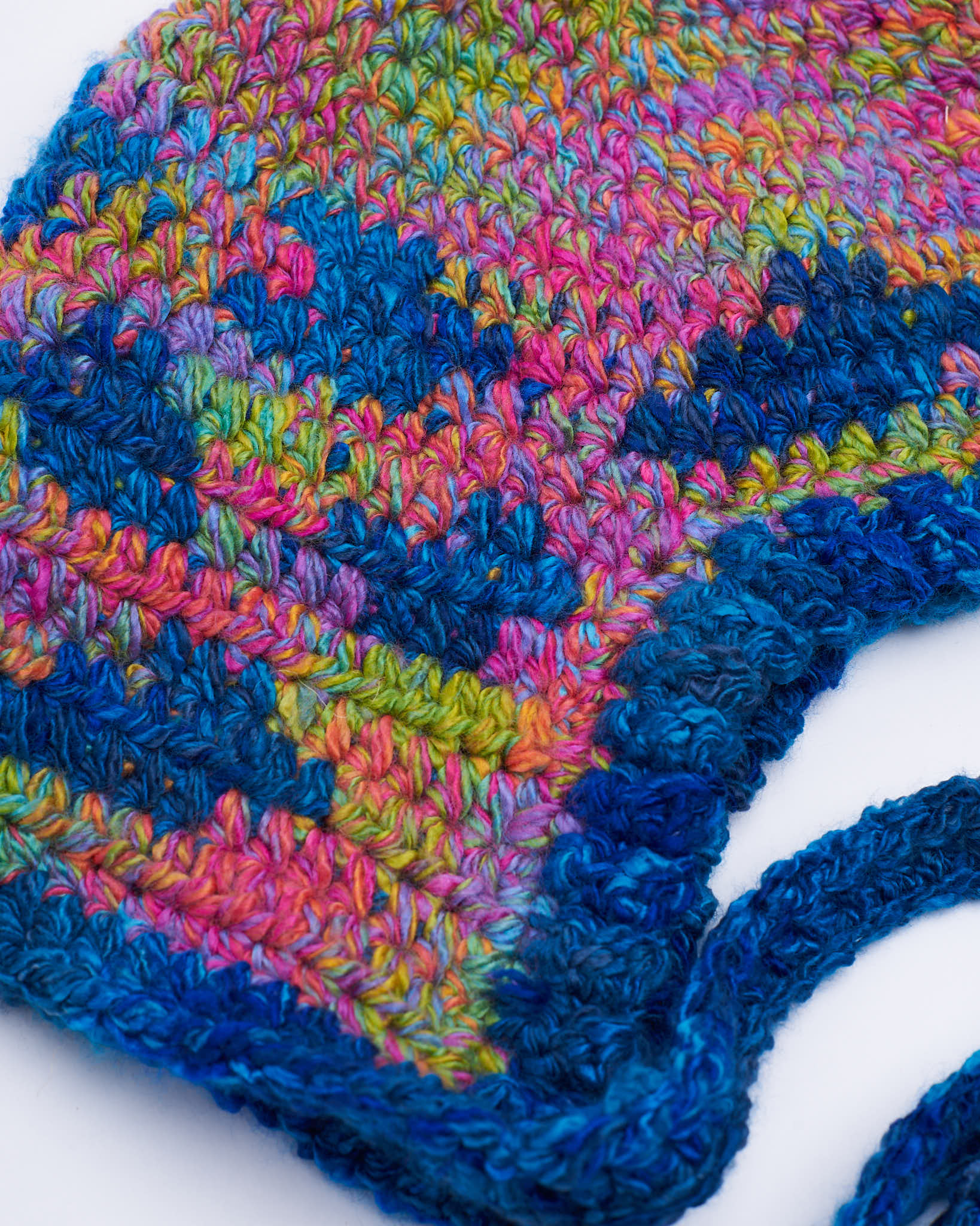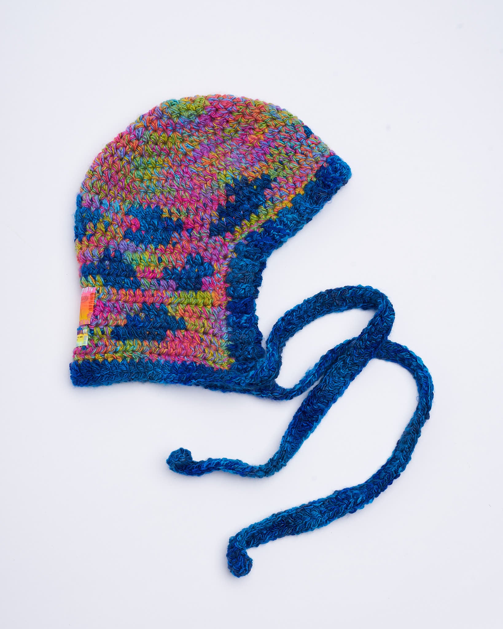 Cappello realizzato all'uncinetto in filato di lana merino multicolor. Lavare a mano.
