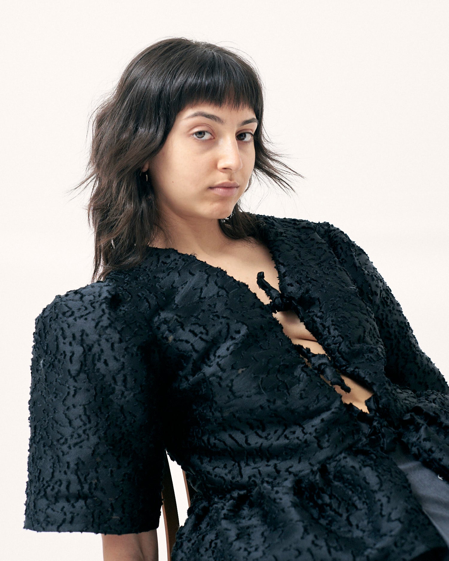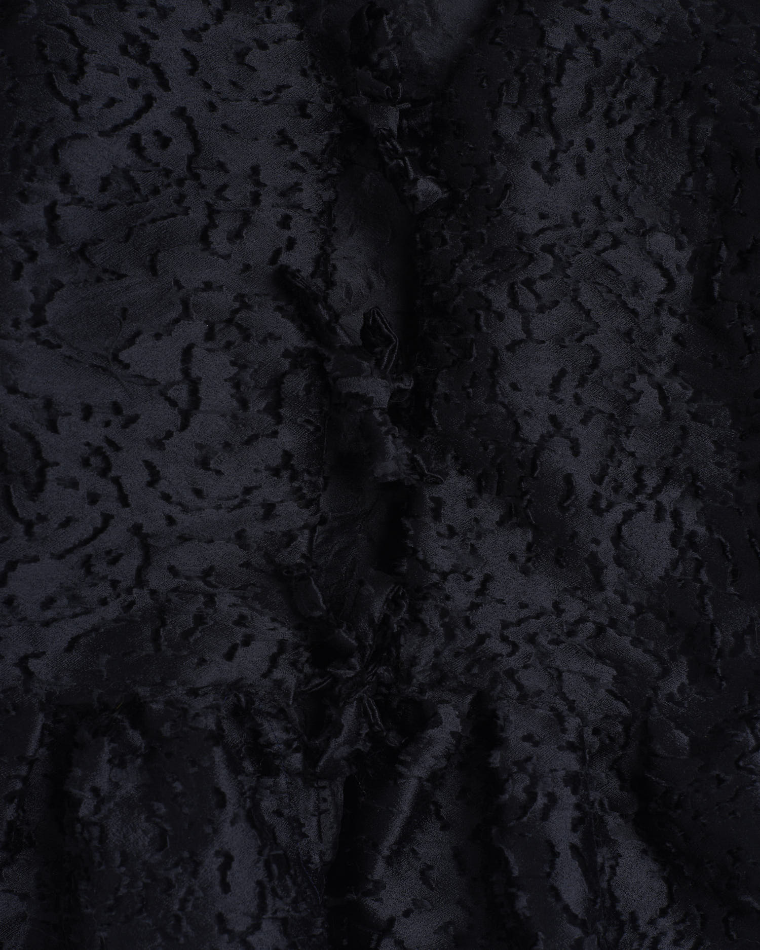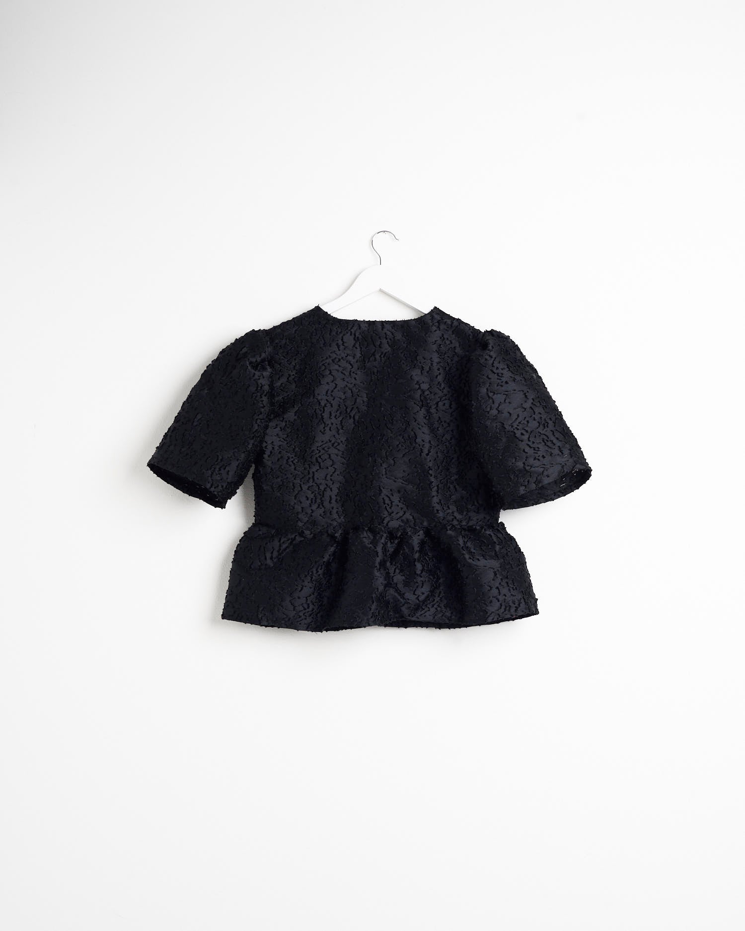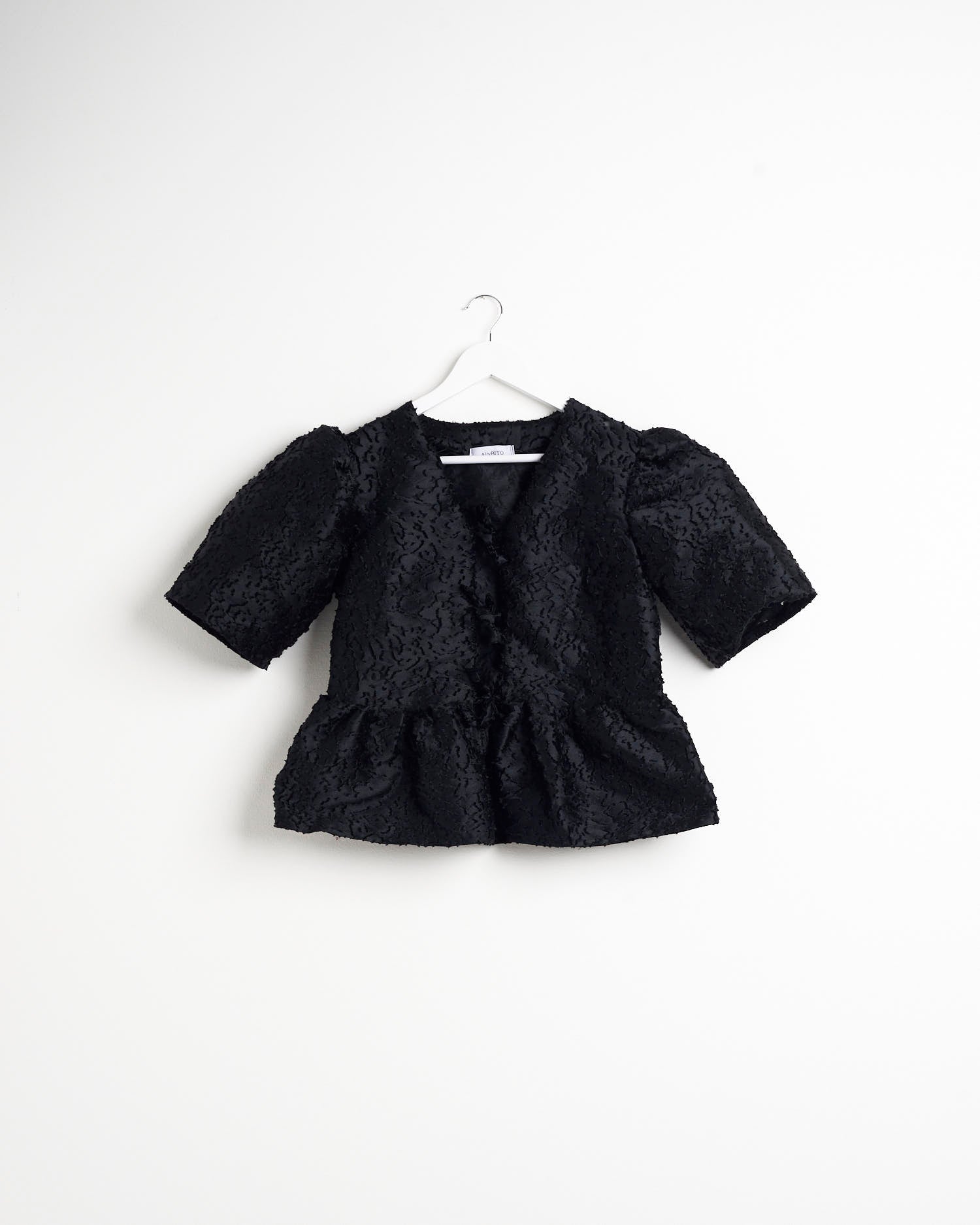 Top realizzato in tessuto broccato deadstock con maniche ampie e arriccio, chiusura sul davanti con lacci.