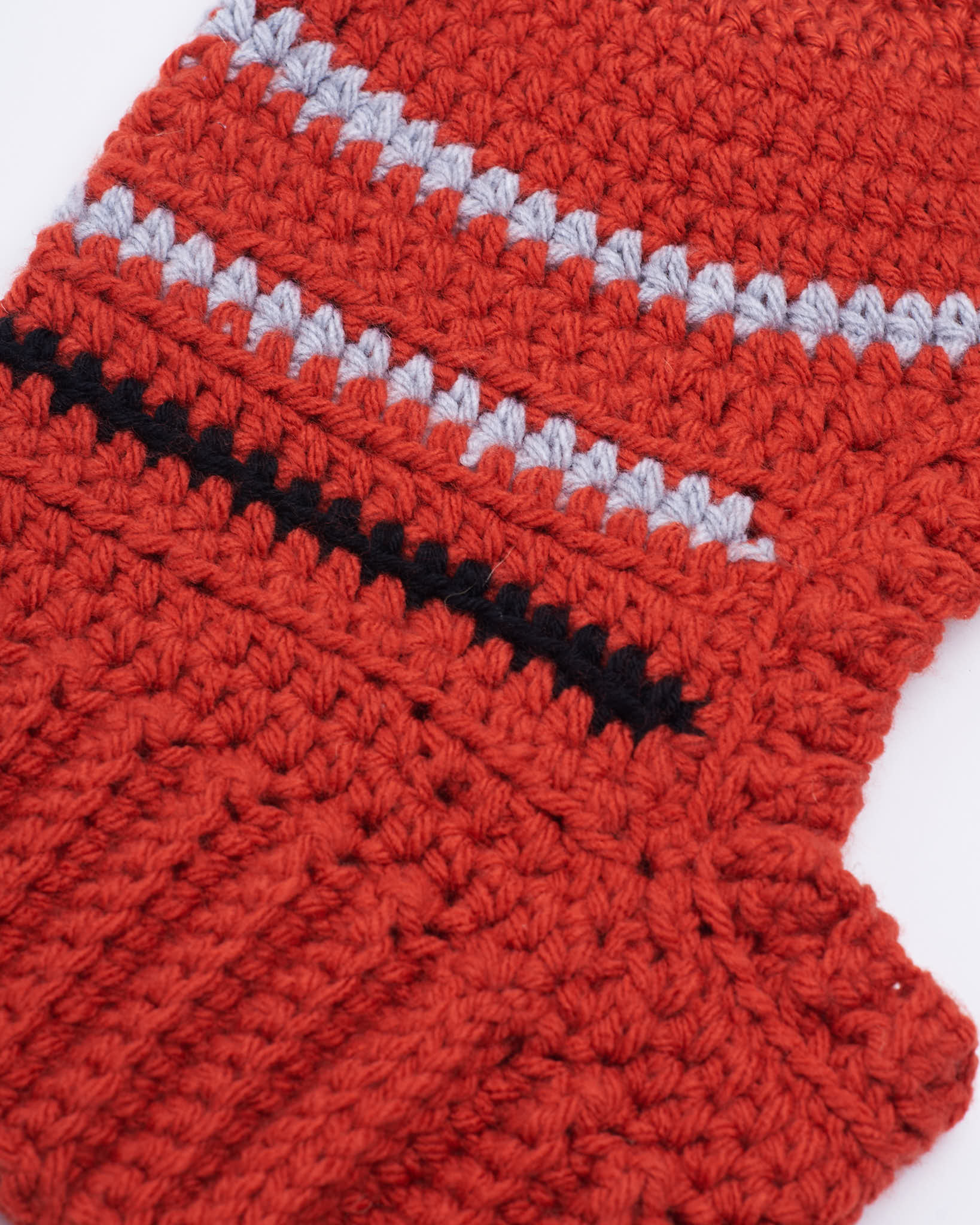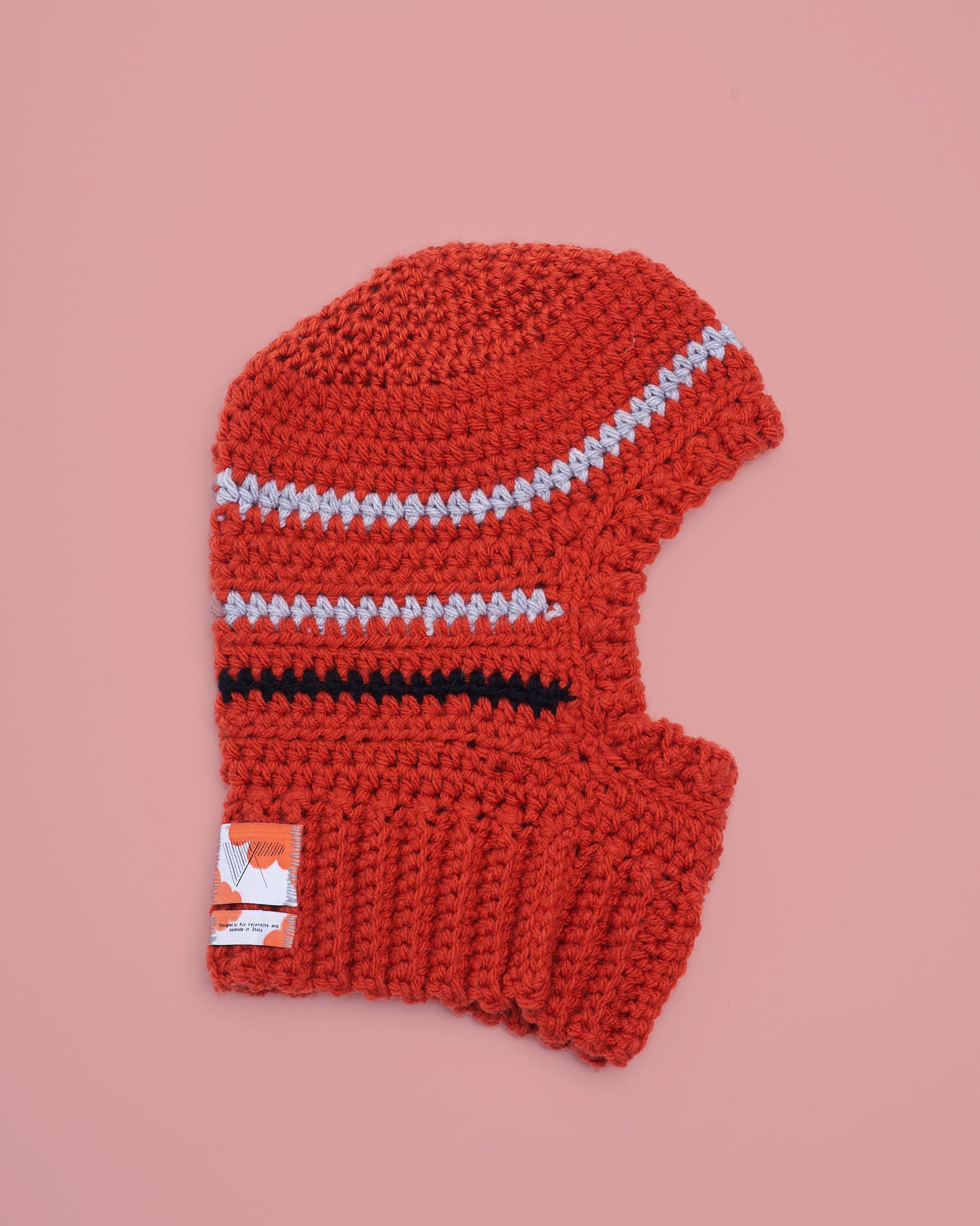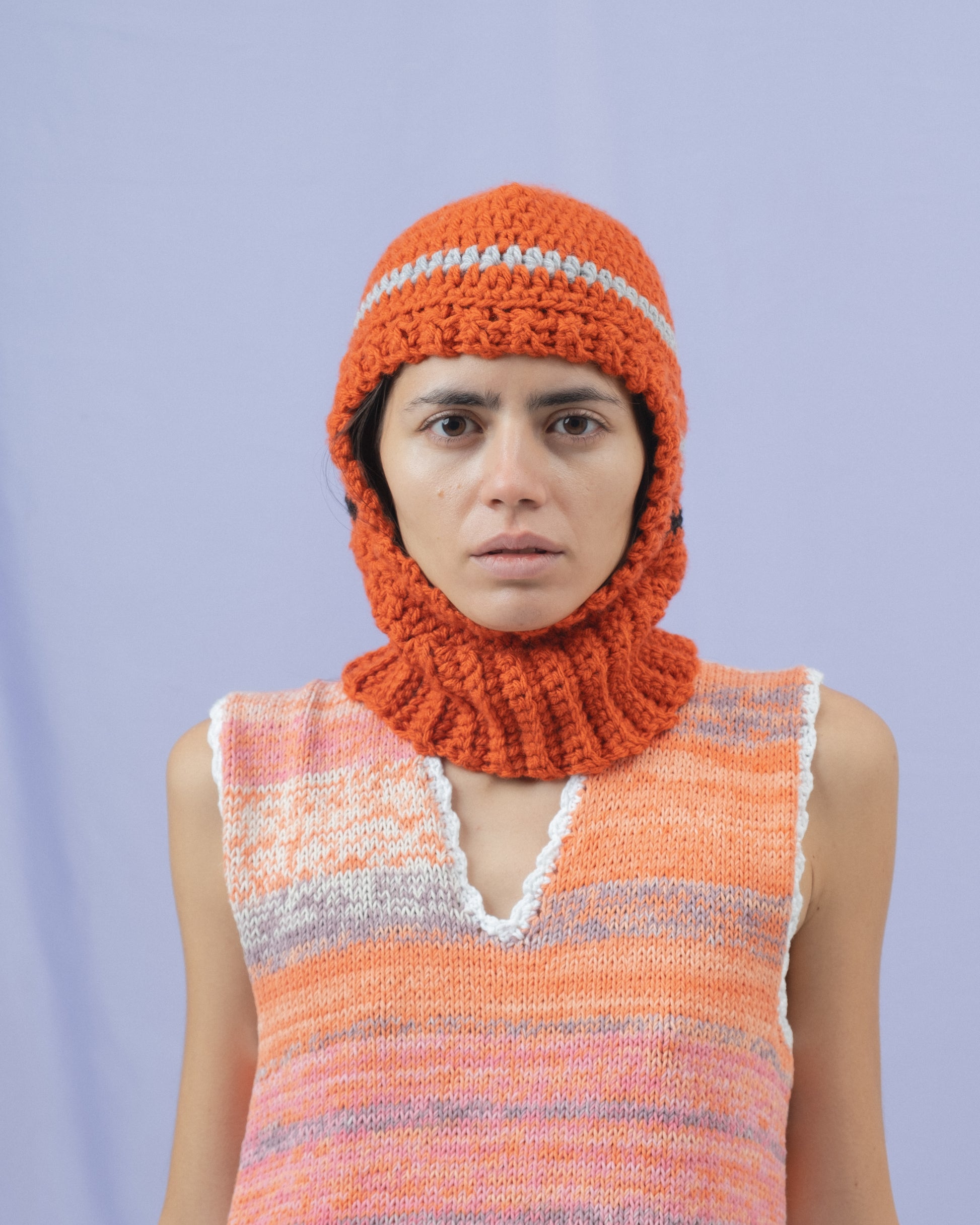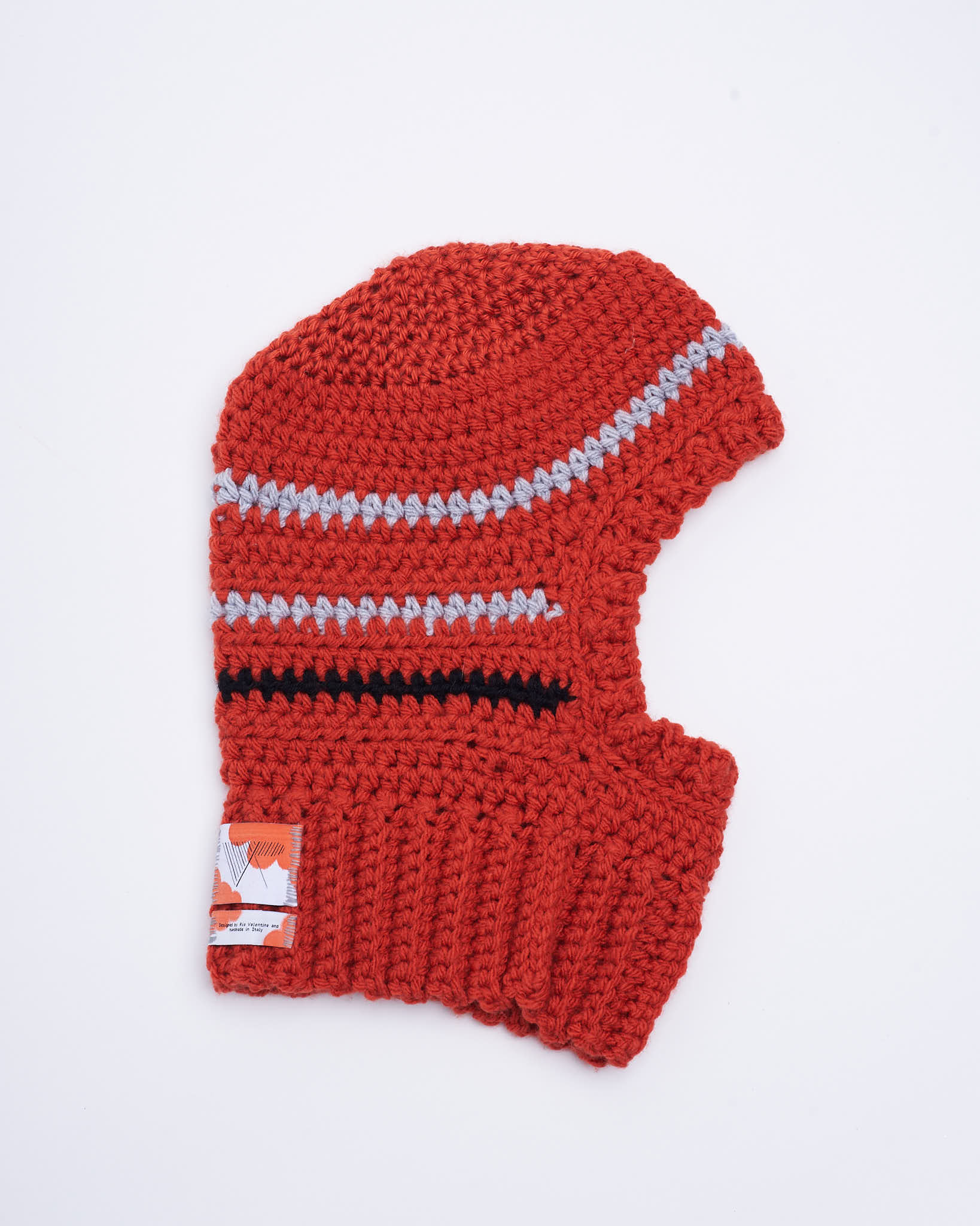 Balaclava all'uncinetto ispirato al pianeta Marte. I filati sono acrilici sono ultra morbidi. Può essere indossato da soggetti intolleranti alla lana e vegani. Arancione con dettagli grigi e neri che rappresentano le scie chimiche nel cielo. Si adatta a qualsiasi dimensione. Lavare a mano.