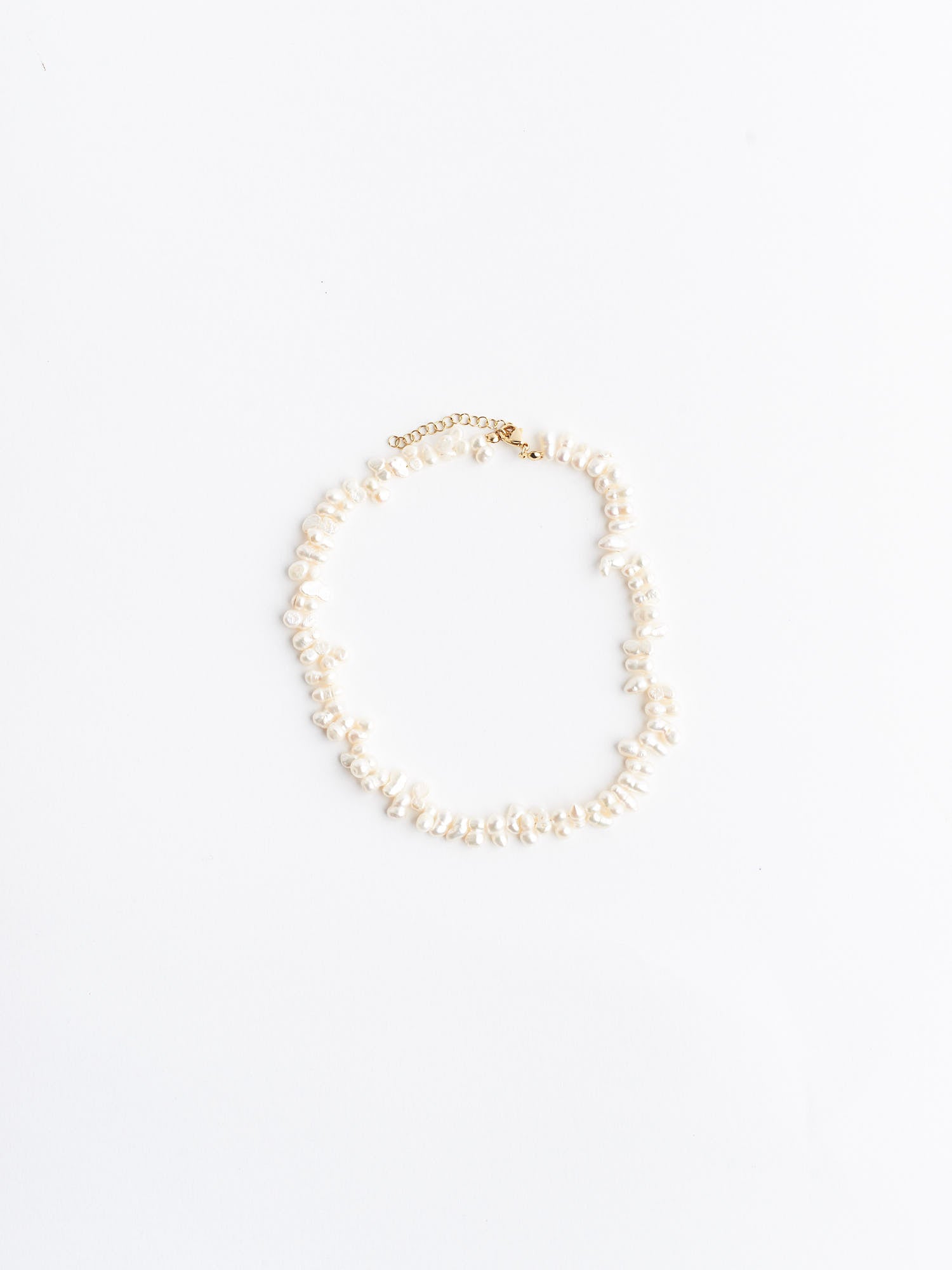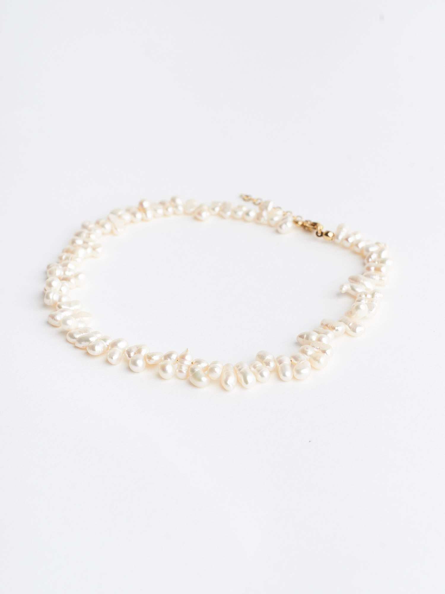Collana realizzata interamente a mano in acciaio chirurgico placcata in oro 18k. È composta da perle di fiume naturali dai toni bianco/avorio irregolari nelle dimensioni e nella forma. Ipoallergenica e senza nichel. Lunghezza standard: 37cm. Estensione: 5cm. Ogni gioiello è realizzato su ordinazione con un processo che prevede la selezione accurata di ogni perla e pietra per ottenere armonia in tutte le sue componenti.