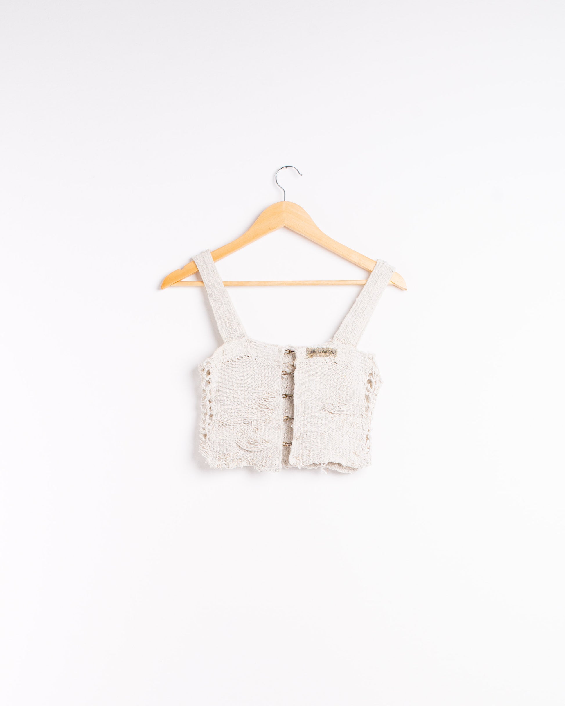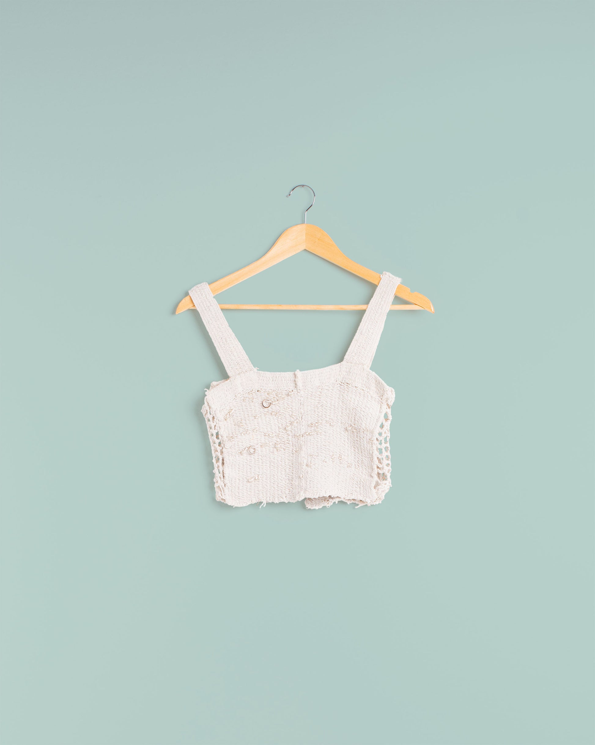 Top in cotone realizzato con un filato ottenuto dal riciclo di capi in denim.