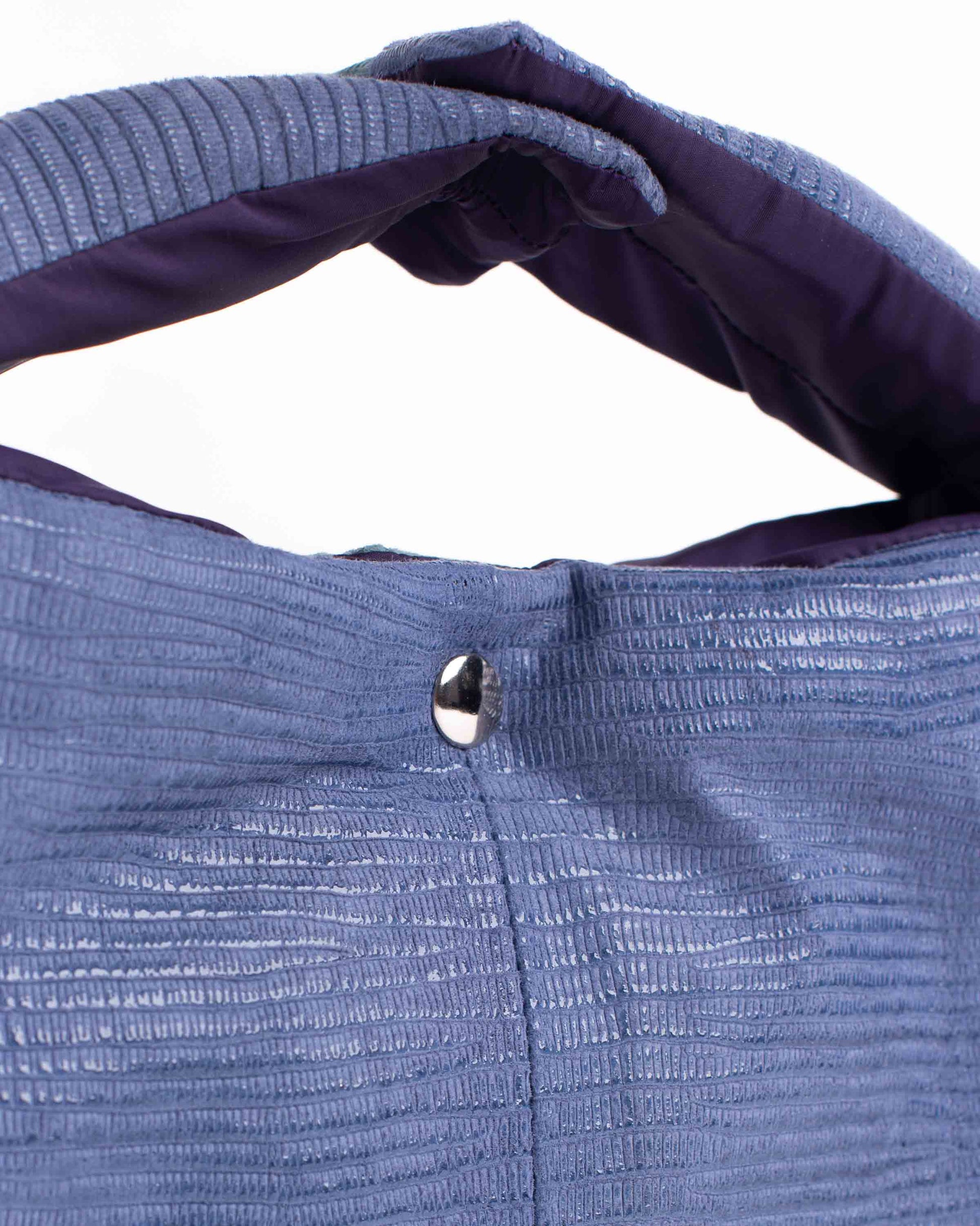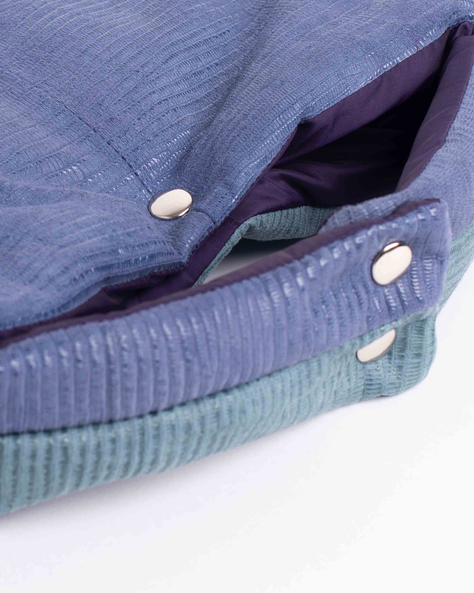 Rivestimento esterno in pelle, color azzurro/blu. Rivestimento interno in nylon color vino.