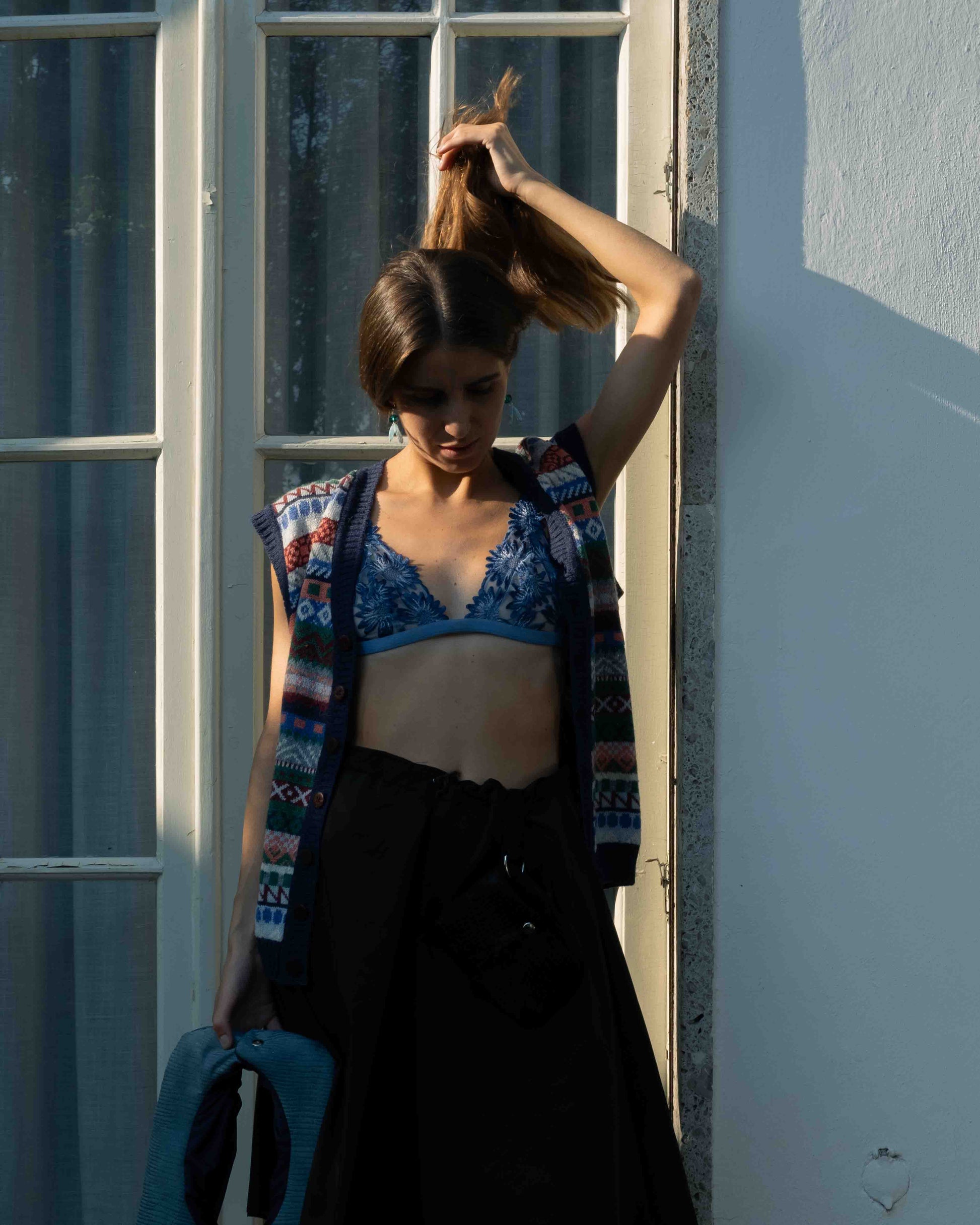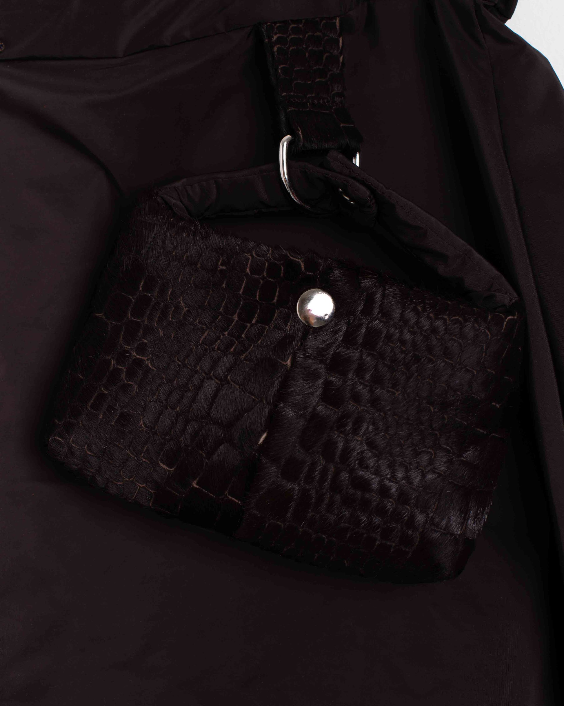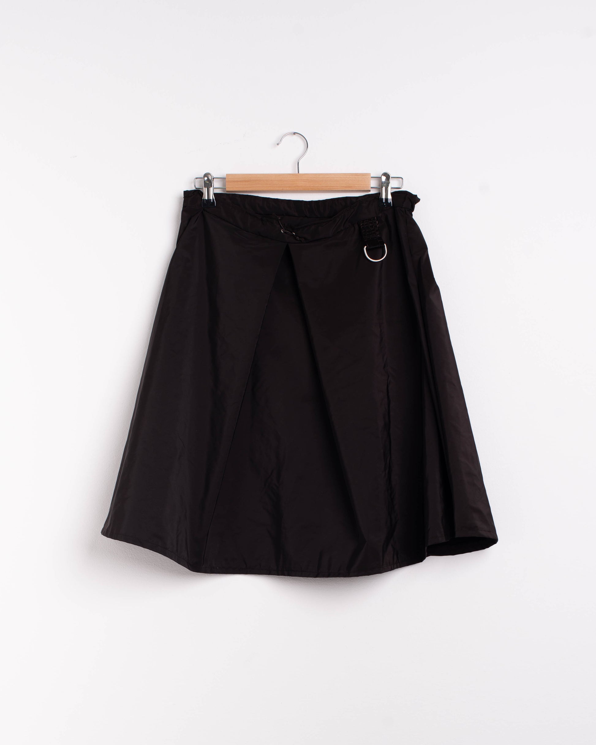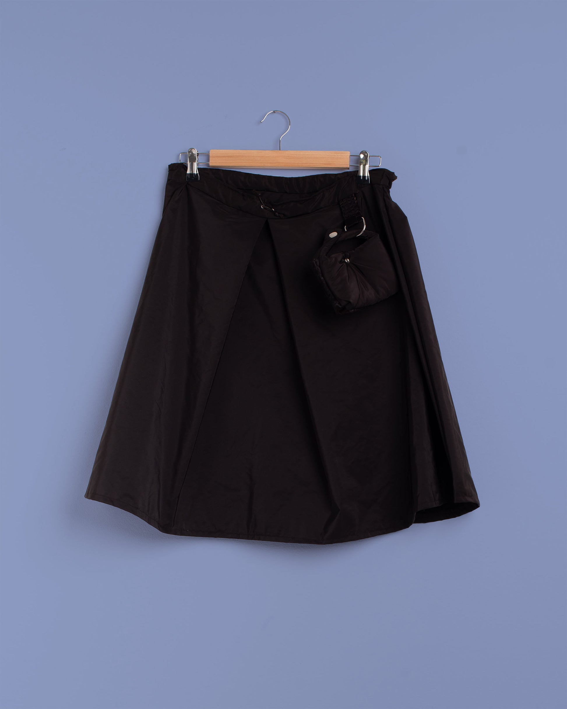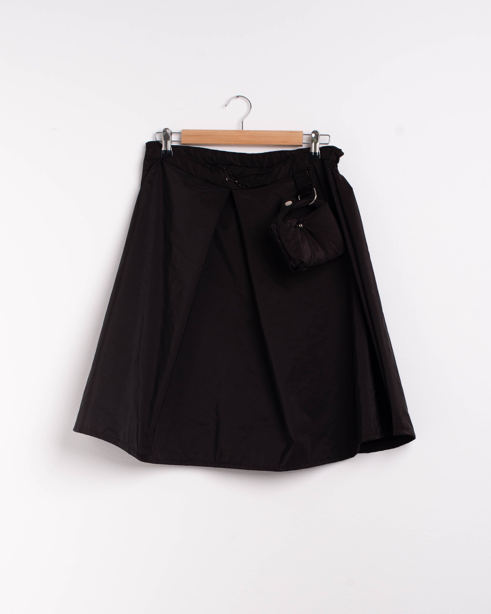 Gonna con piega a cannone interna. Cintura con coulisse. Piccola Bag abbinata con dettaglio in pelle riciclata. Pelli pregiate al 100% provenienti da scarti di aziende italiane. Ogni pezzo è unico e realizzato a mano in Italia.