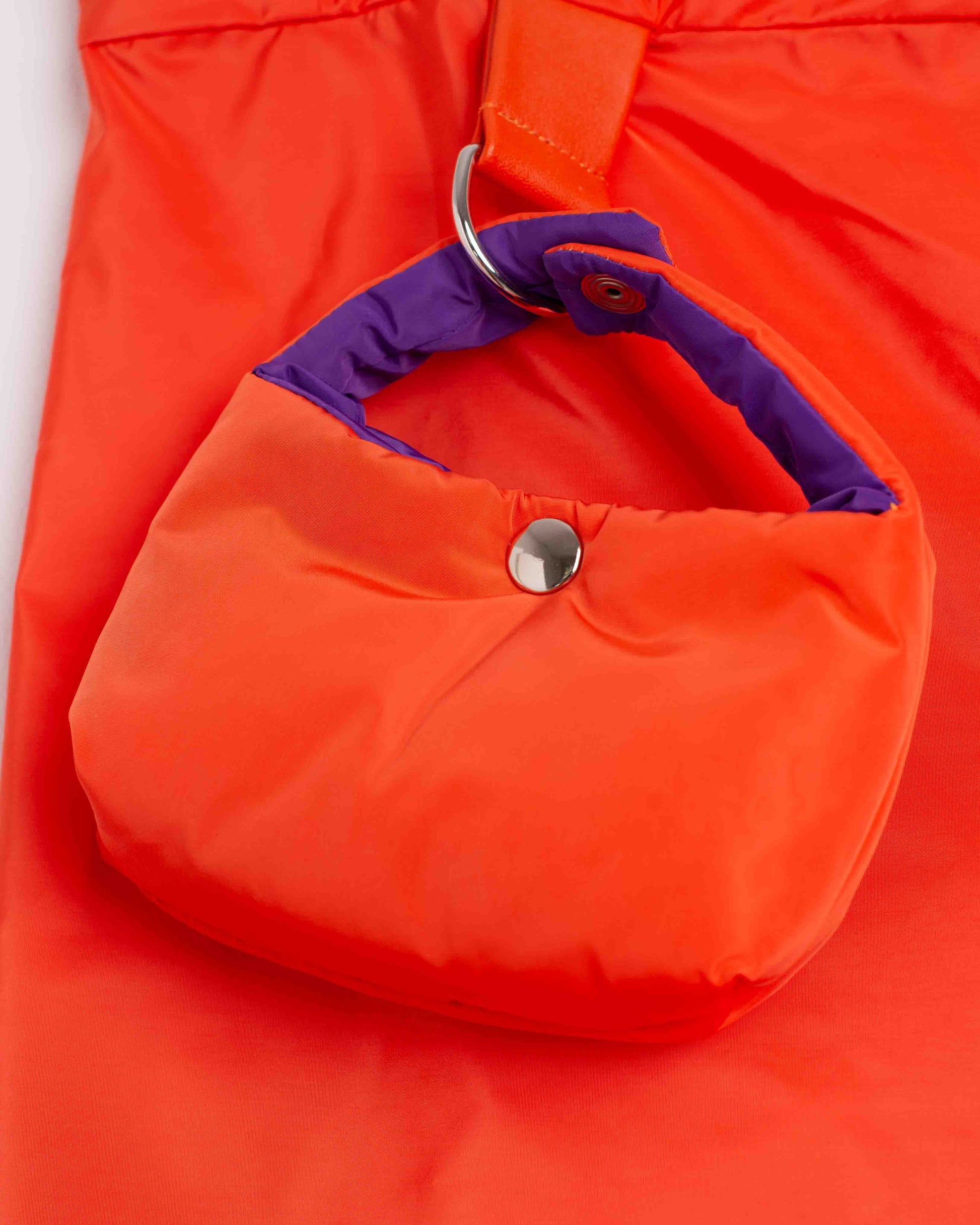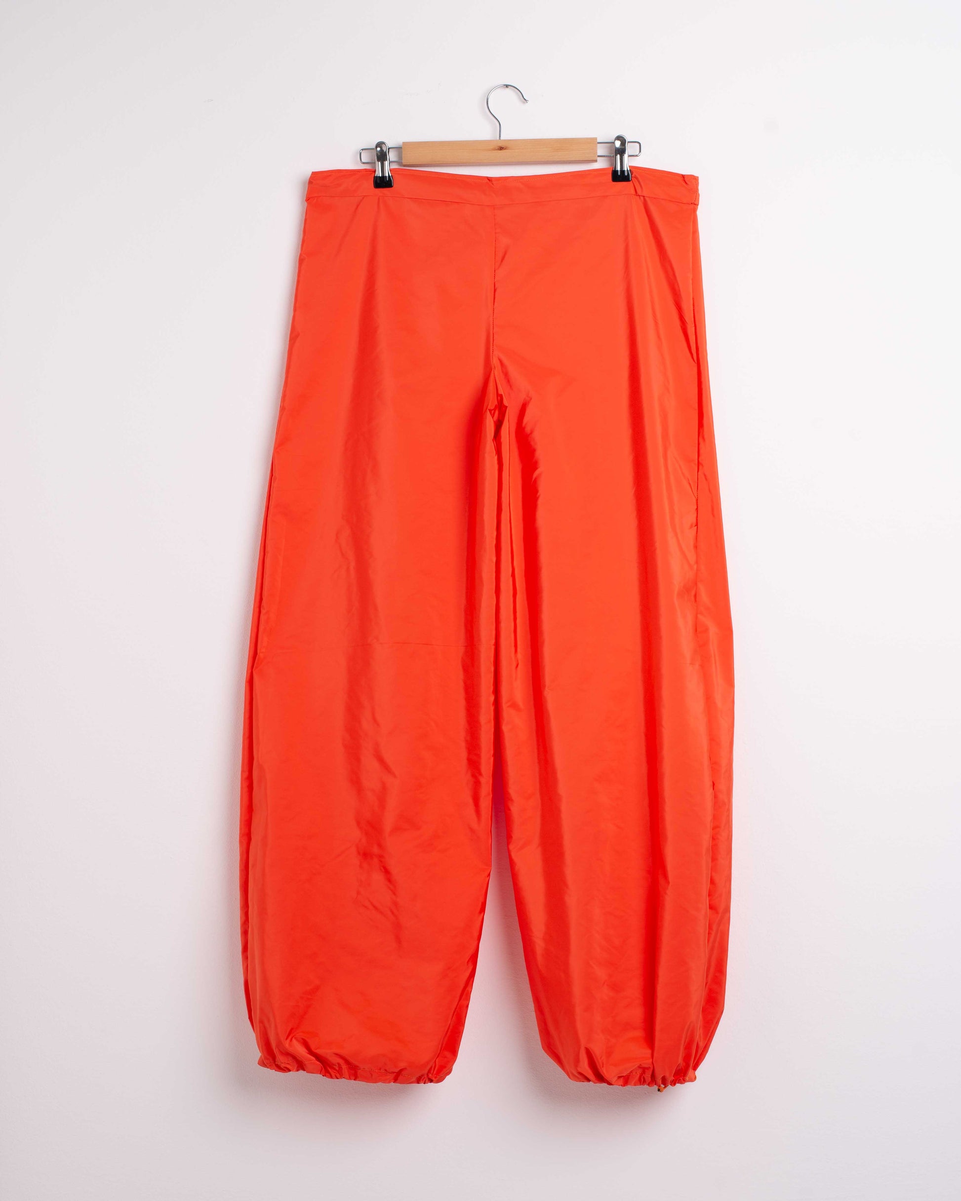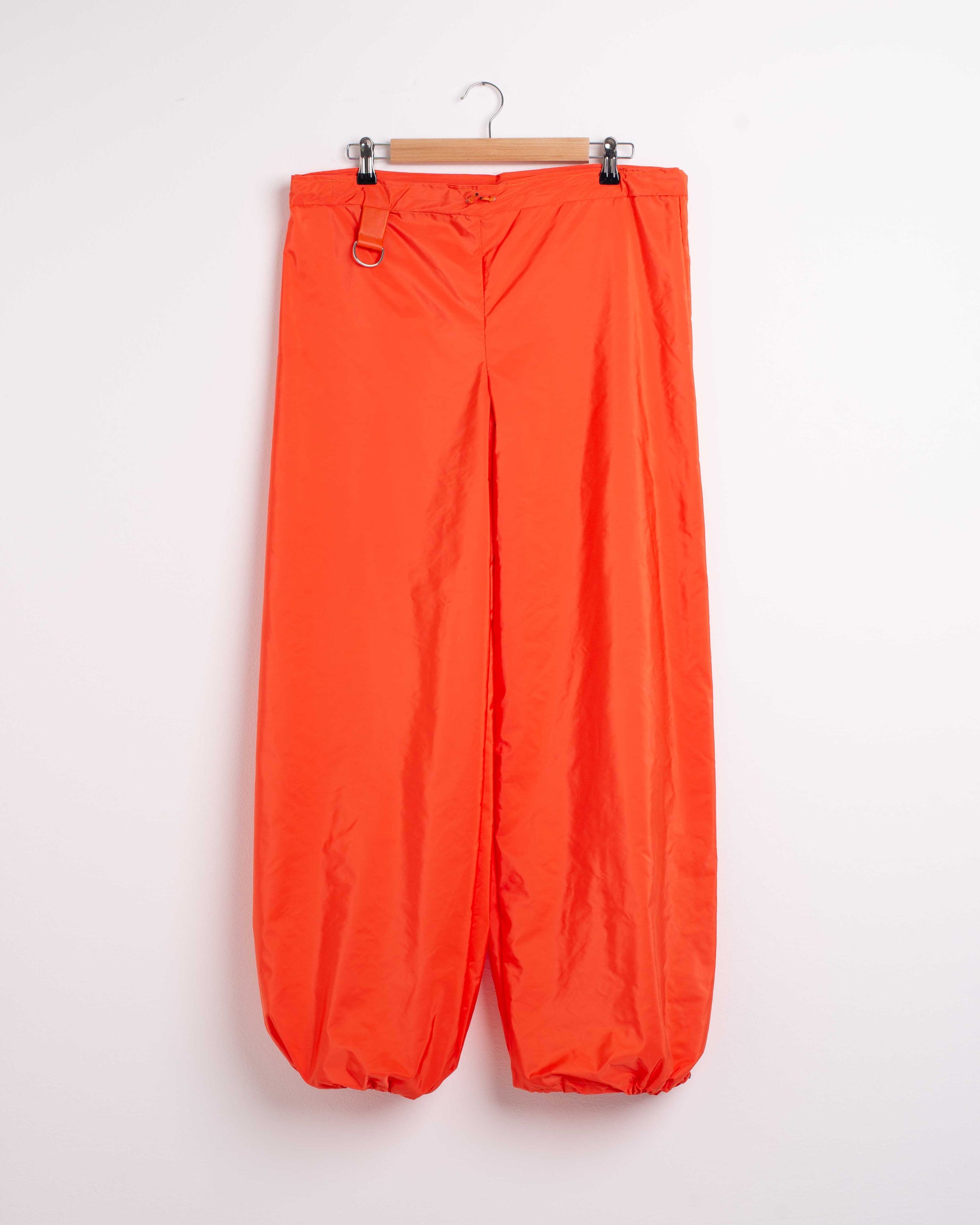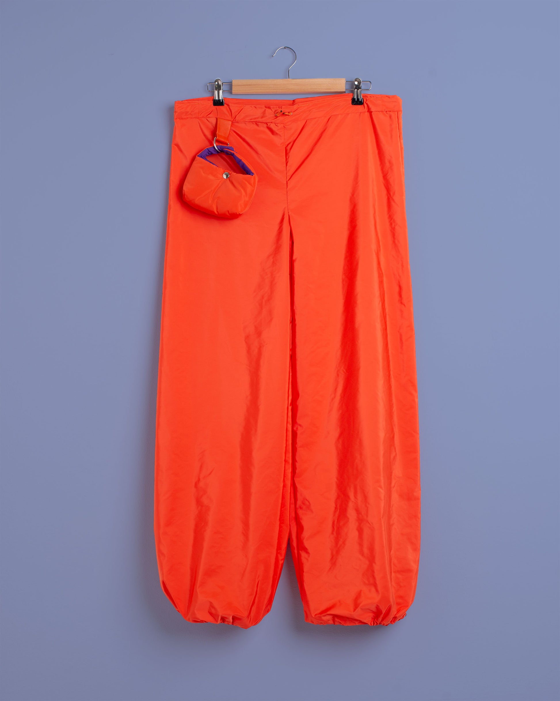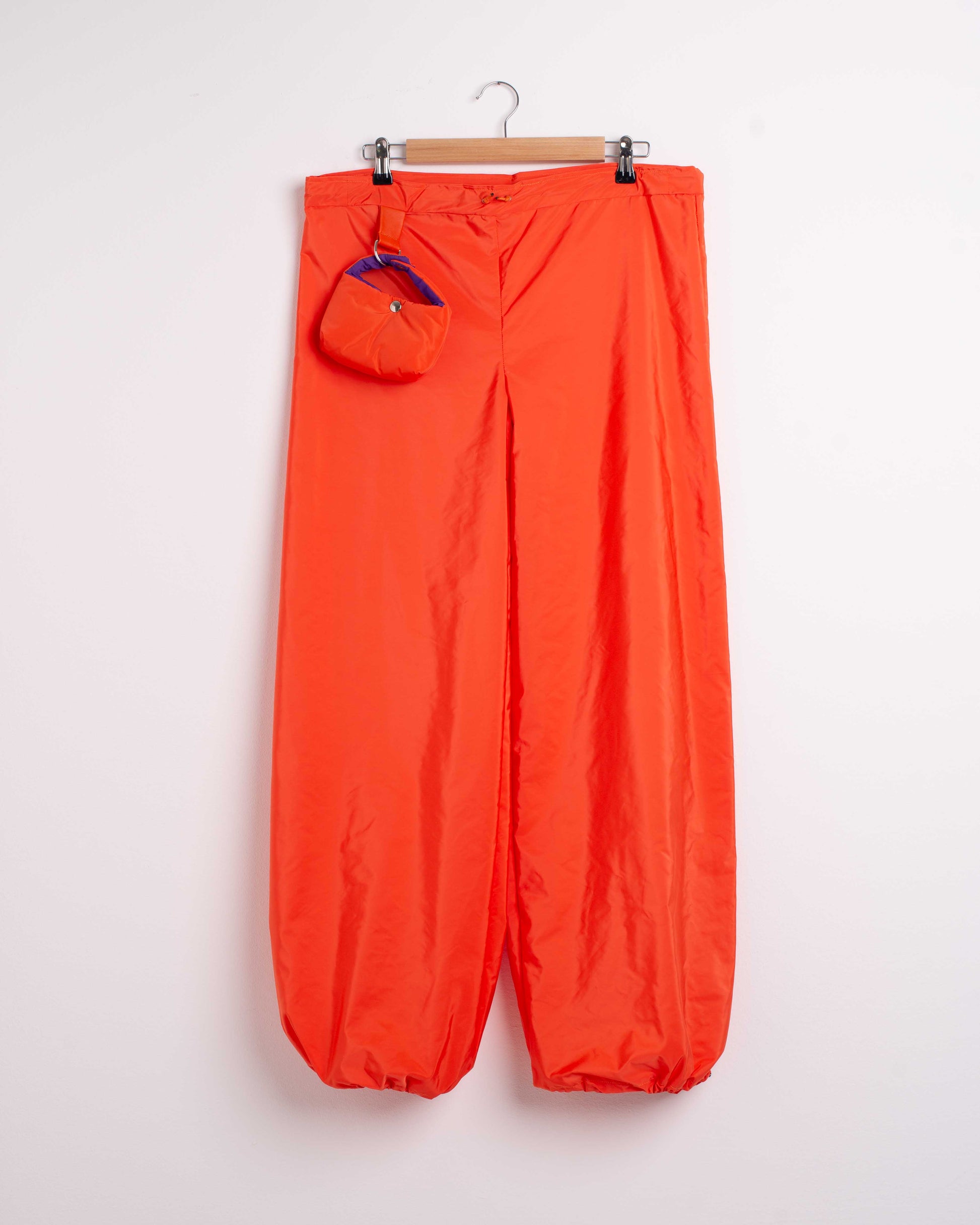 Pantaloni sportivi gonfi. Orlo e cintura con coulisse. Piccola Bag abbinata con dettaglio in pelle riciclata. Pelli pregiate al 100% provenienti da scarti di aziende italiane. Ogni pezzo è unico e realizzato a mano in Italia.