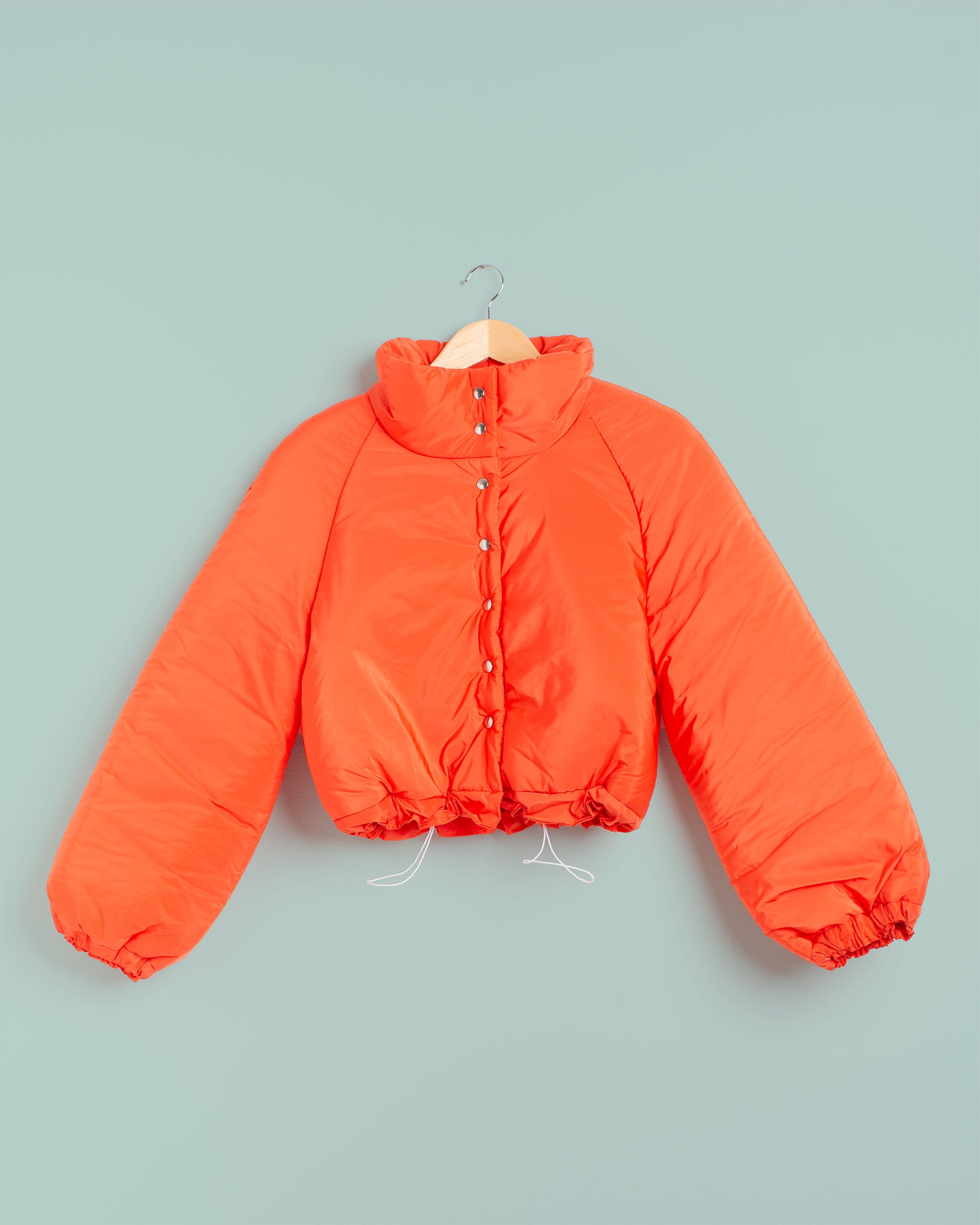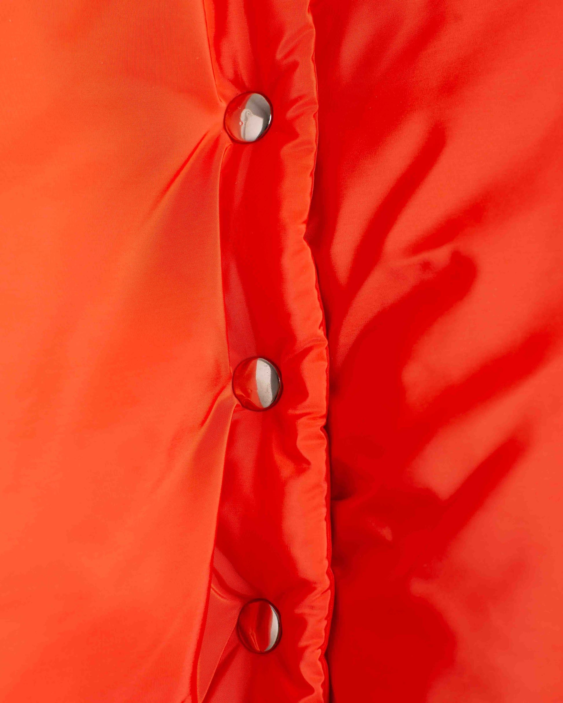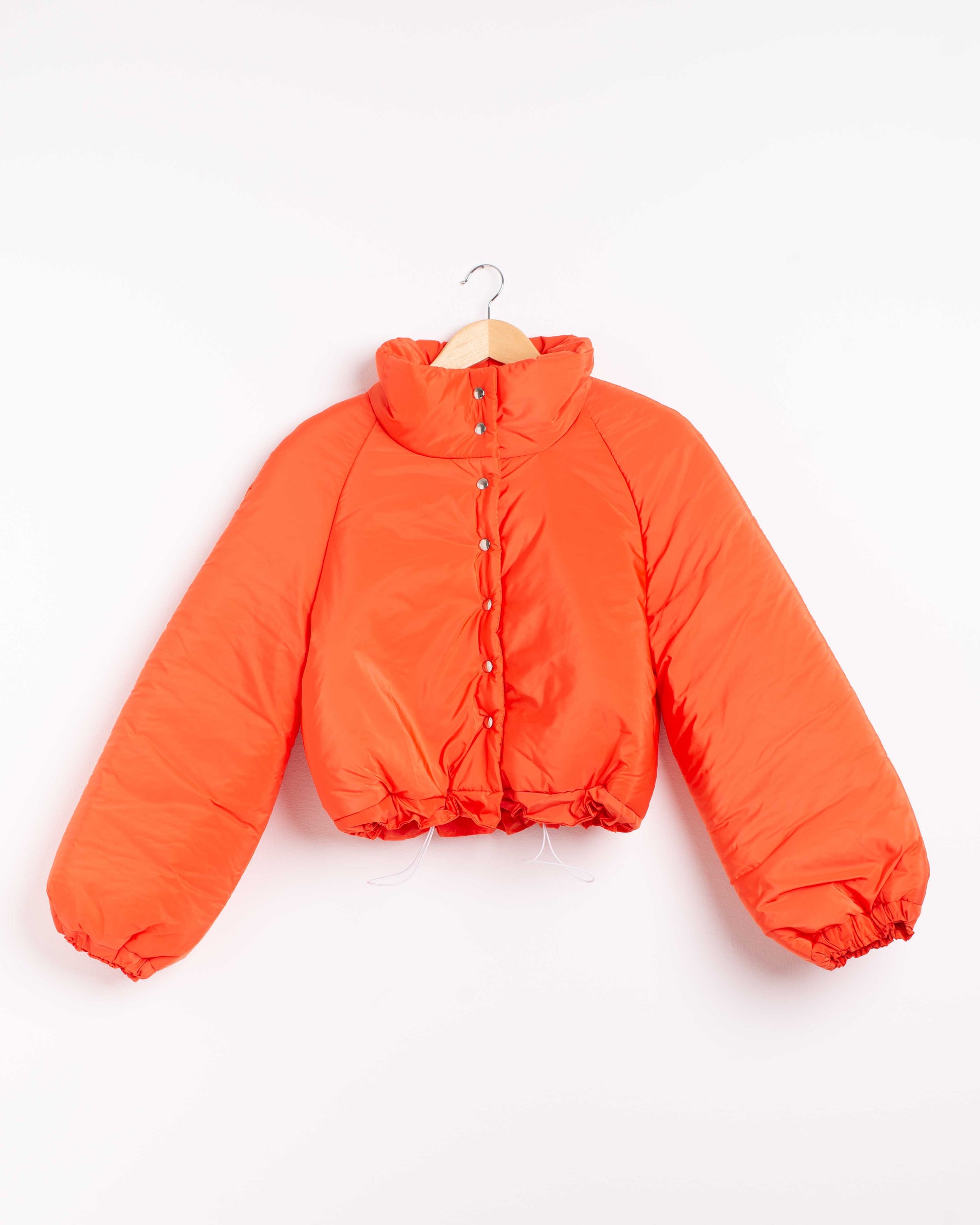 Piumino dalla silhouette squadrata e pomposa. Chiusura con bottoni in metallo. Orlo e polsini con coulisse. Tasca interna. Maniche raglan.