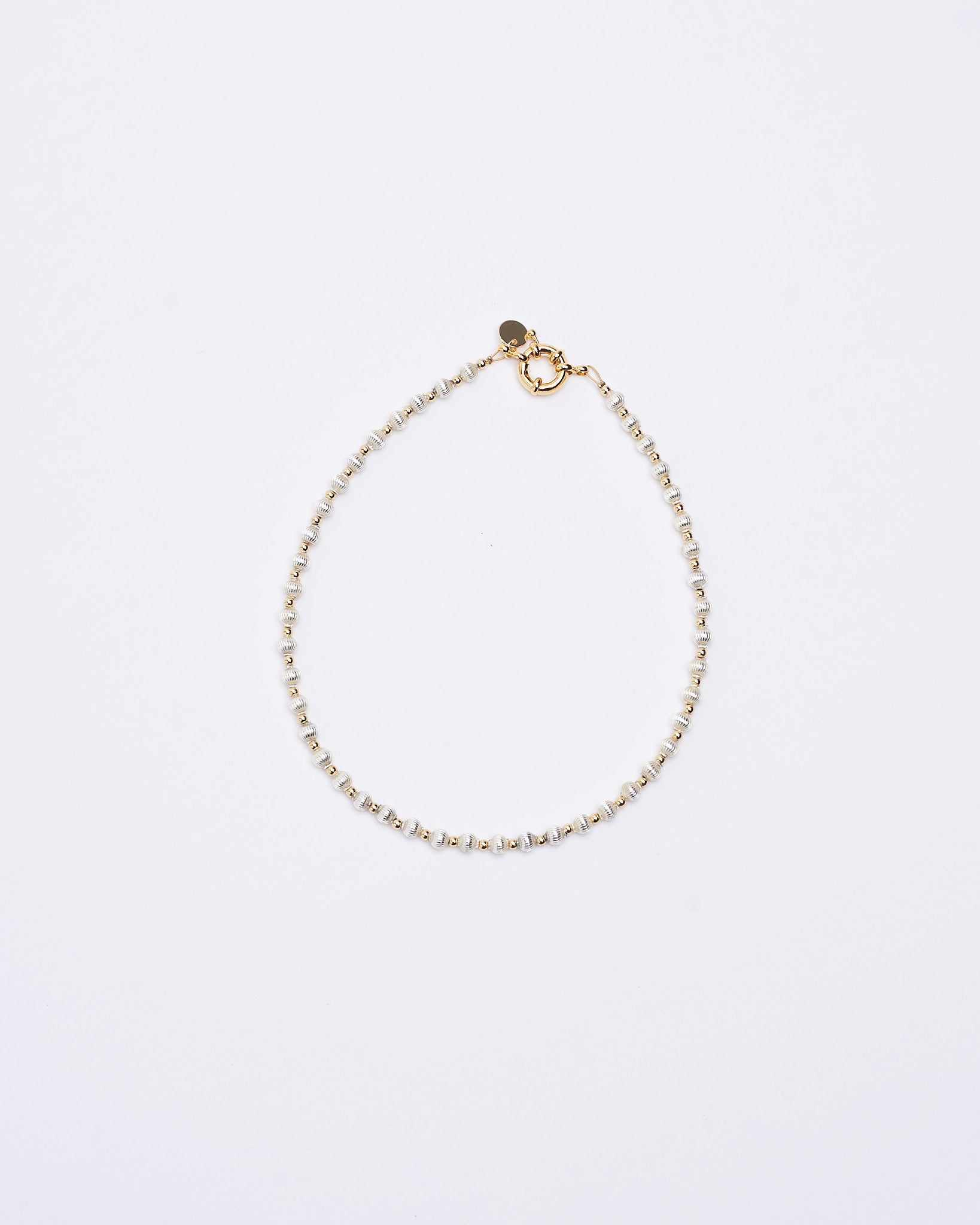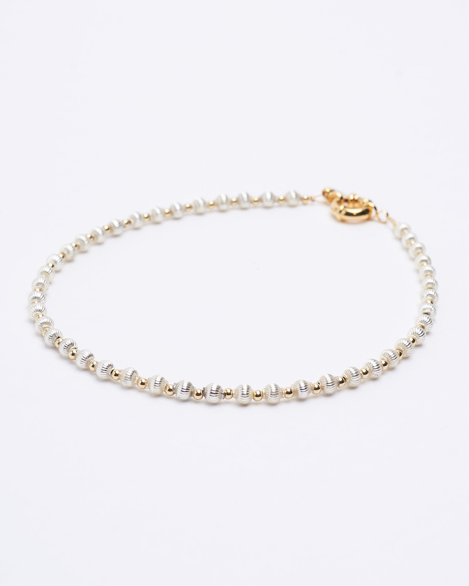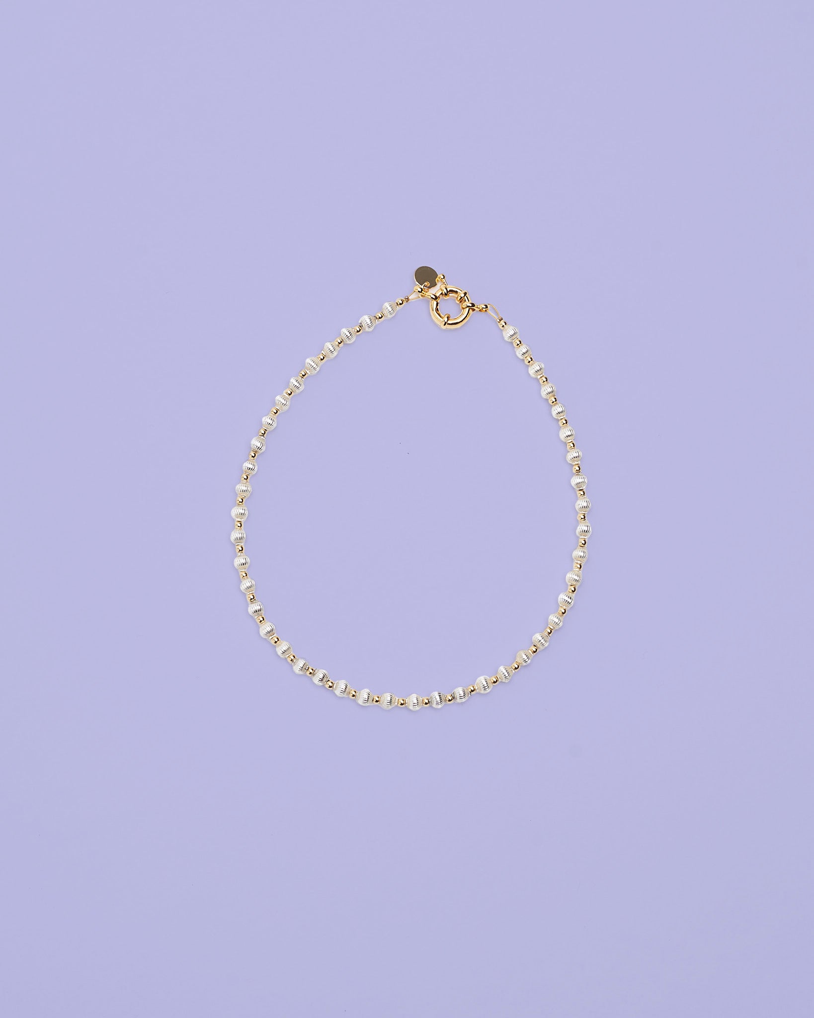 Collana handmade con perle in vetro soffiato argento, perle placcate oro e chiusura placcata oro.